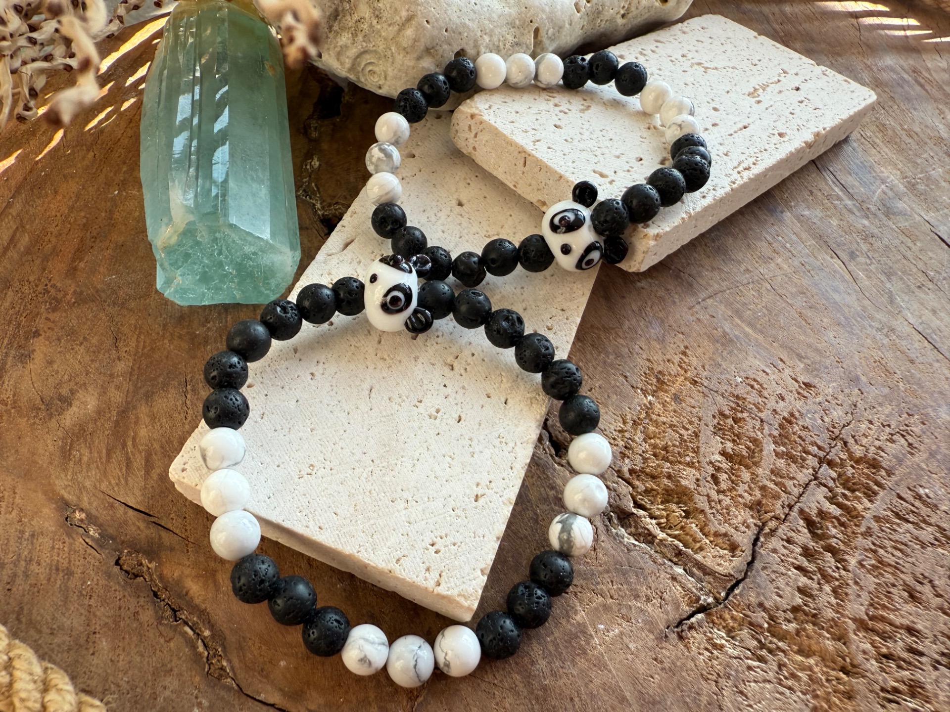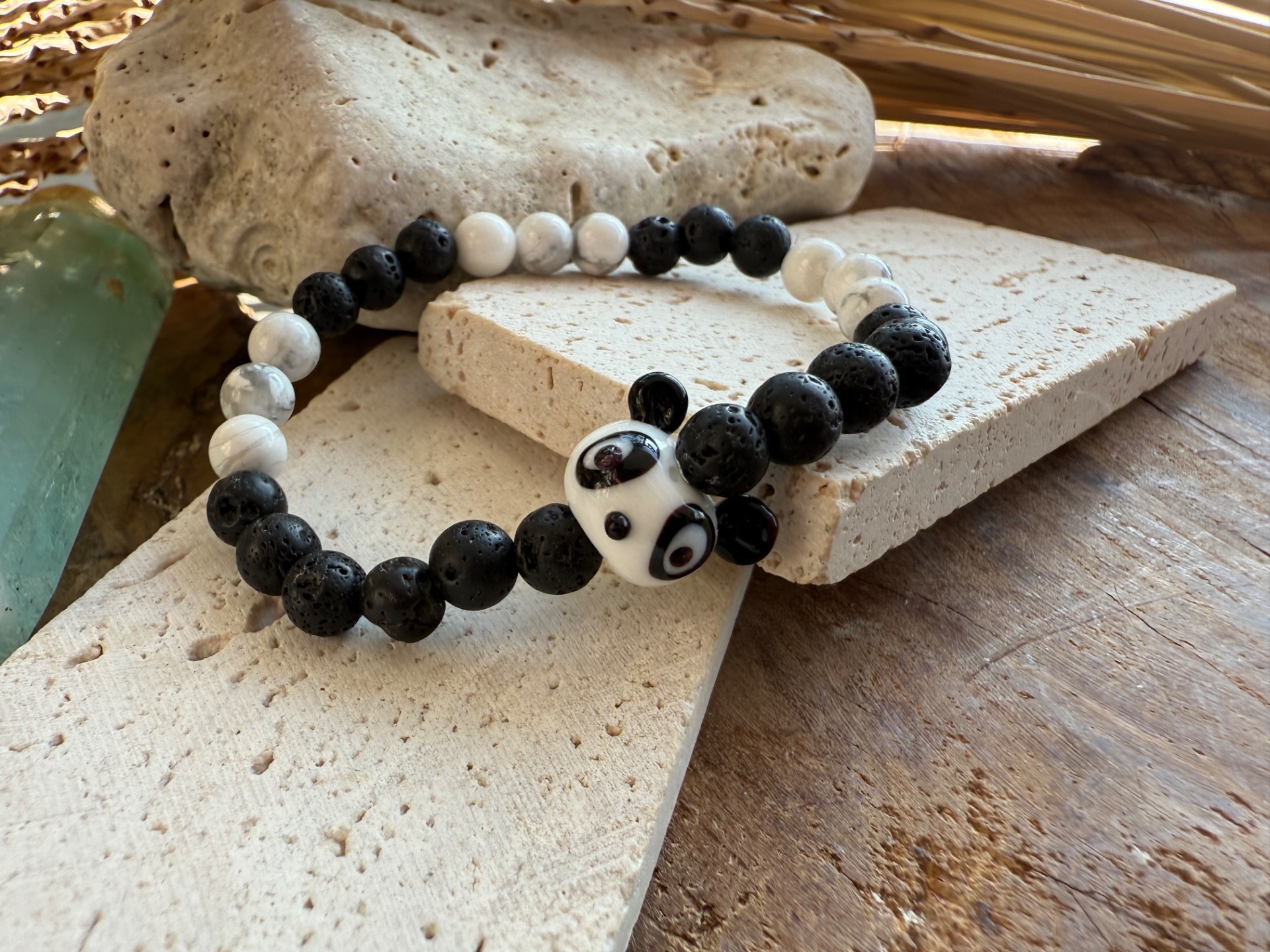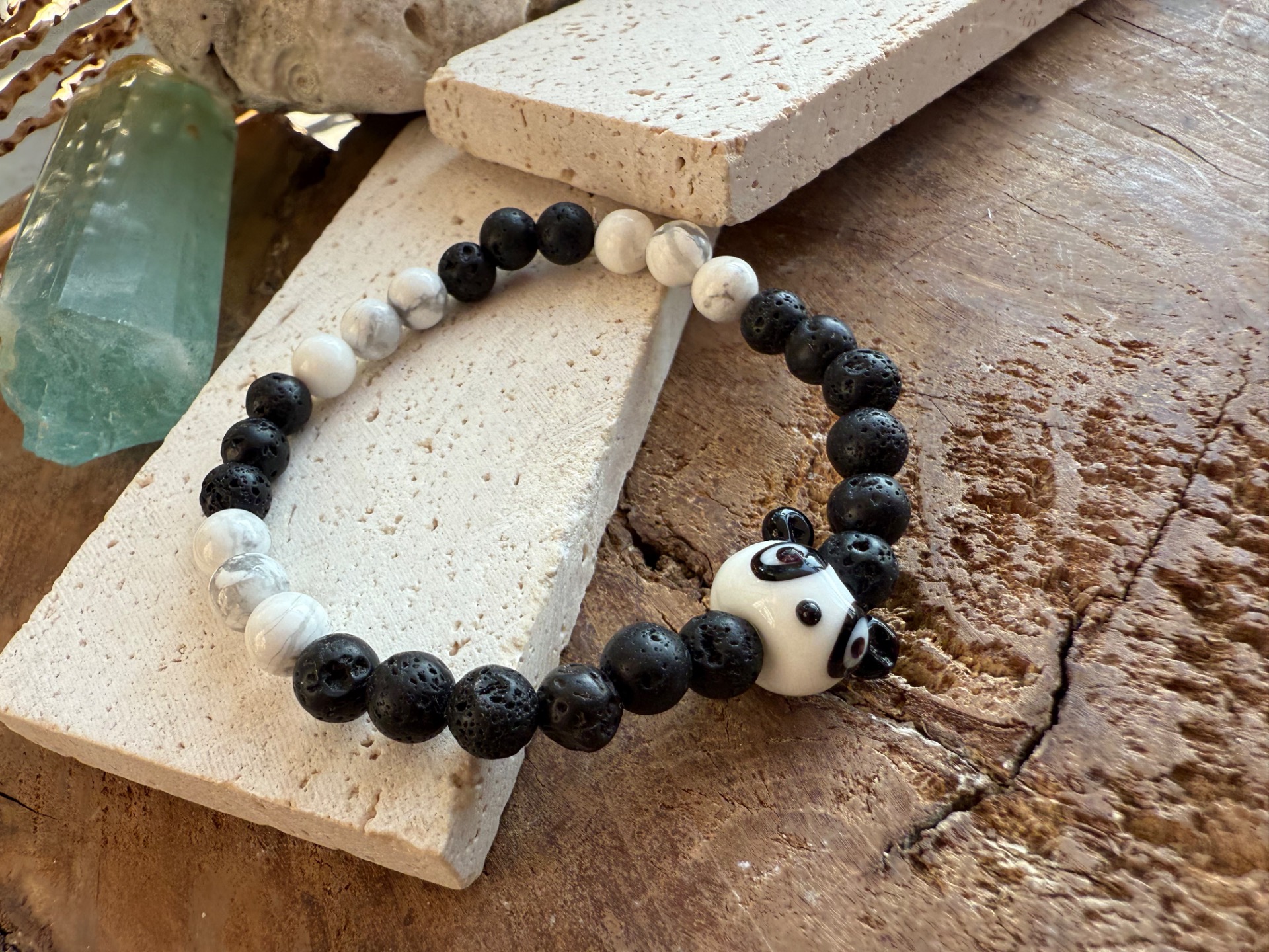 Hravý a zároveň harmonizujúci náramok z minerálov láva a magnezit, doplnený o sklenenú hlavu pandy, ktorá dodáva šperku jemný a milý charakter.