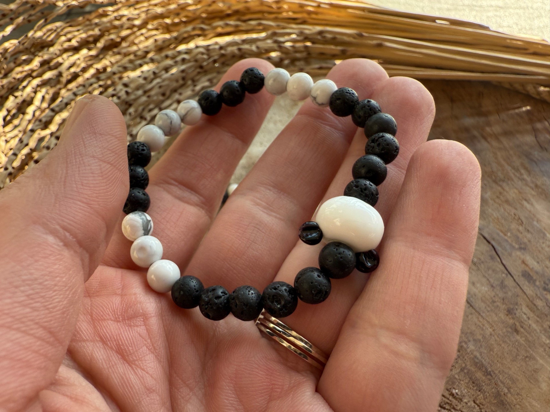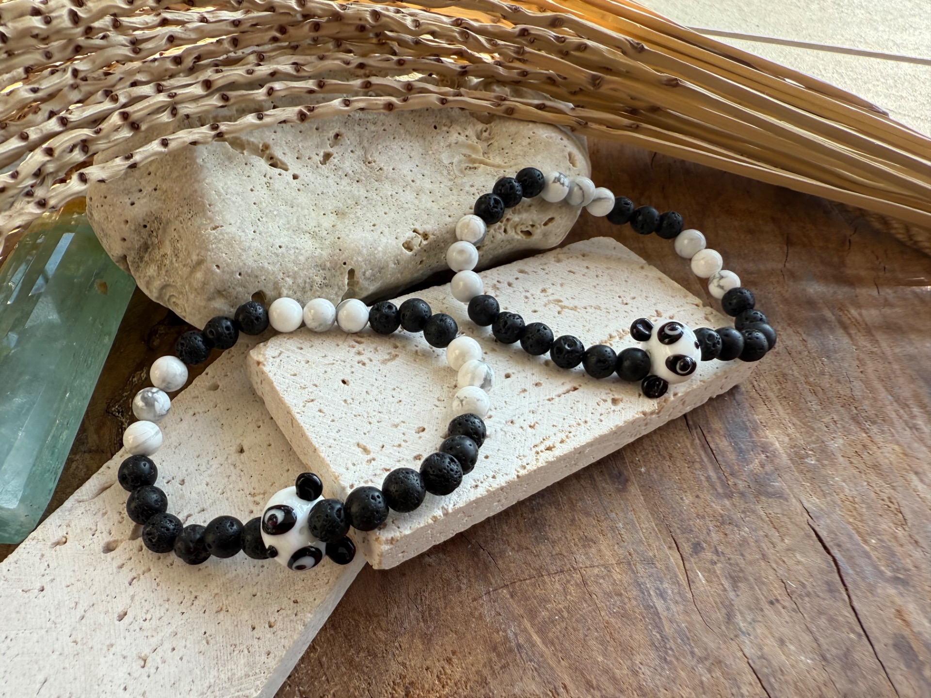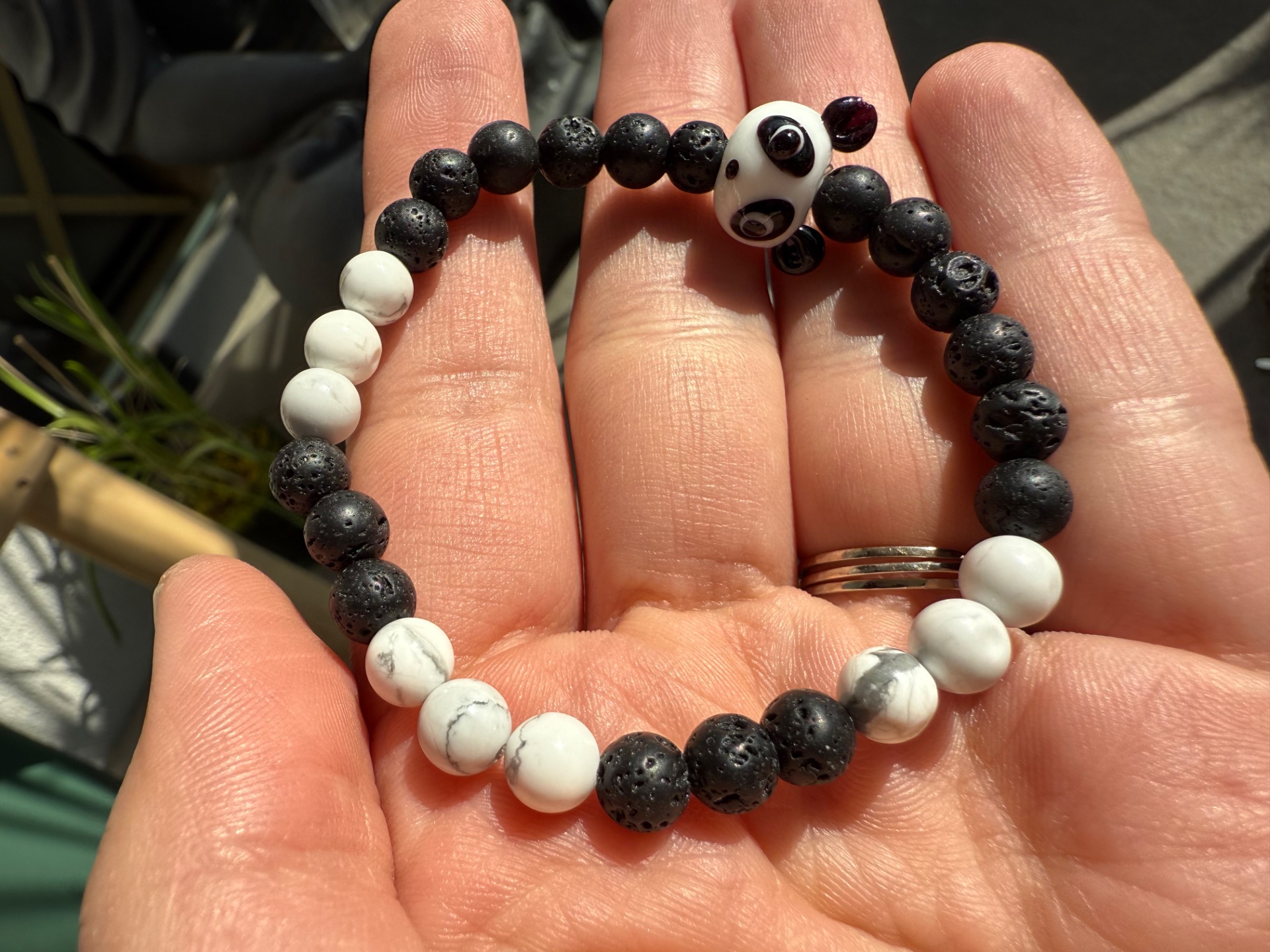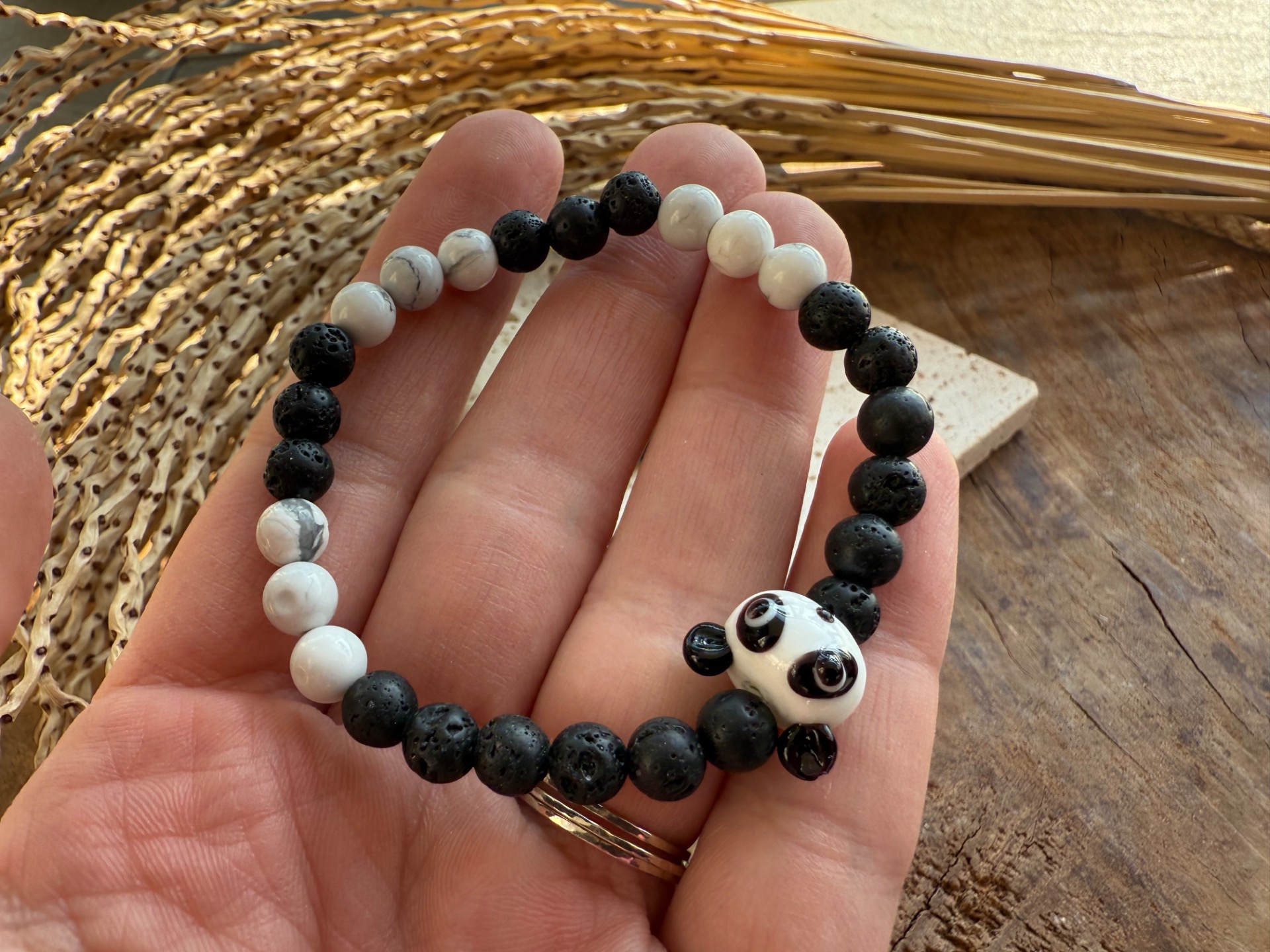 Hravý a zároveň harmonizujúci náramok z minerálov láva a magnezit, doplnený o sklenenú hlavu pandy, ktorá dodáva šperku jemný a milý charakter.
