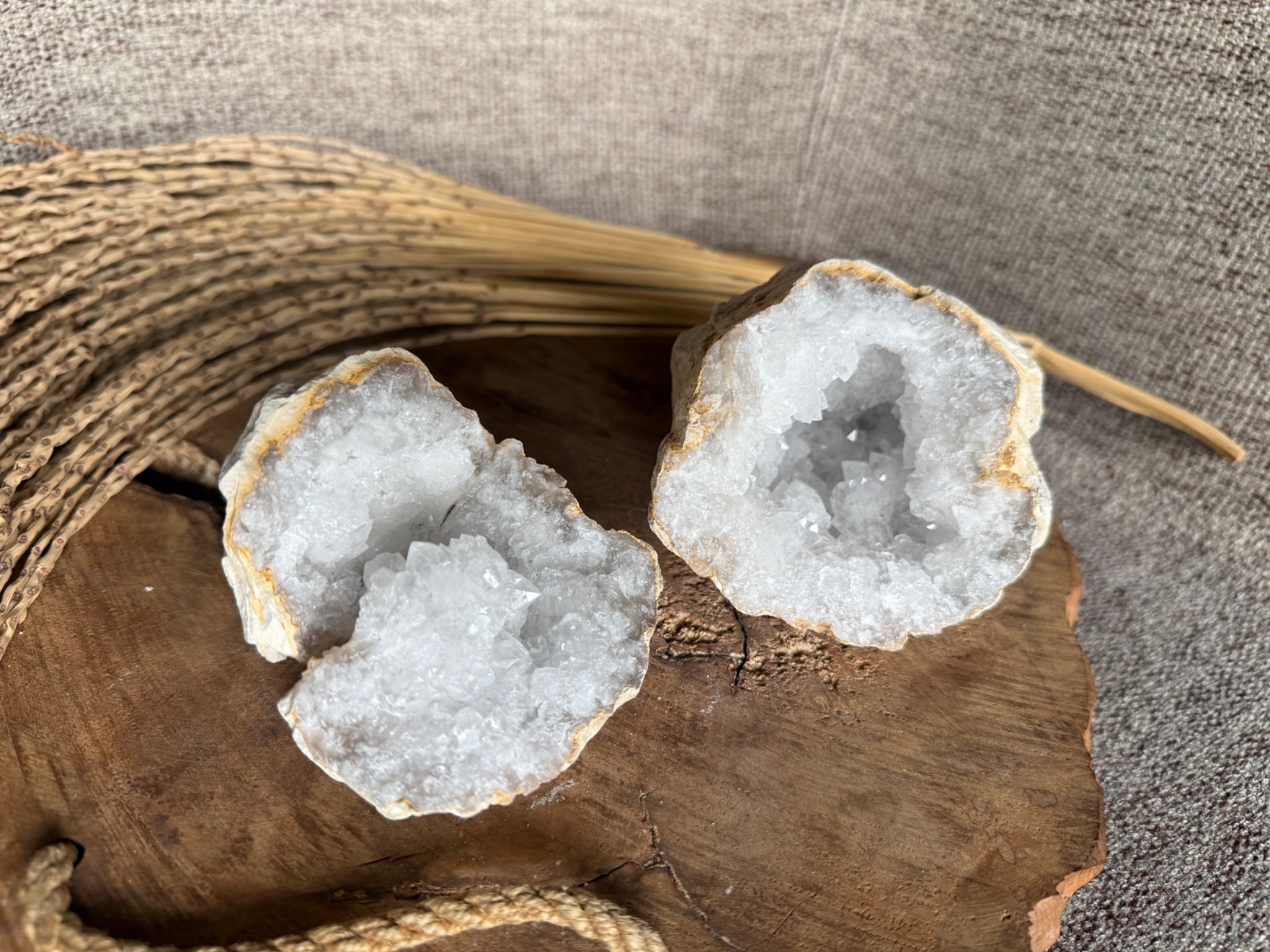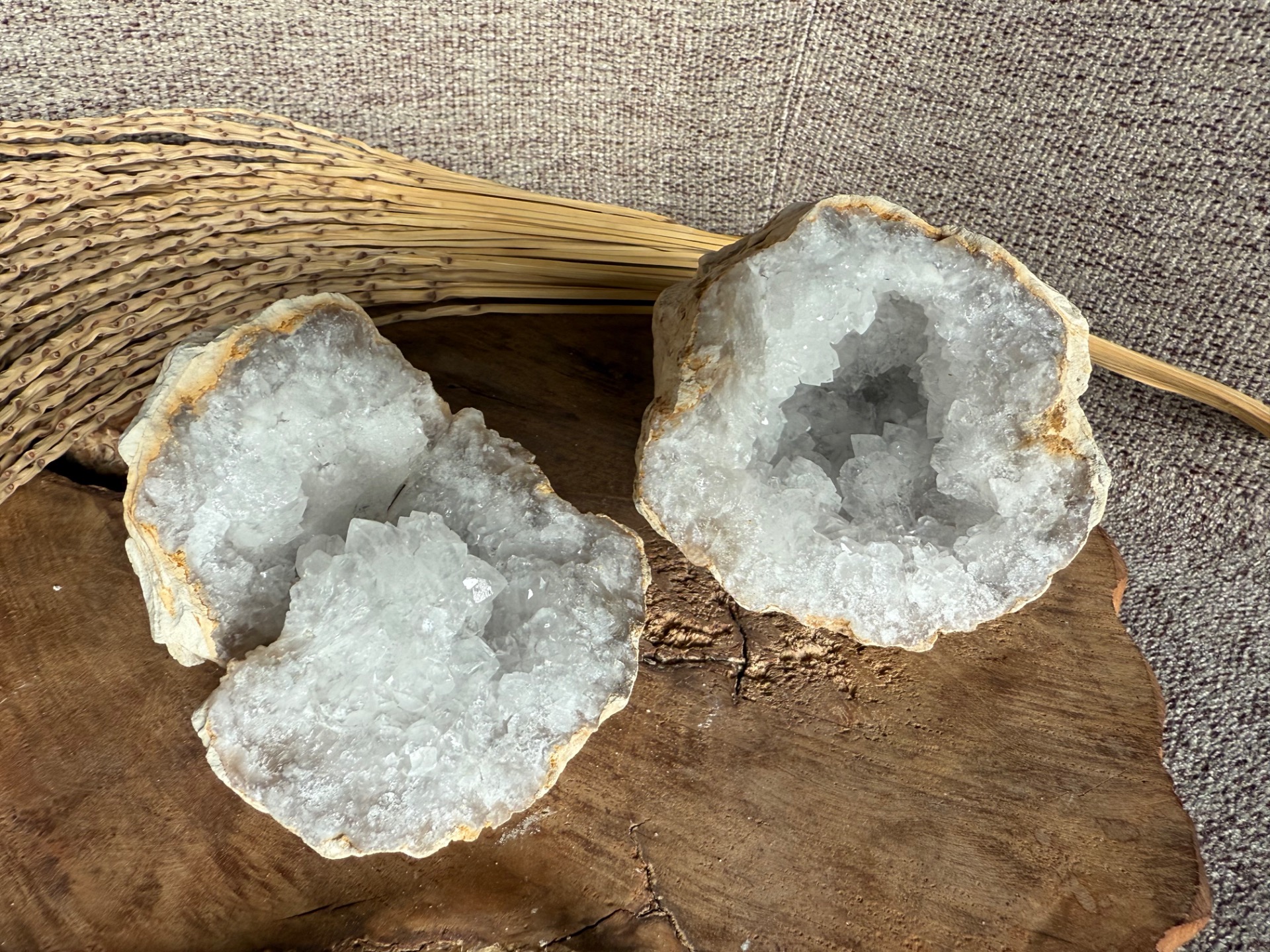 Tieto párové krištáľové geodky – Esencia čistoty sú ideálne pre harmonizáciu priestoru, meditácie, spirituálnu prácu a zároveň slúžia ako nádherný a jedinečný dekoratívny pár.