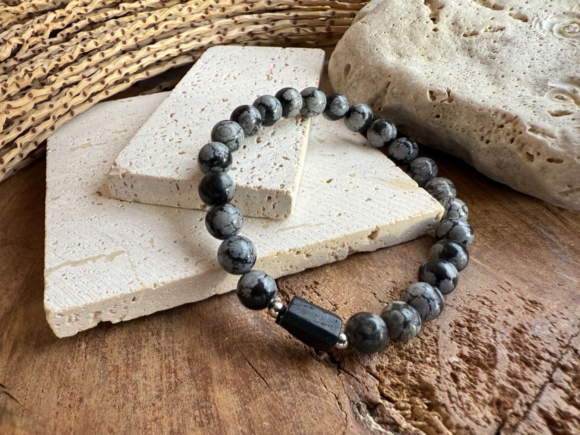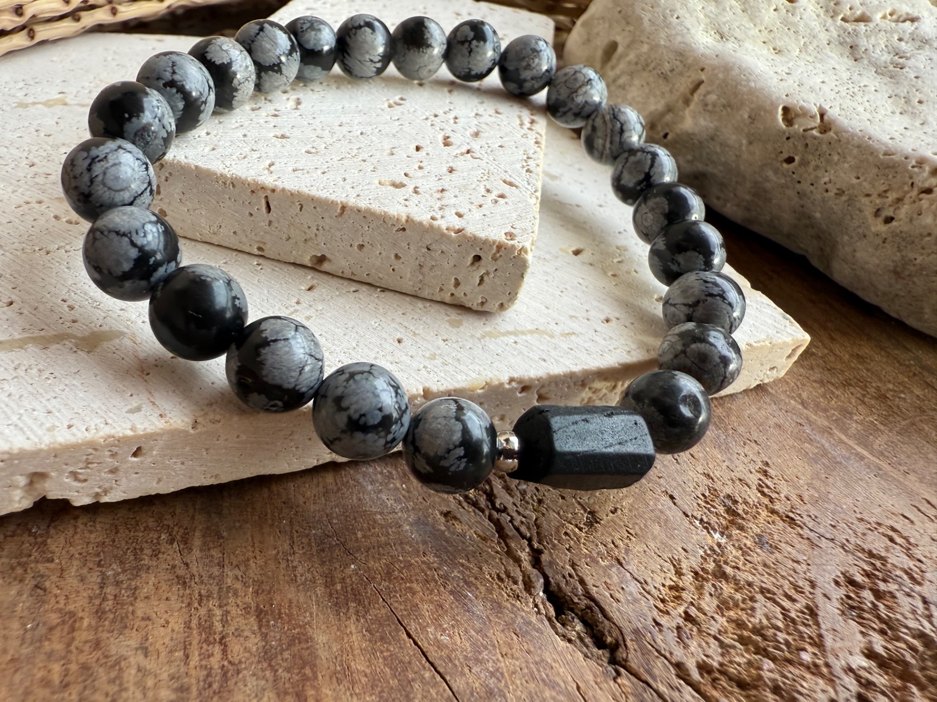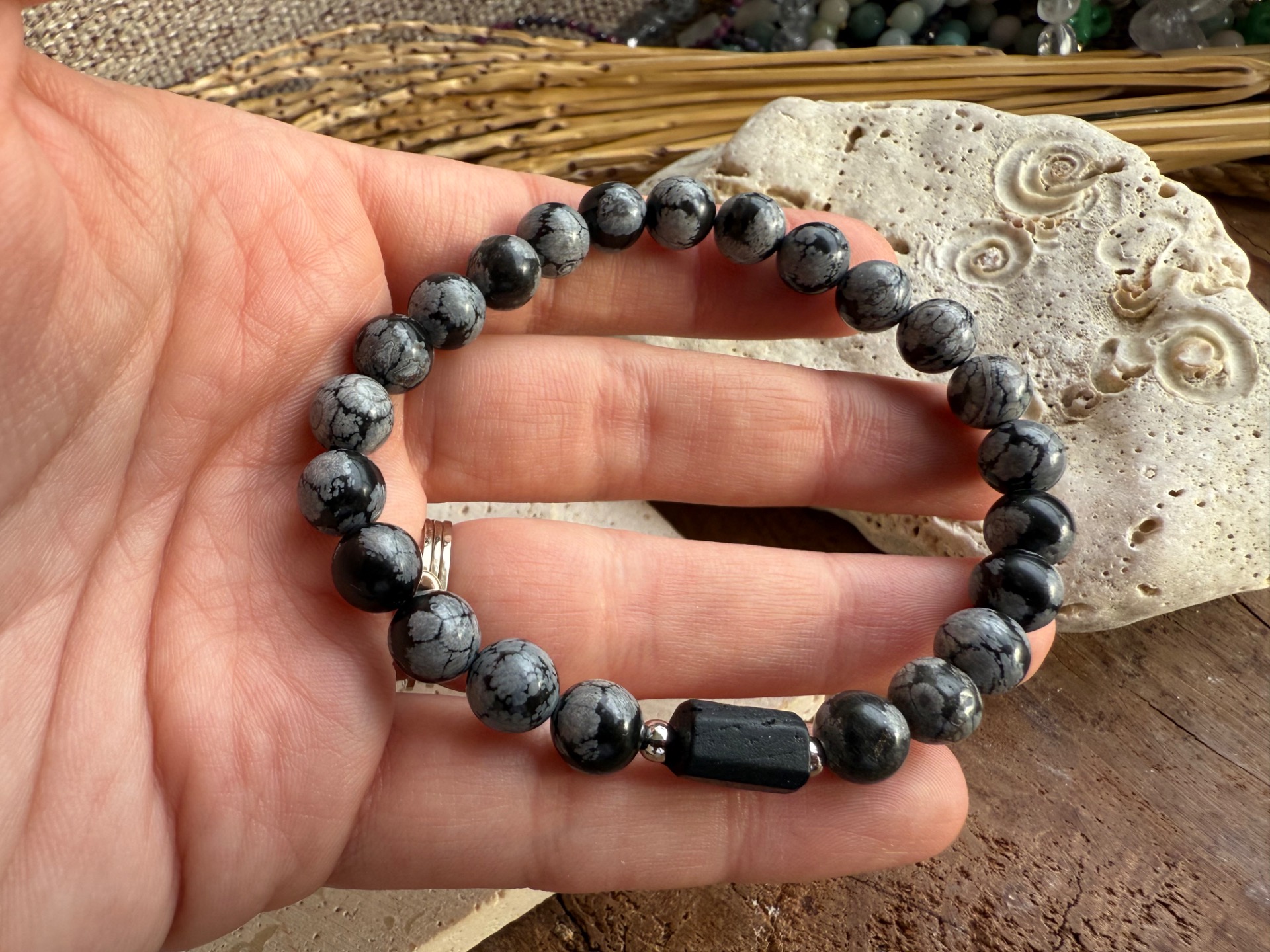 - Obsidián vločkový (8 mm) – prináša vnútornú stabilitu, odstraňuje negatívnu energiu a podporuje sebapoznanie.