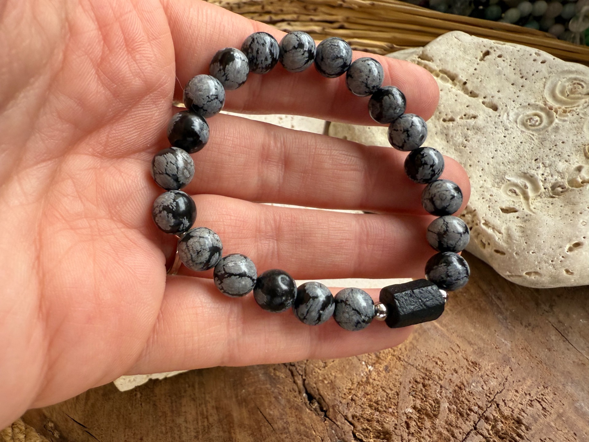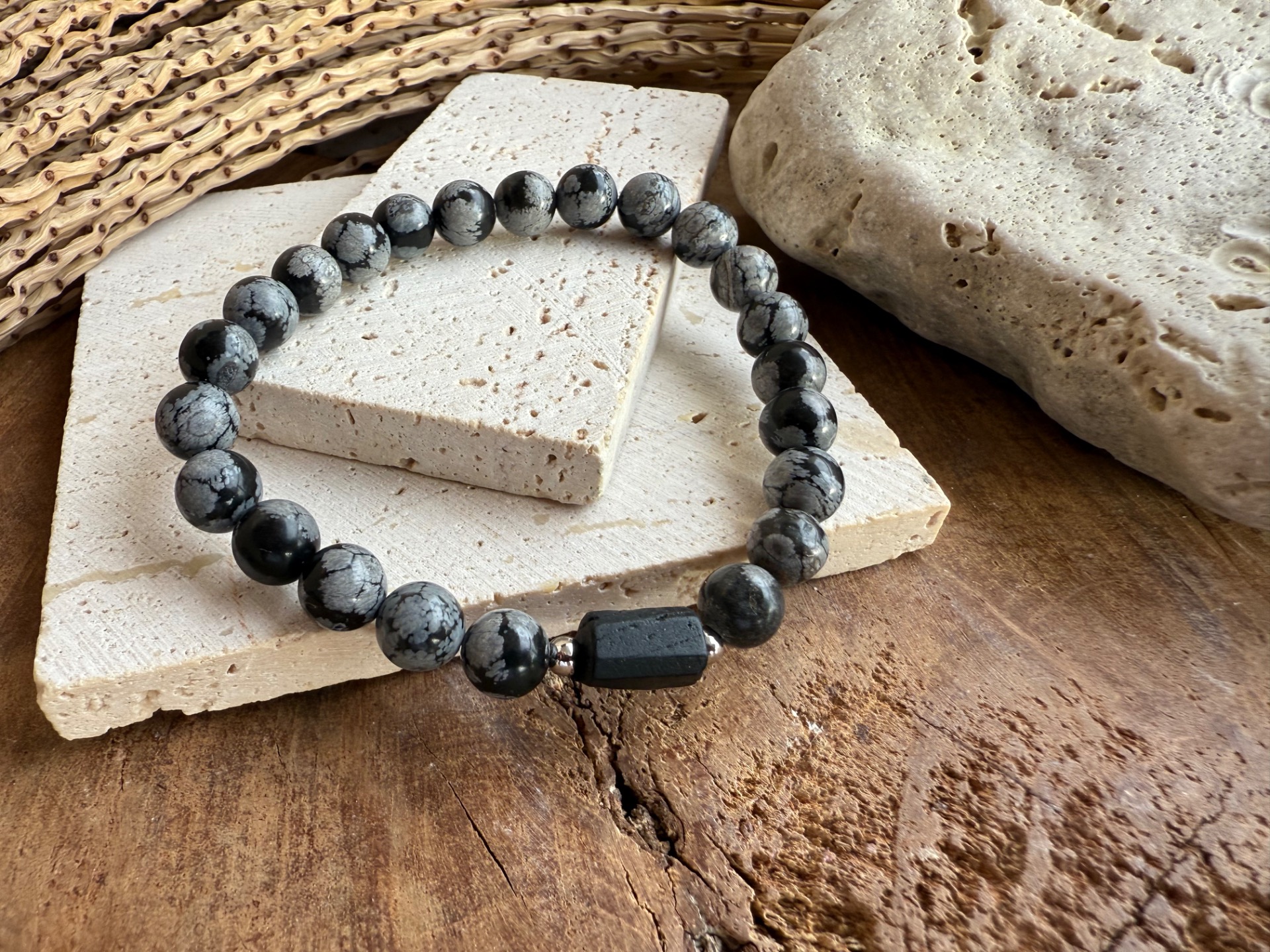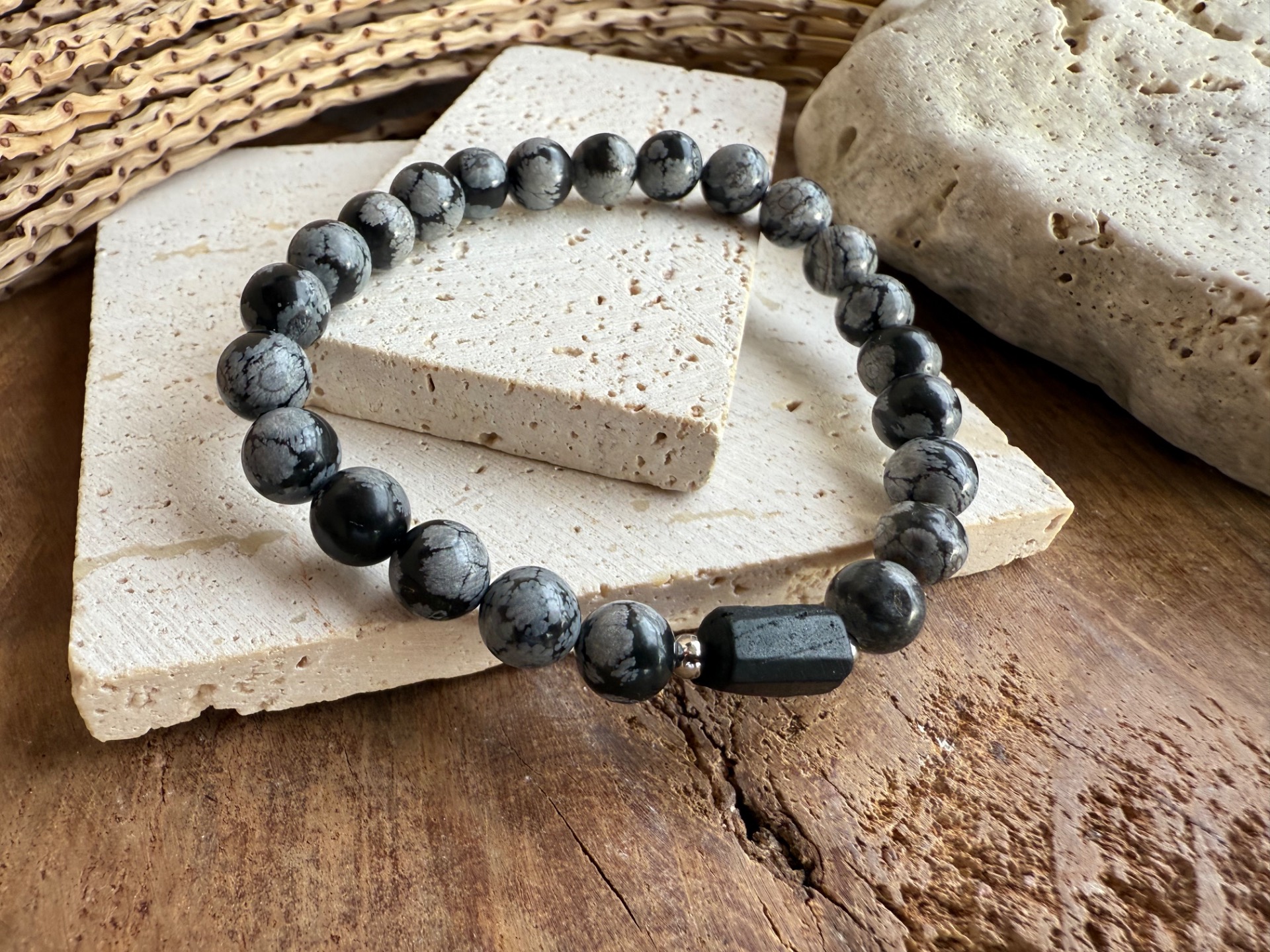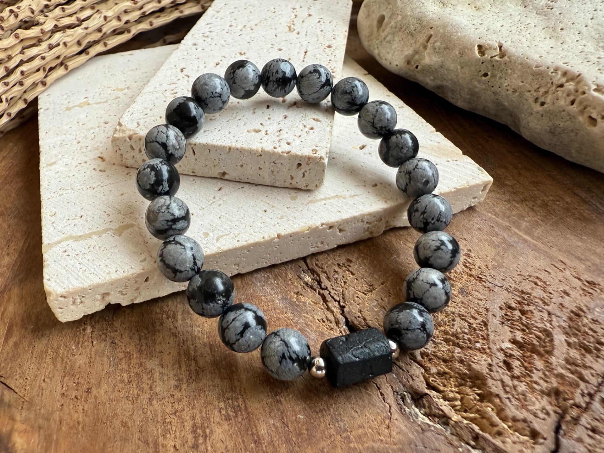 - Obsidián vločkový (8 mm) – prináša vnútornú stabilitu, odstraňuje negatívnu energiu a podporuje sebapoznanie.