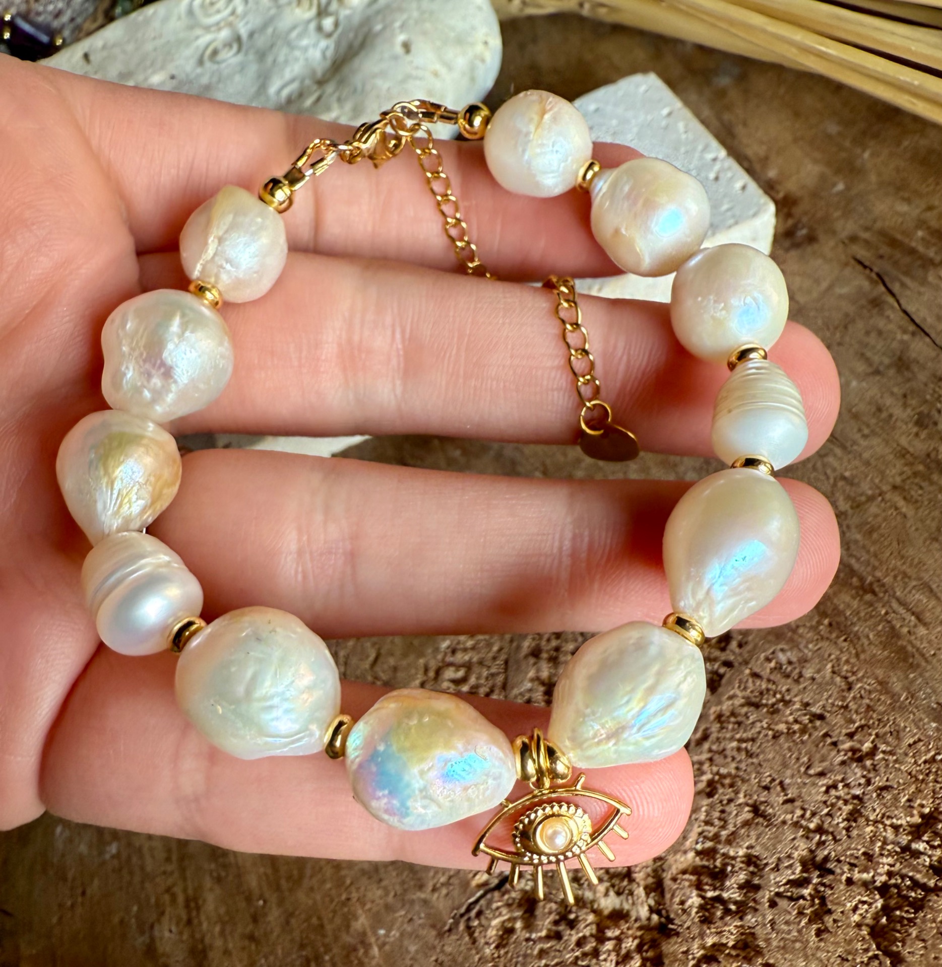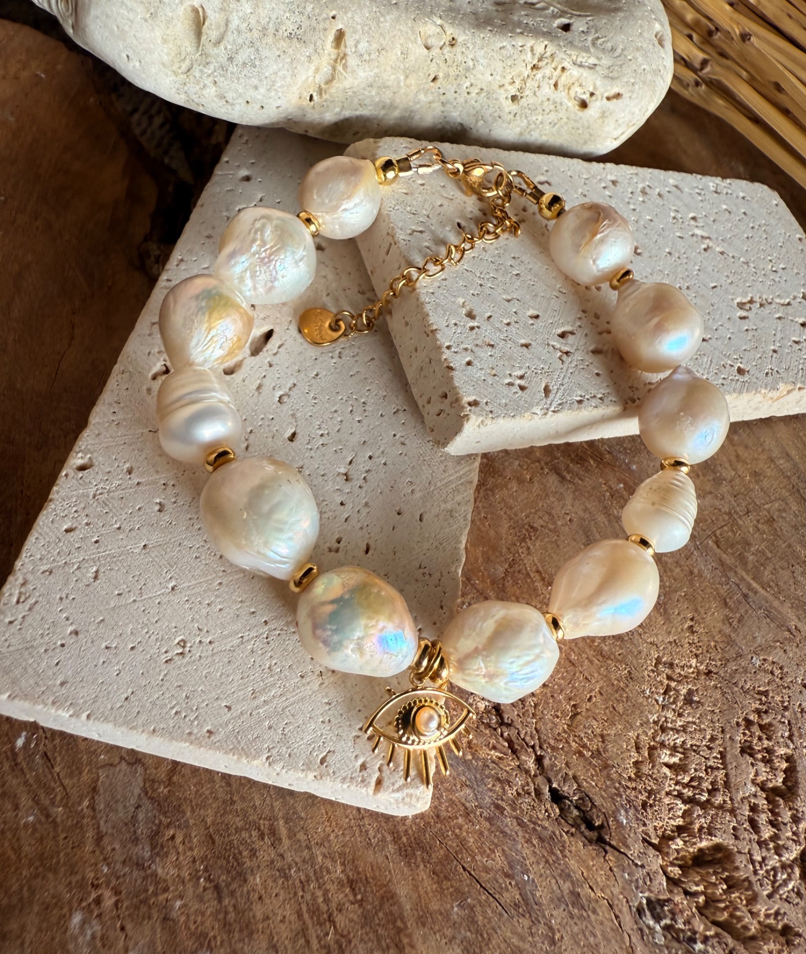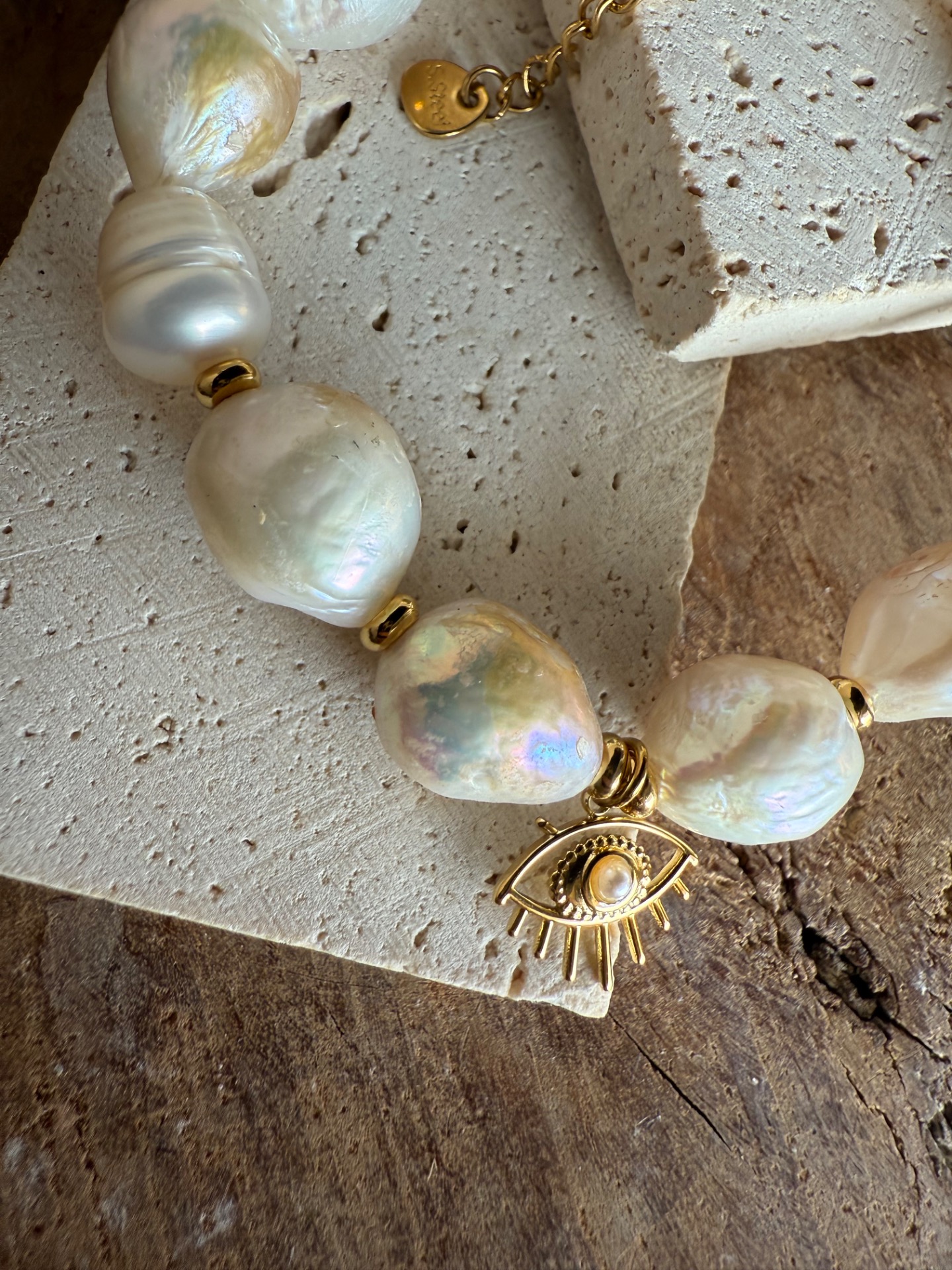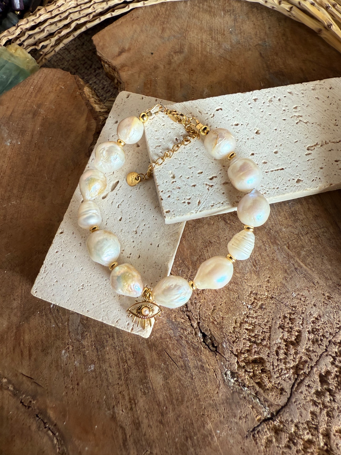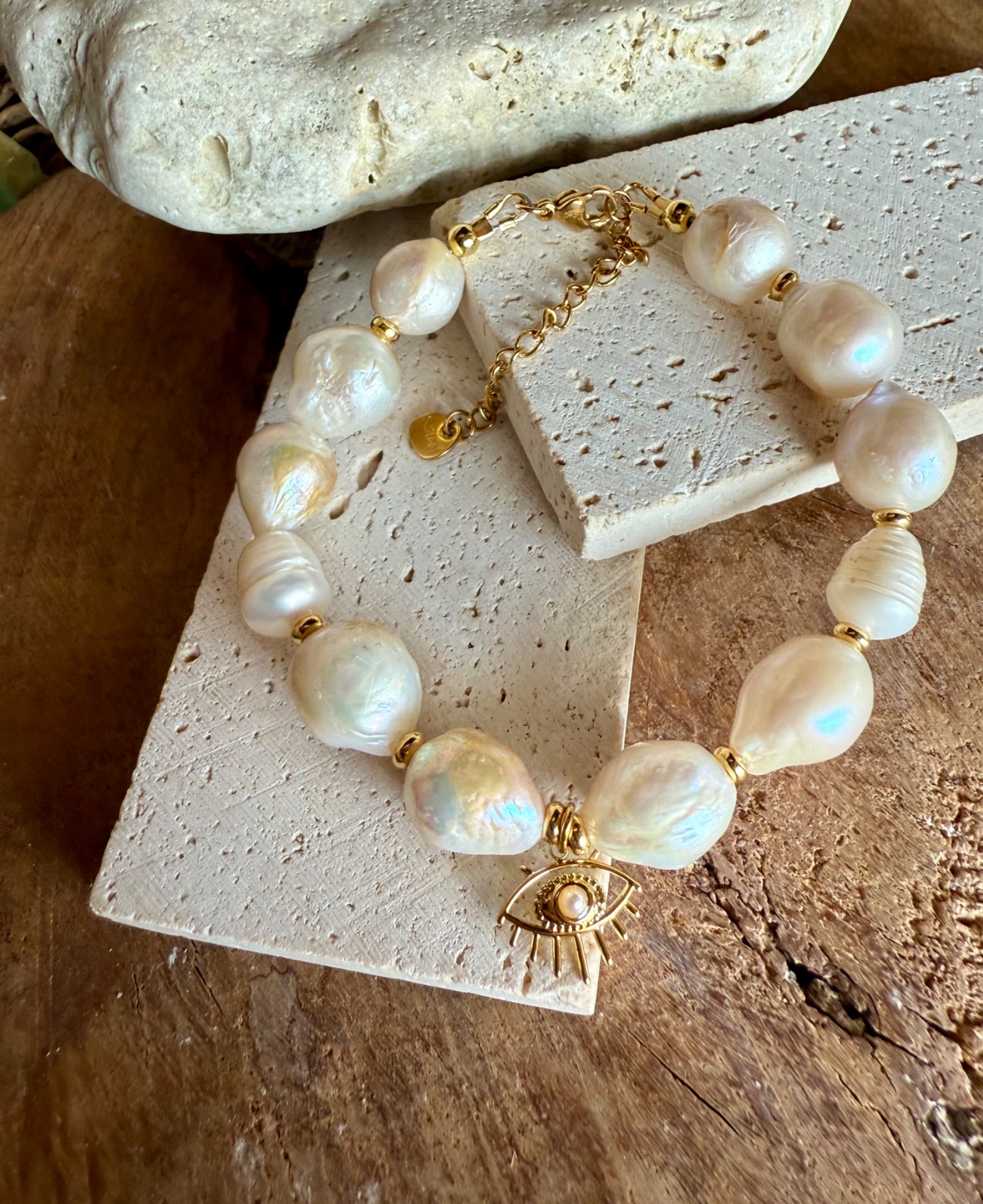 Objav nadčasovú eleganciu s týmto luxusným náramkom z barokových perál. Každá perla je unikátna, nepravidelná a doplnená príveskom oka s malou perlou v strede, ktorý symbolizuje ochranu a jasnosť. Zapínanie je 14k gold plated a súčasťou je praktická 5 cm predlžovacia retiazka, aby sa náramok dokonale prispôsobil tvojej ruke. Ideálne na denné nosenie aj špeciálne príležitosti.