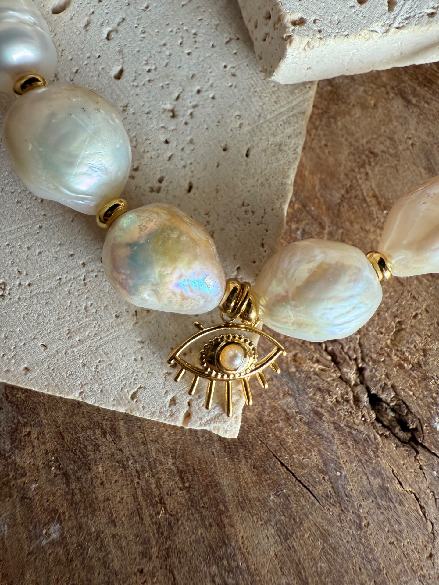 Rozmery: ručne vyrobený, nepravidelné barokové perly, zapínanie 14k gold plated, doplnený príveskom oka s malou perlou v strede, 17cm +5 cm predlžovacia retiazka