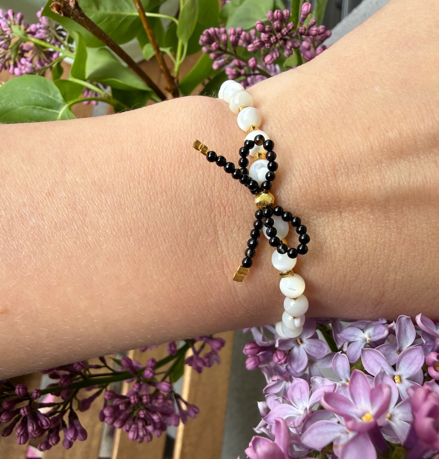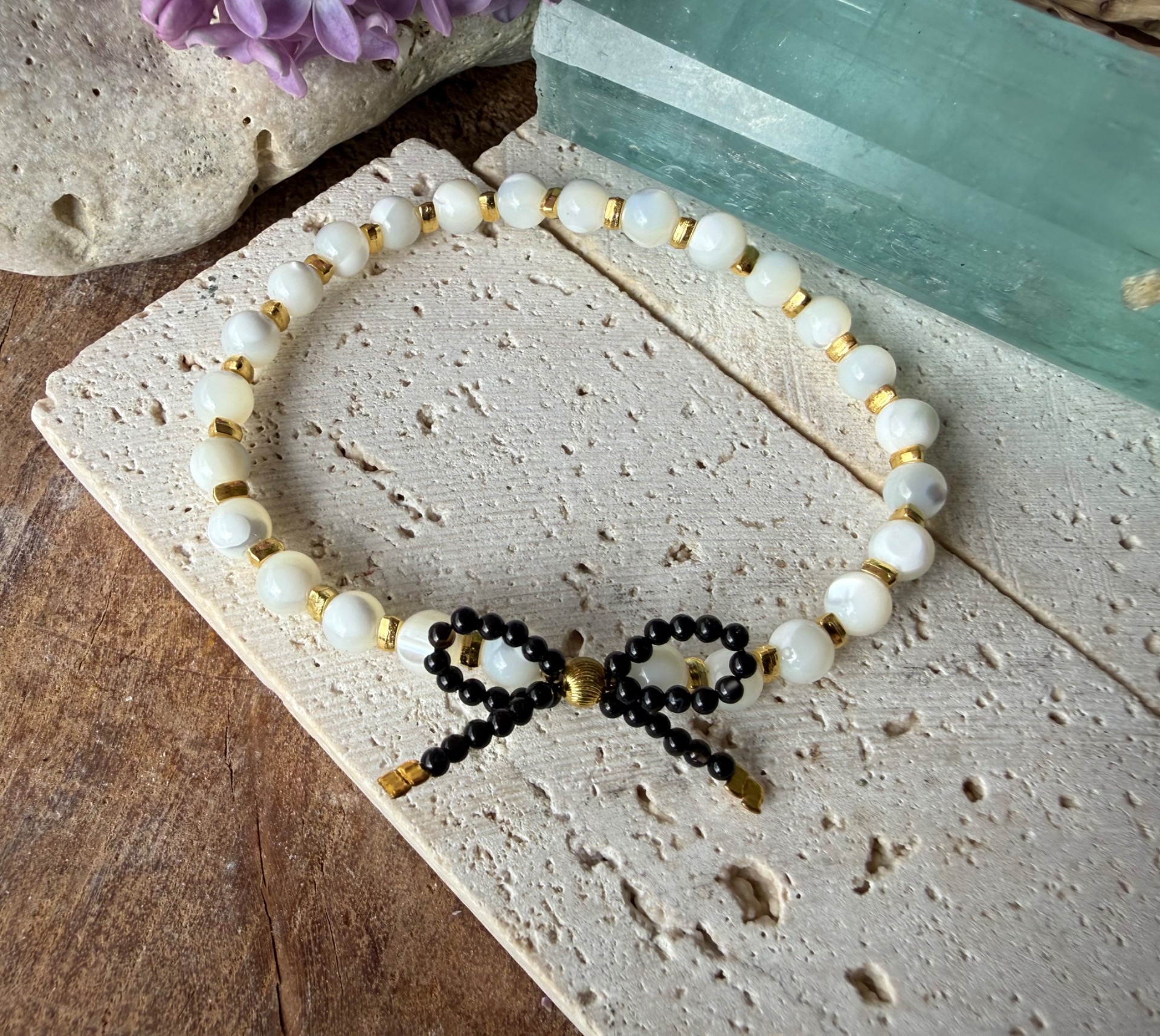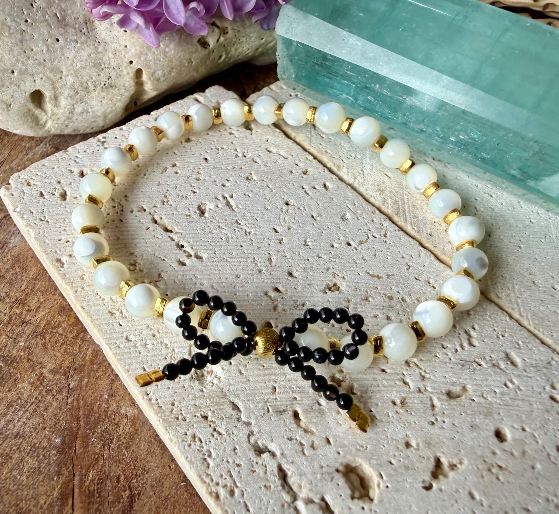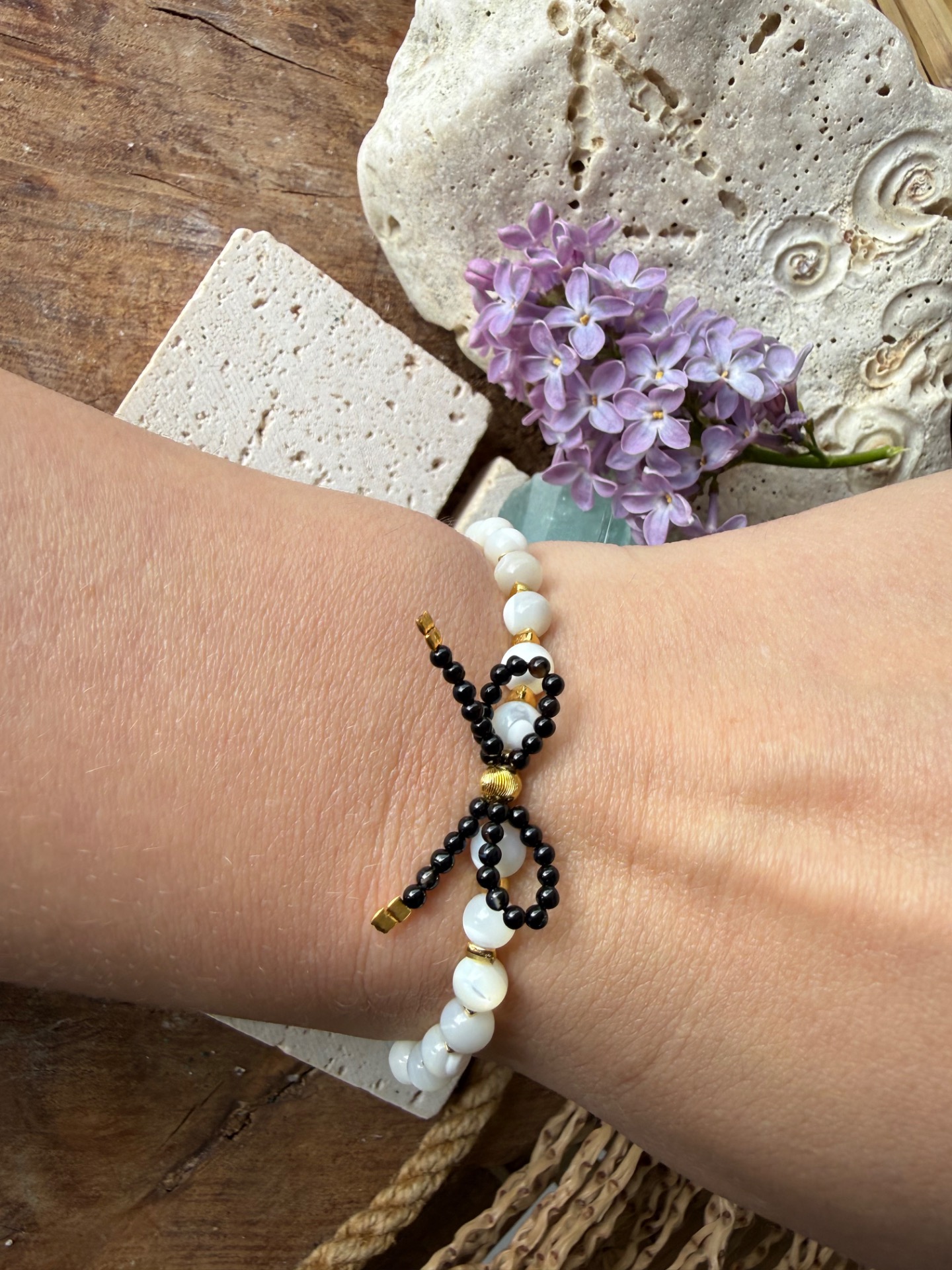 Tento výrazný a zároveň elegantný náramok spája jemnú svetlosť perlete s hlbokým, kontrastným detailom mašličky z onyxu. Pôsobí vyvážene, sebavedomo a nadčasovo – ako spojenie jemnosti a vnútornej sily.