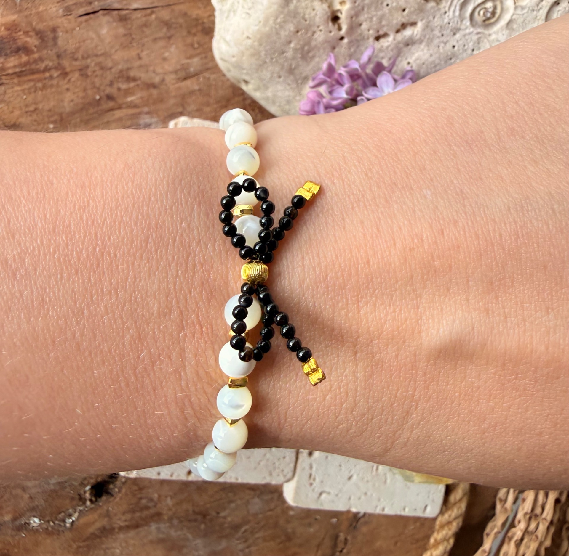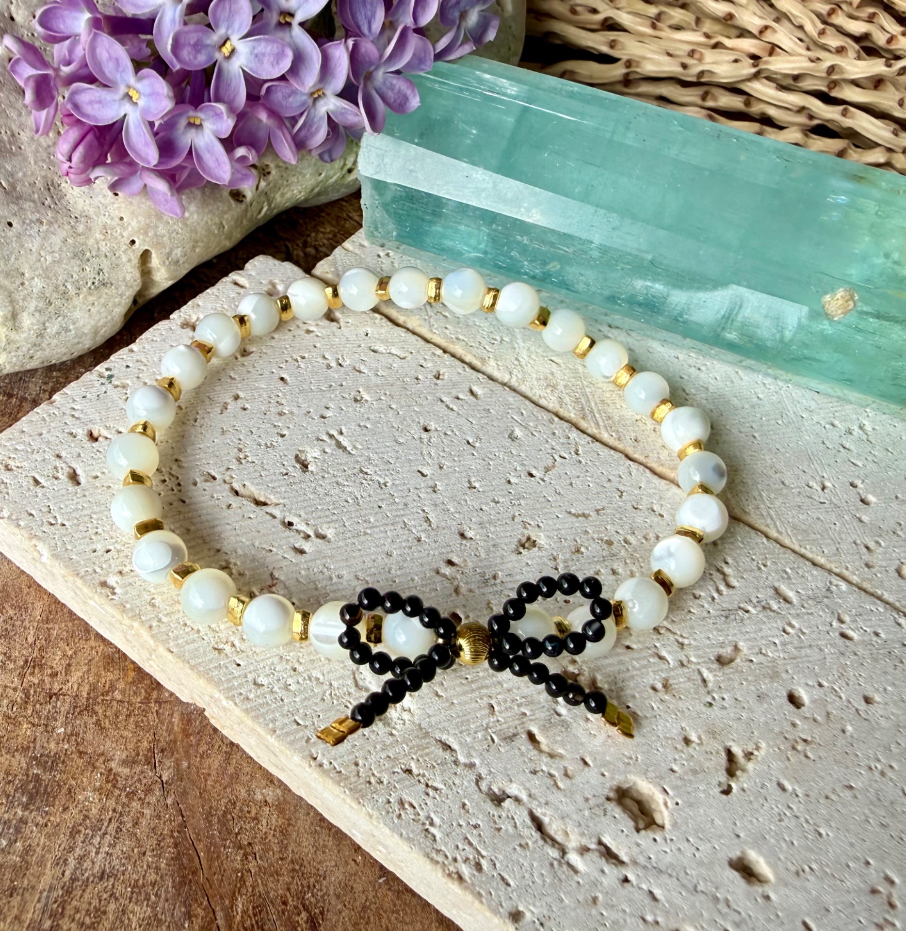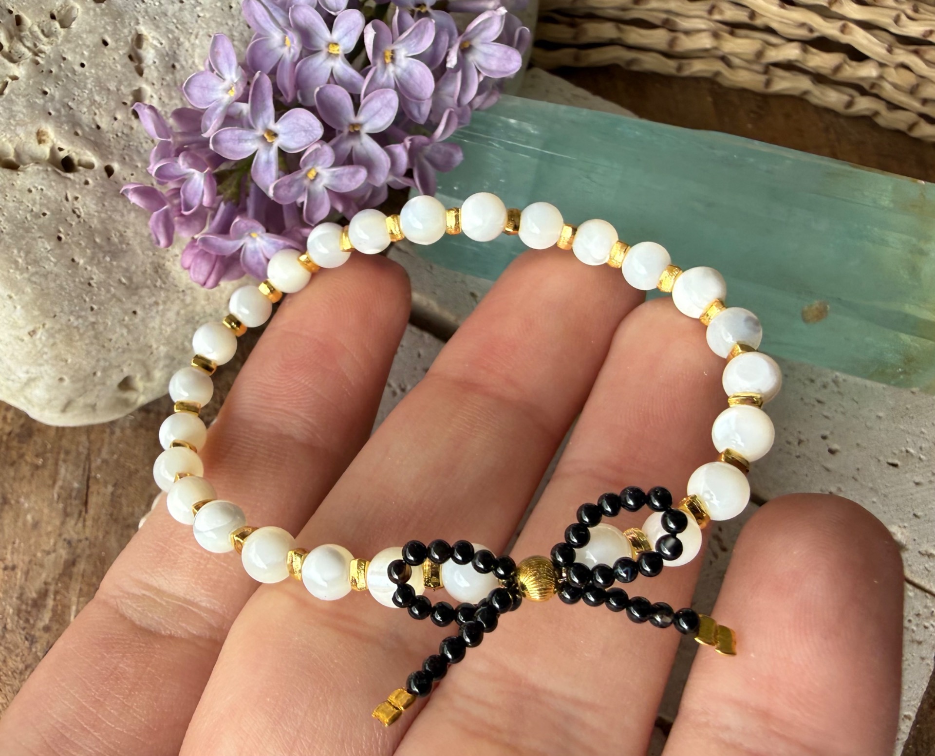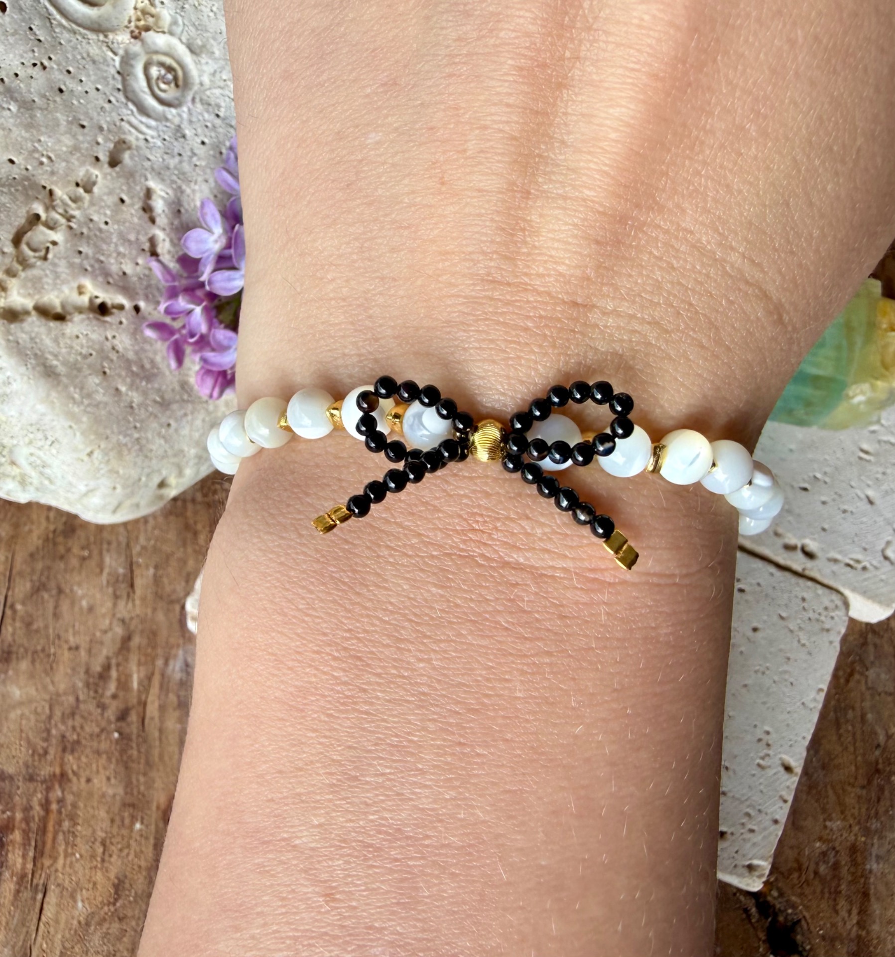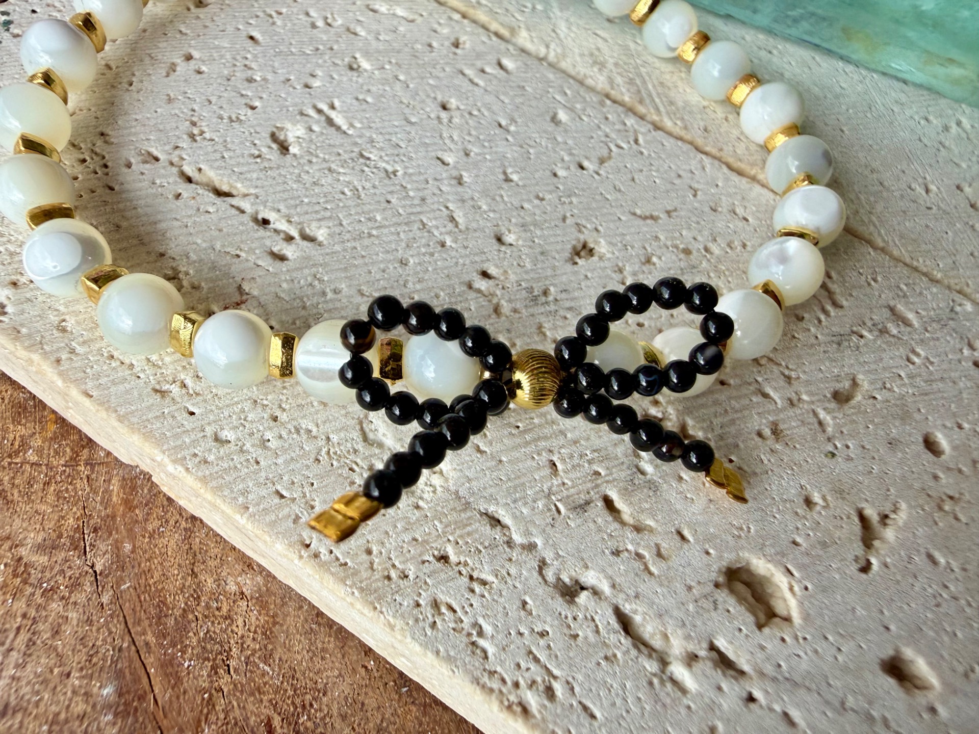 Tento výrazný a zároveň elegantný náramok spája jemnú svetlosť perlete s hlbokým, kontrastným detailom mašličky z onyxu. Pôsobí vyvážene, sebavedomo a nadčasovo – ako spojenie jemnosti a vnútornej sily.