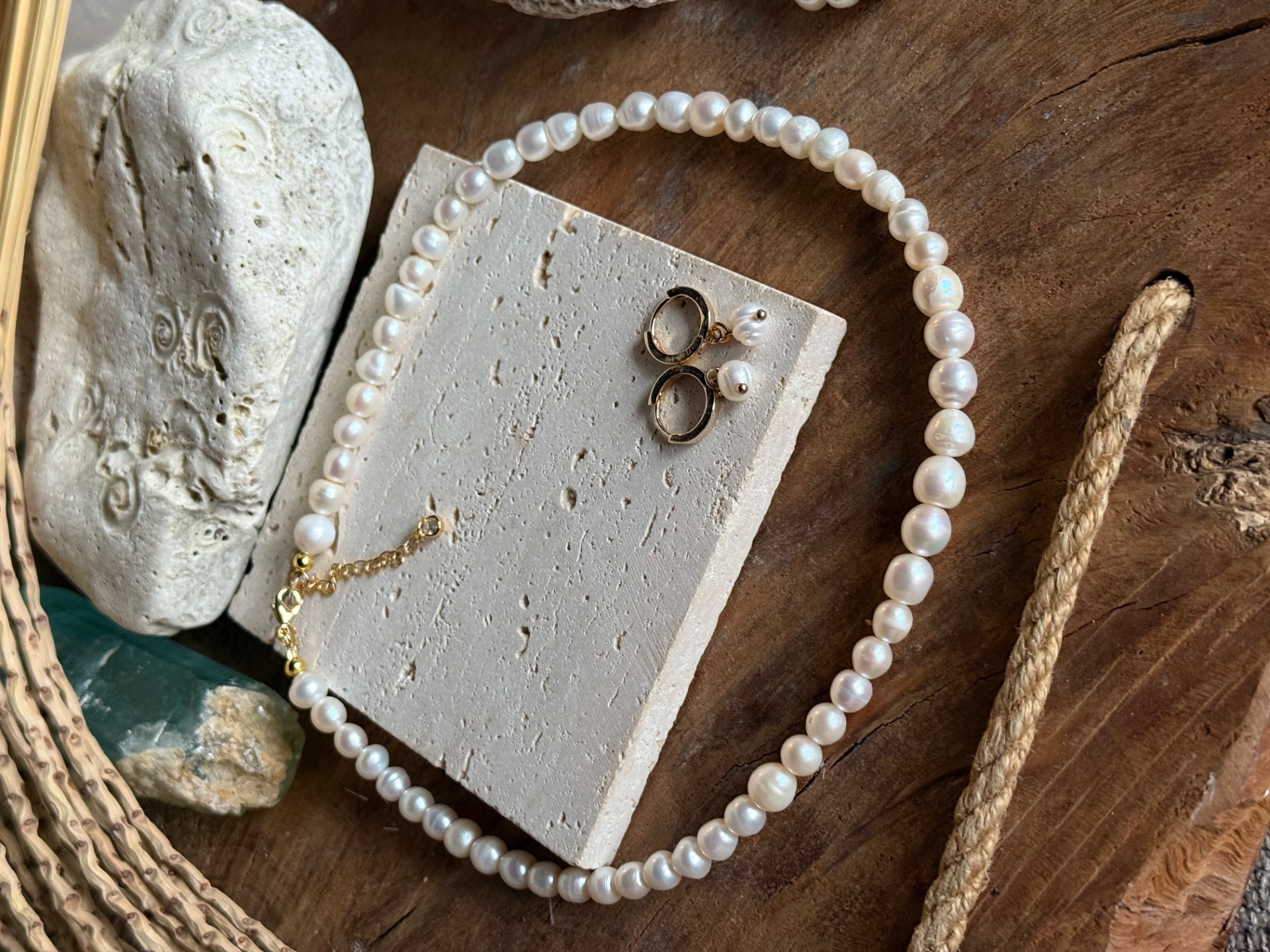 Jemný perlový set z prírodných bielych riečnych perál, vytvorený ako oslava ženskosti, čistoty a sebalásky. Nadčasová kombinácia náhrdelníka, náramku a visiace náušnice pôsobí elegantne, no zároveň prirodzene a ľahko nositeľne – každý deň aj pri výnimočných chvíľach.