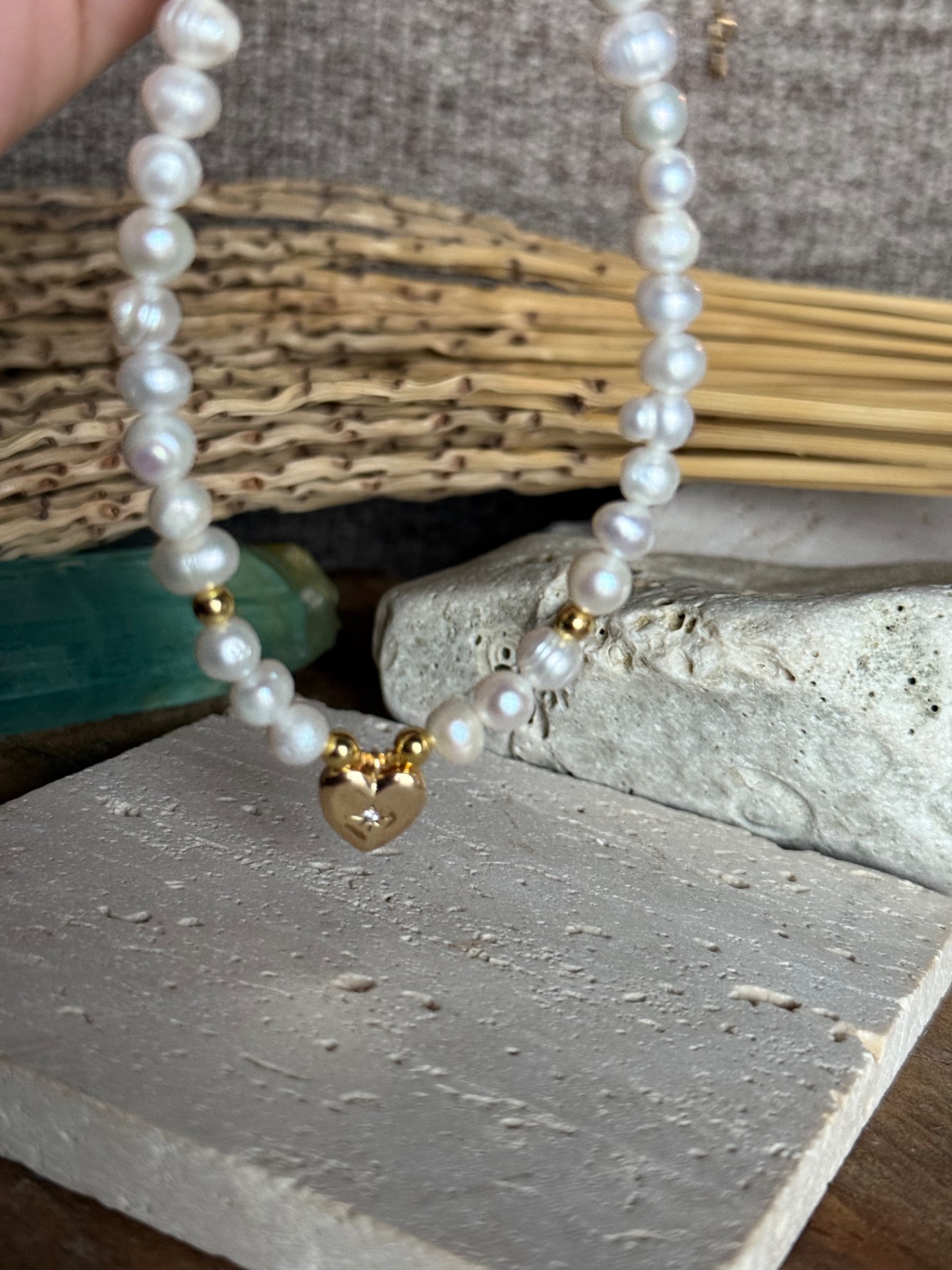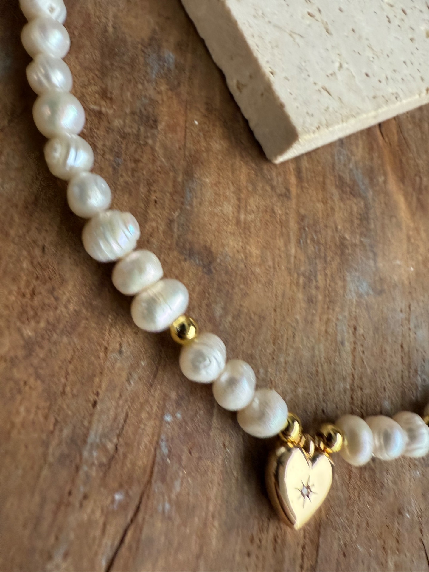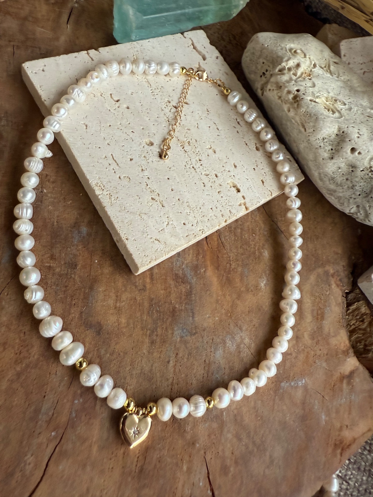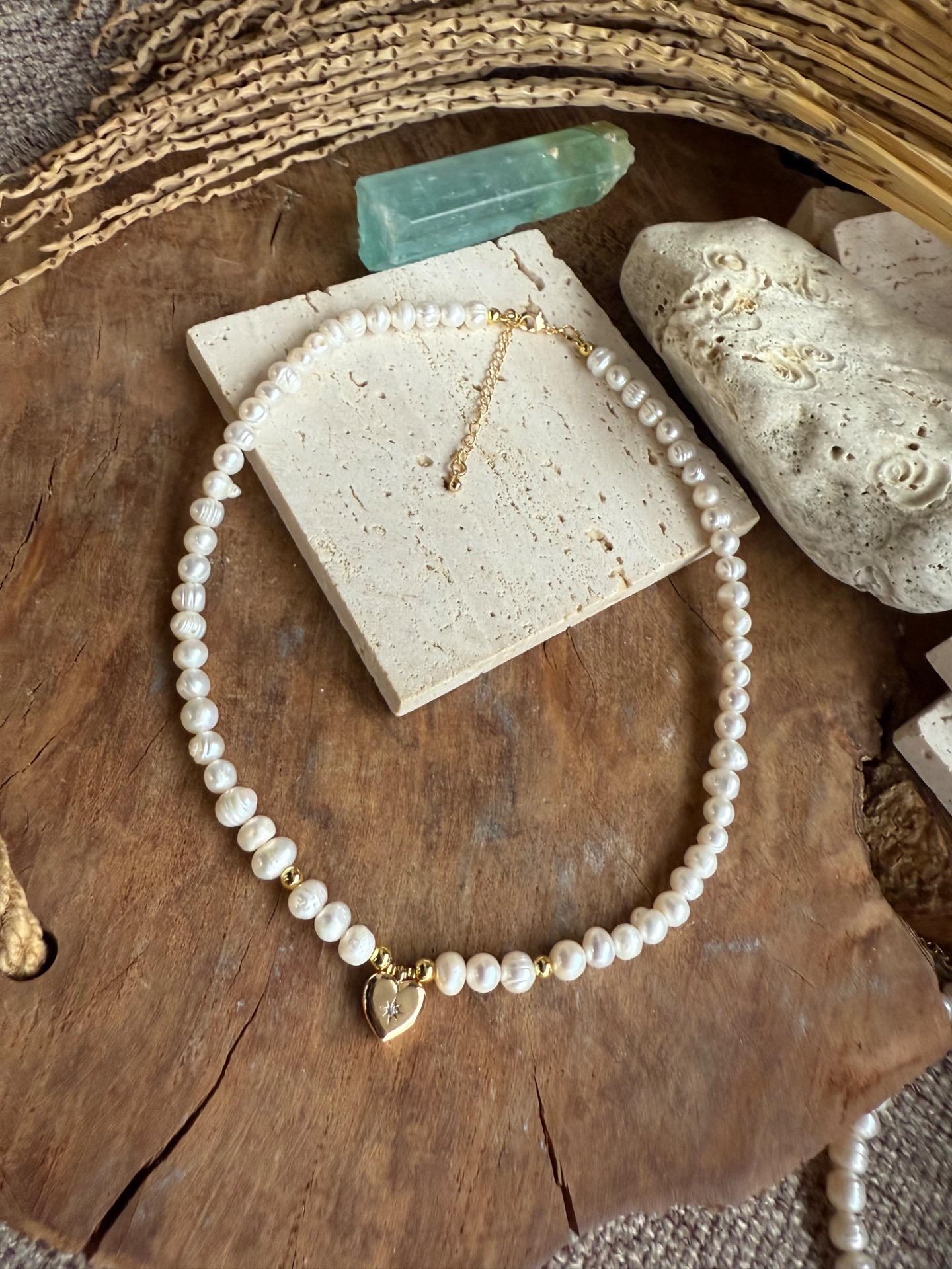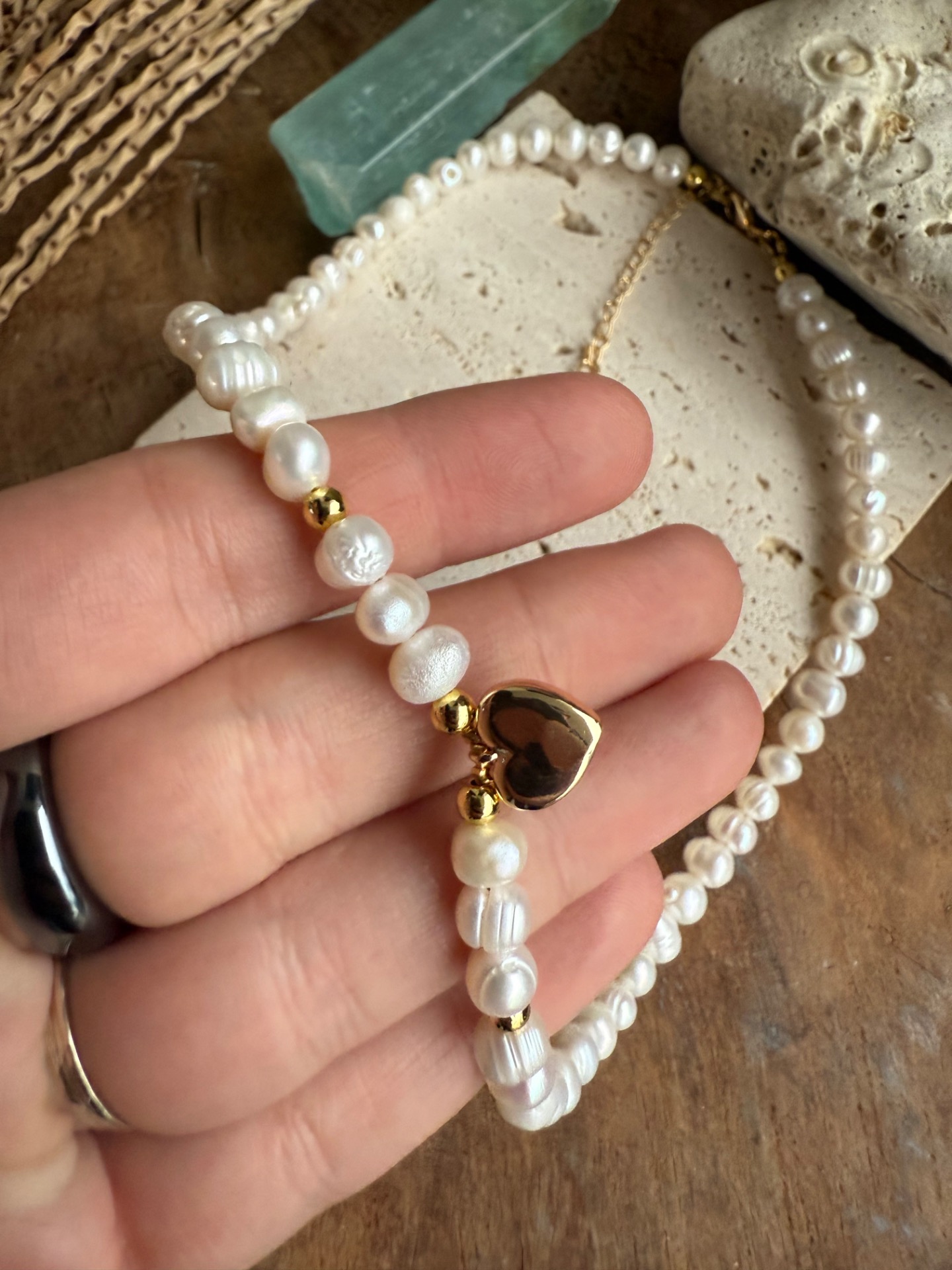 Jemný perlový choker, ktorý zvýrazní ženskosť. Prírodné biele riečne perly s veľkosťou 6–7 mm majú mäkký lesk a prirodzený tvar, vďaka čomu pôsobí náhrdelník autenticky a nadčasovo. Zlatý prívesok 14k gold plated v tvare srdiečka tvorí krásny detail, ako na fotografii, dodáva šperku jemný akcent a pocit tichého luxusu.