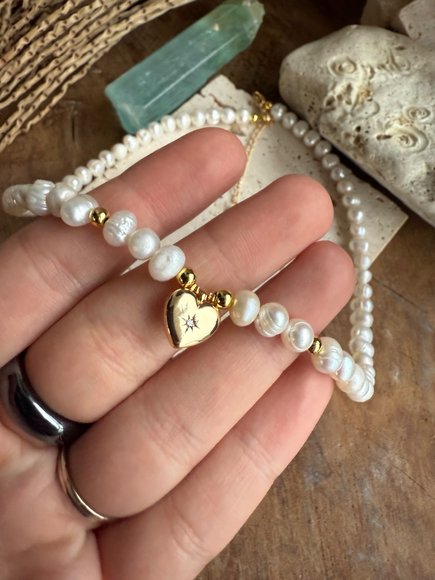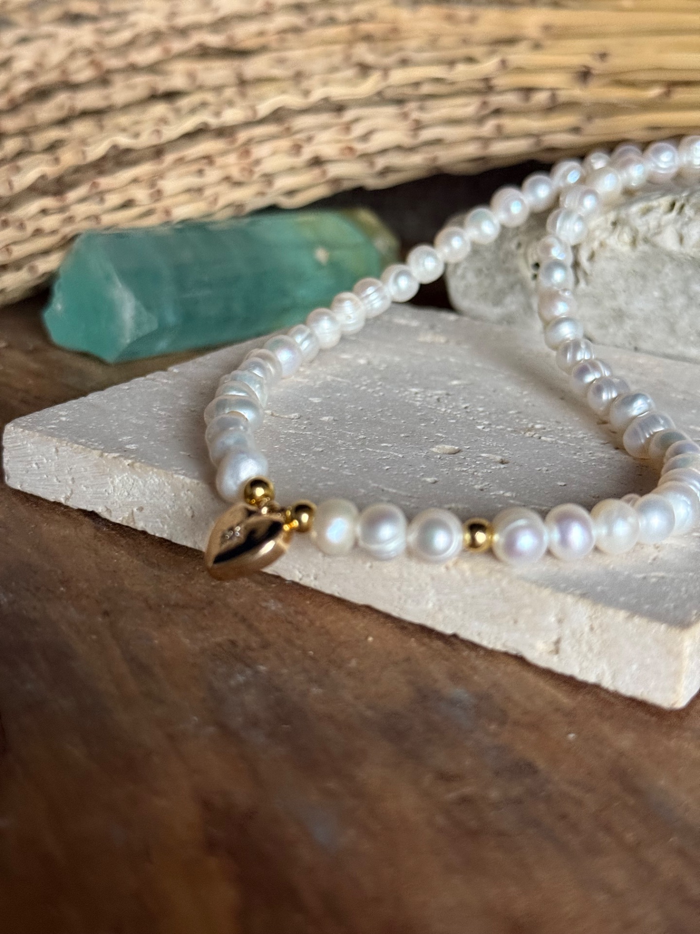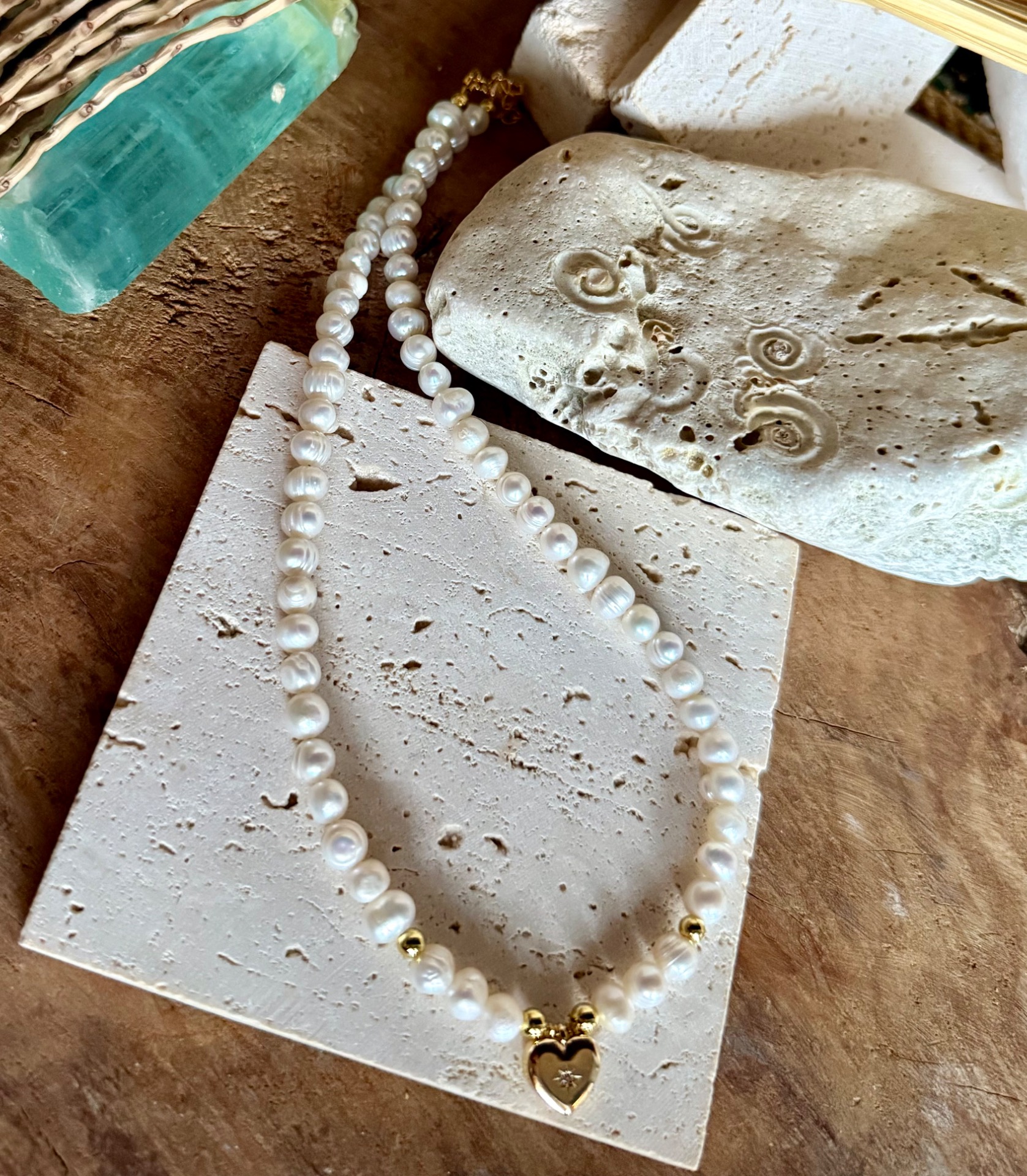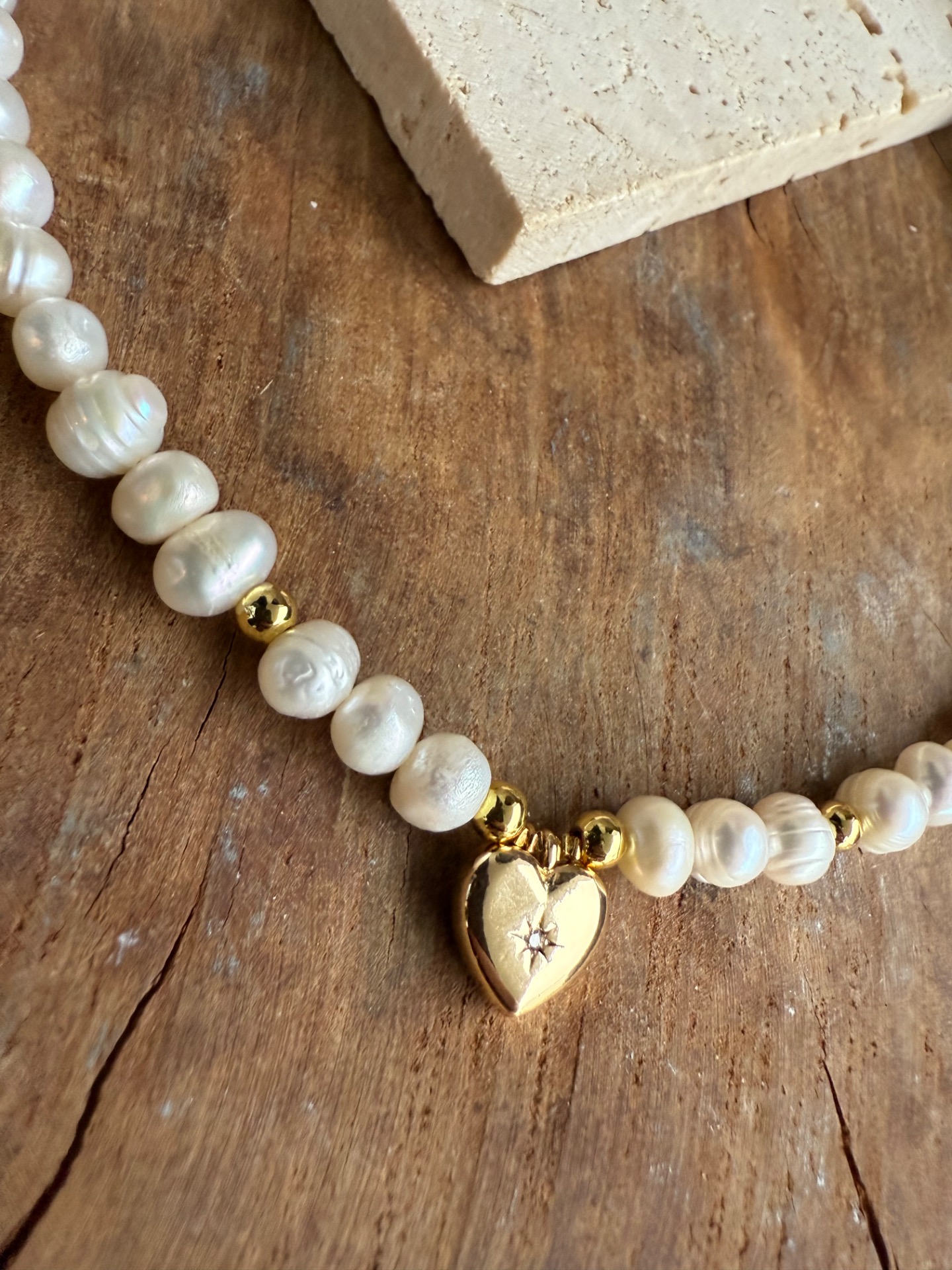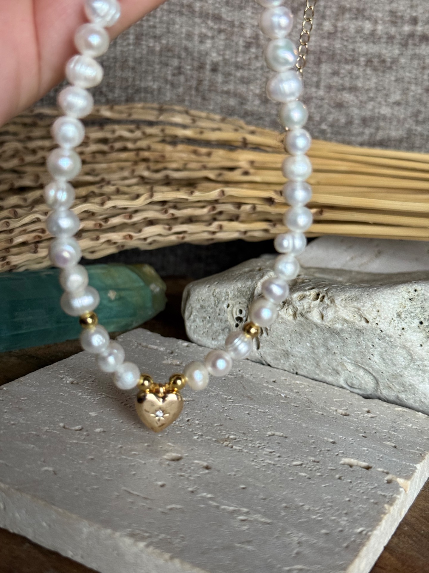 Jemný perlový choker, ktorý zvýrazní ženskosť. Prírodné biele riečne perly s veľkosťou 6–7 mm majú mäkký lesk a prirodzený tvar, vďaka čomu pôsobí náhrdelník autenticky a nadčasovo. Zlatý prívesok 14k gold plated v tvare srdiečka tvorí krásny detail, ako na fotografii, dodáva šperku jemný akcent a pocit tichého luxusu.