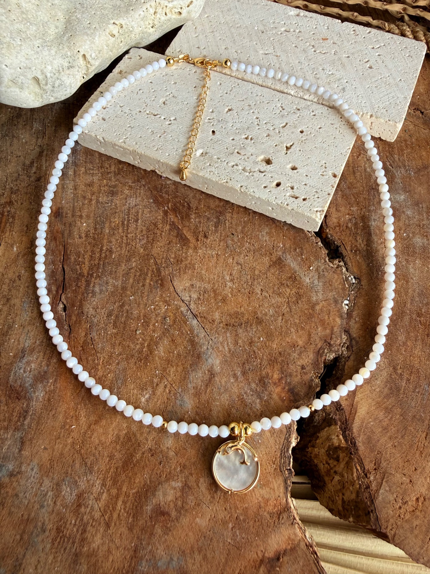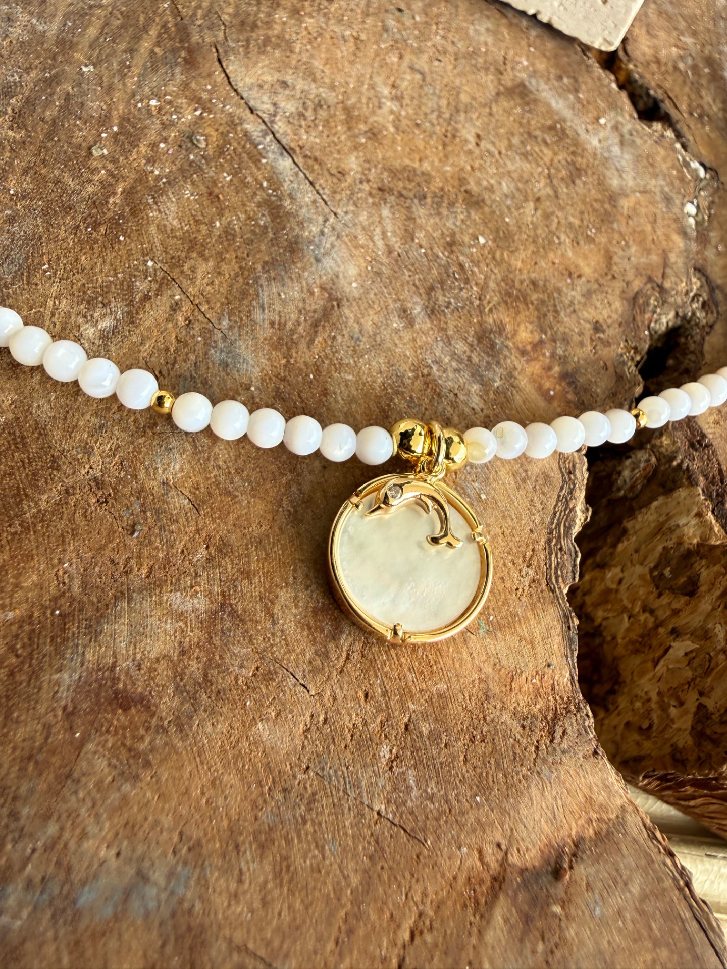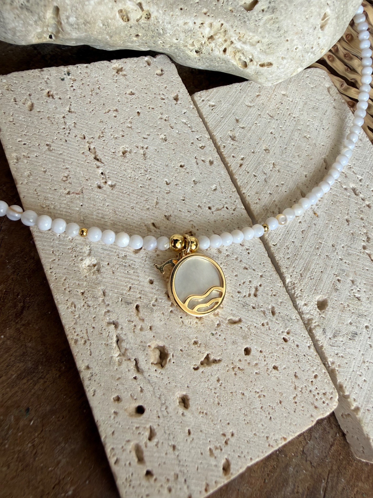 - Prívesky: perleťový medailón (vlna) + jemný delfínik