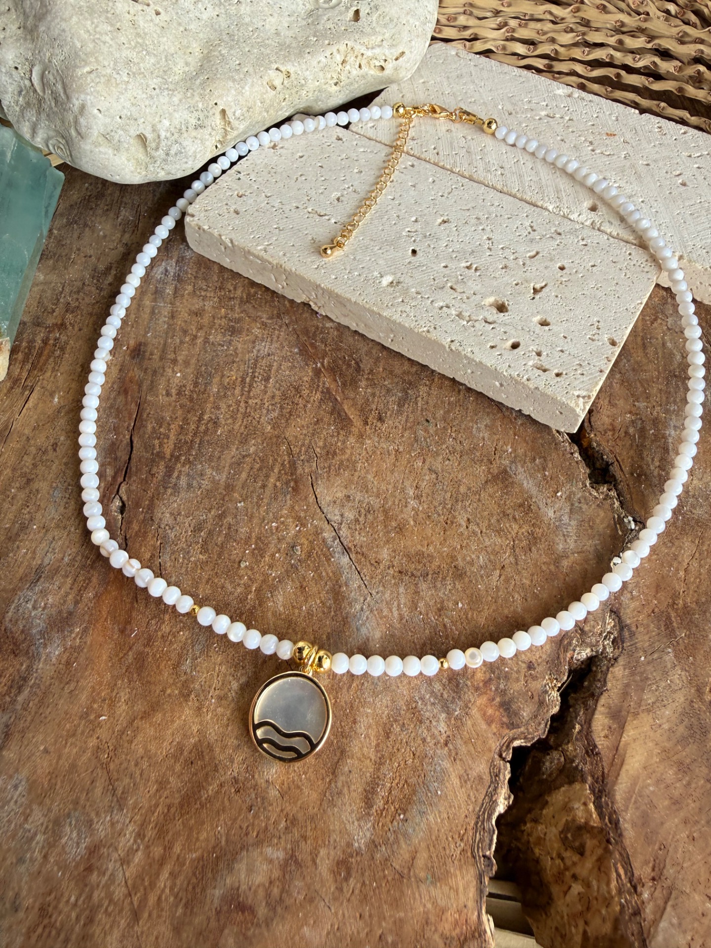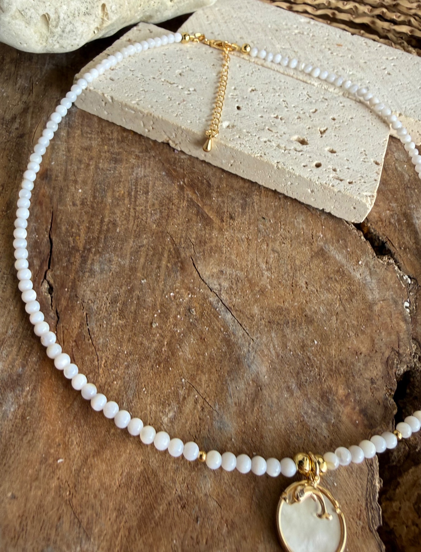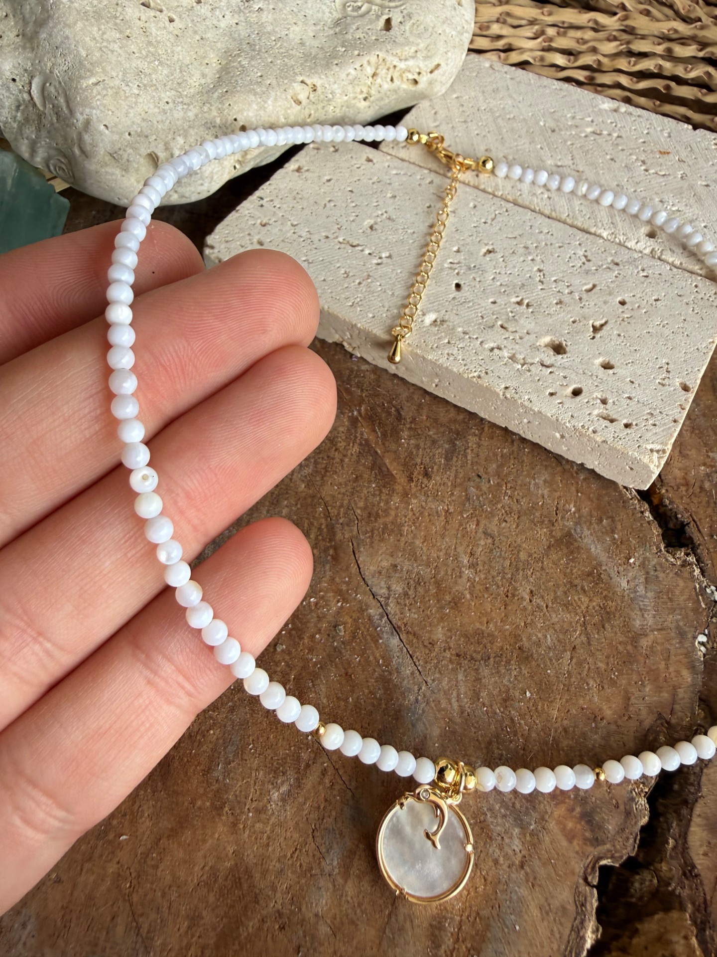 - Prívesky: perleťový medailón (vlna) + jemný delfínik