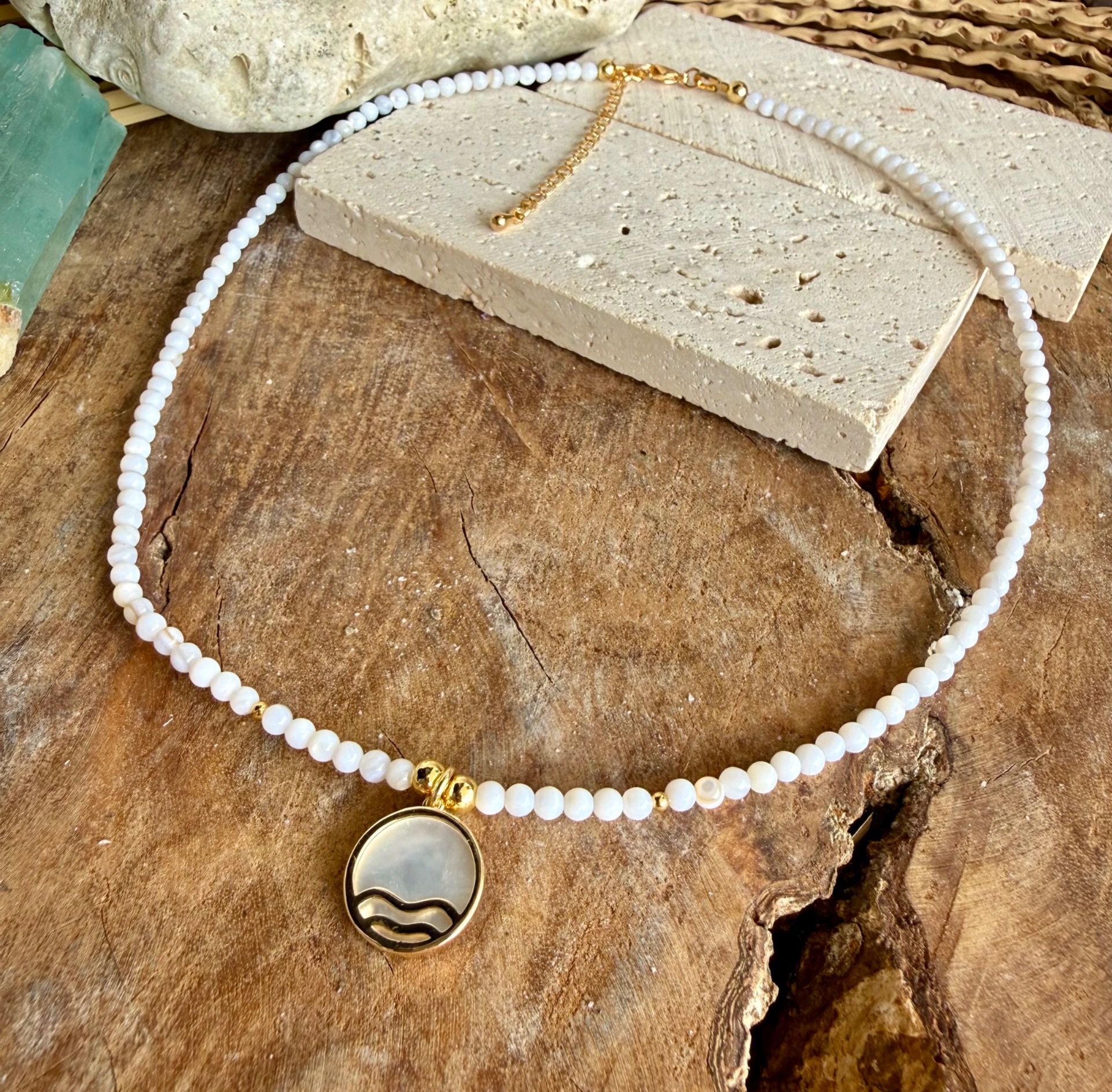 Mini perleťové korálky (2 mm) vytvárajú nežný, žiarivý základ, ktorý krásne odráža svetlo na pokožke a dodáva náhrdelníku čistý, svieži vibe – ideálny na leto, opálenú pokožku aj vrstvenie s ďalšími kúskami.