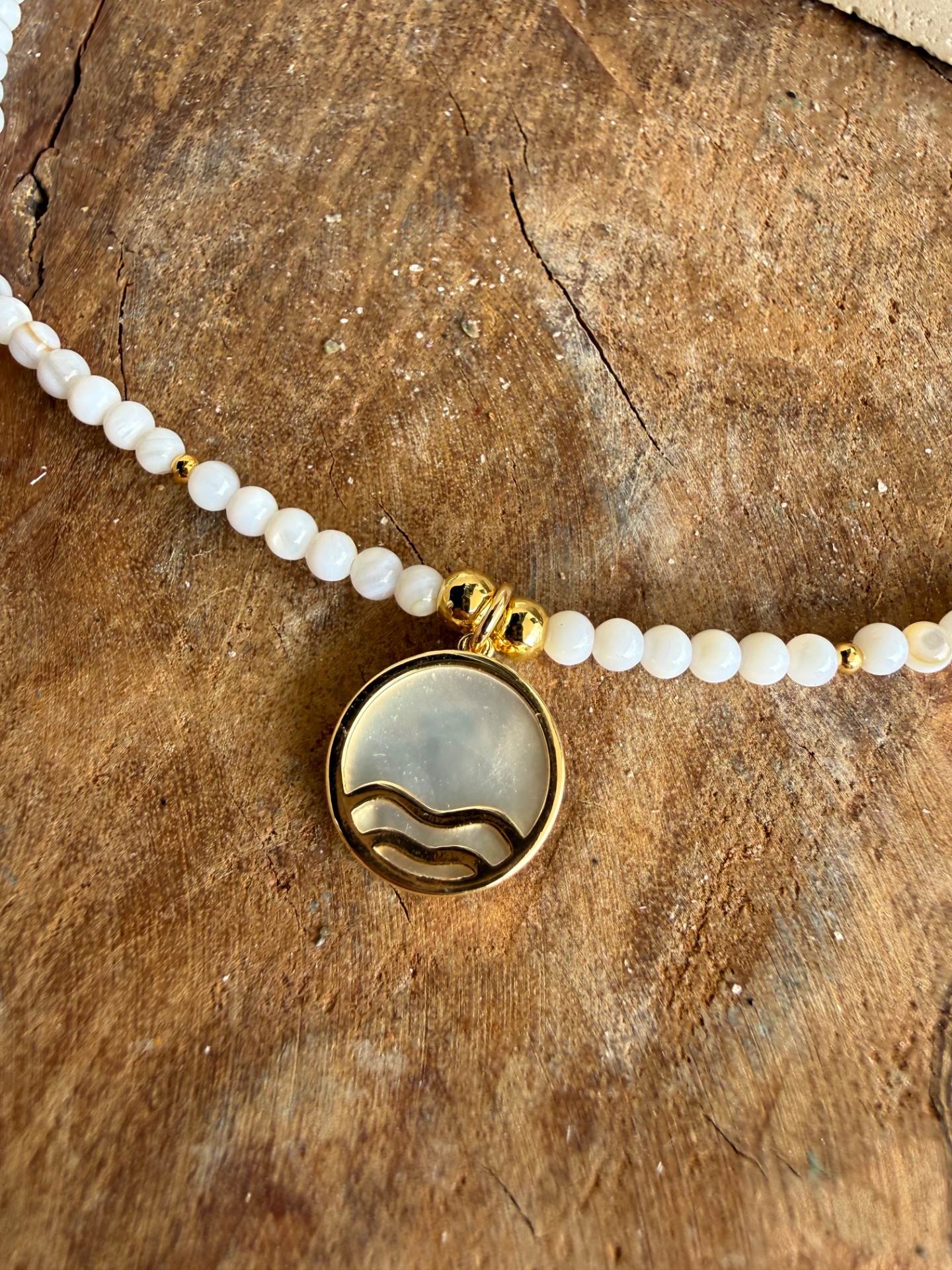 Dominantou je drobný medailónik z perlete so symbolom vlny – pripomienka plynutia, dôvery a života v súlade s vlastným rytmom. Z druhej strany ho dopĺňa ultra jemný prívesok delfínika, symbol radosti, slobody a hravosti.