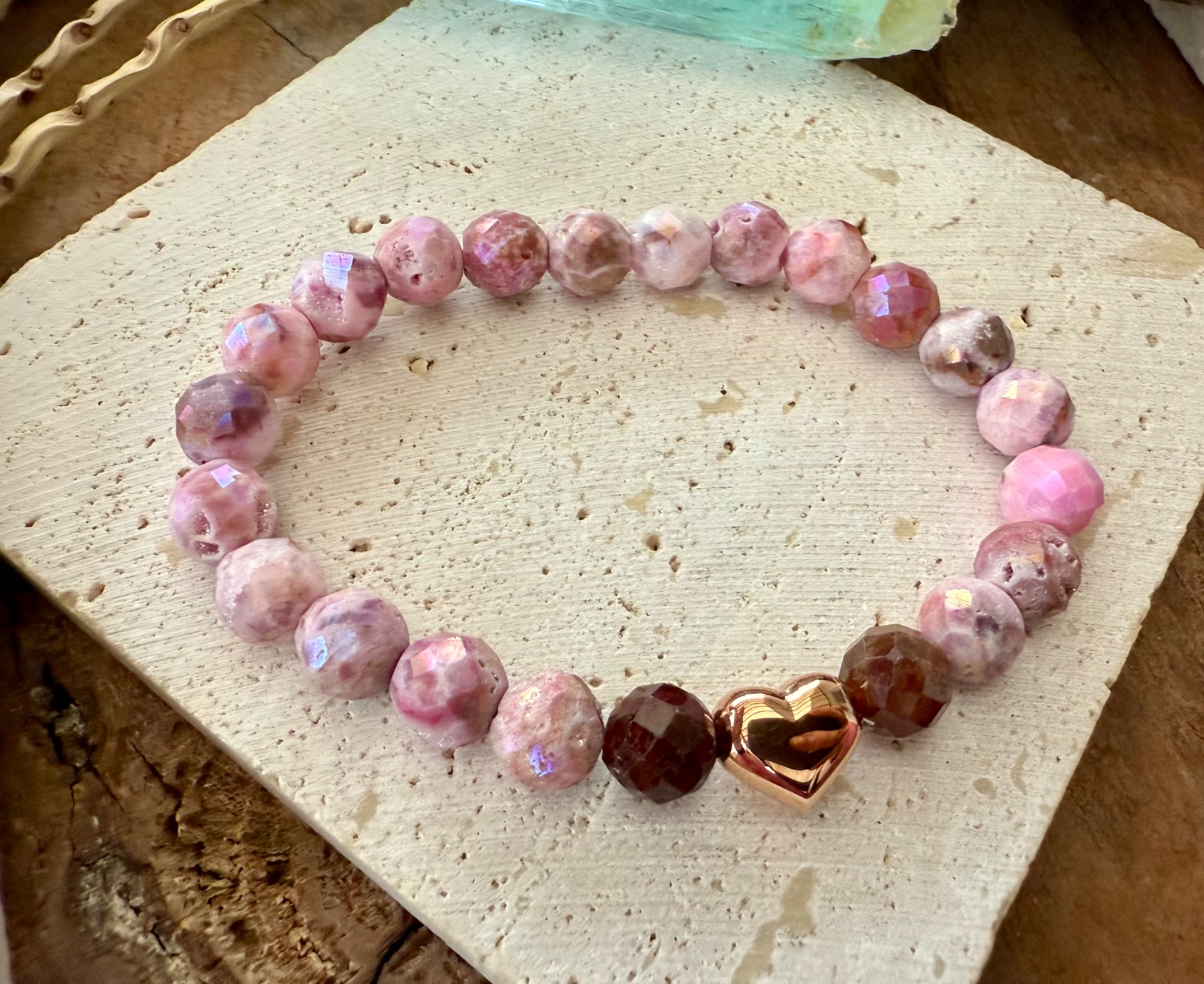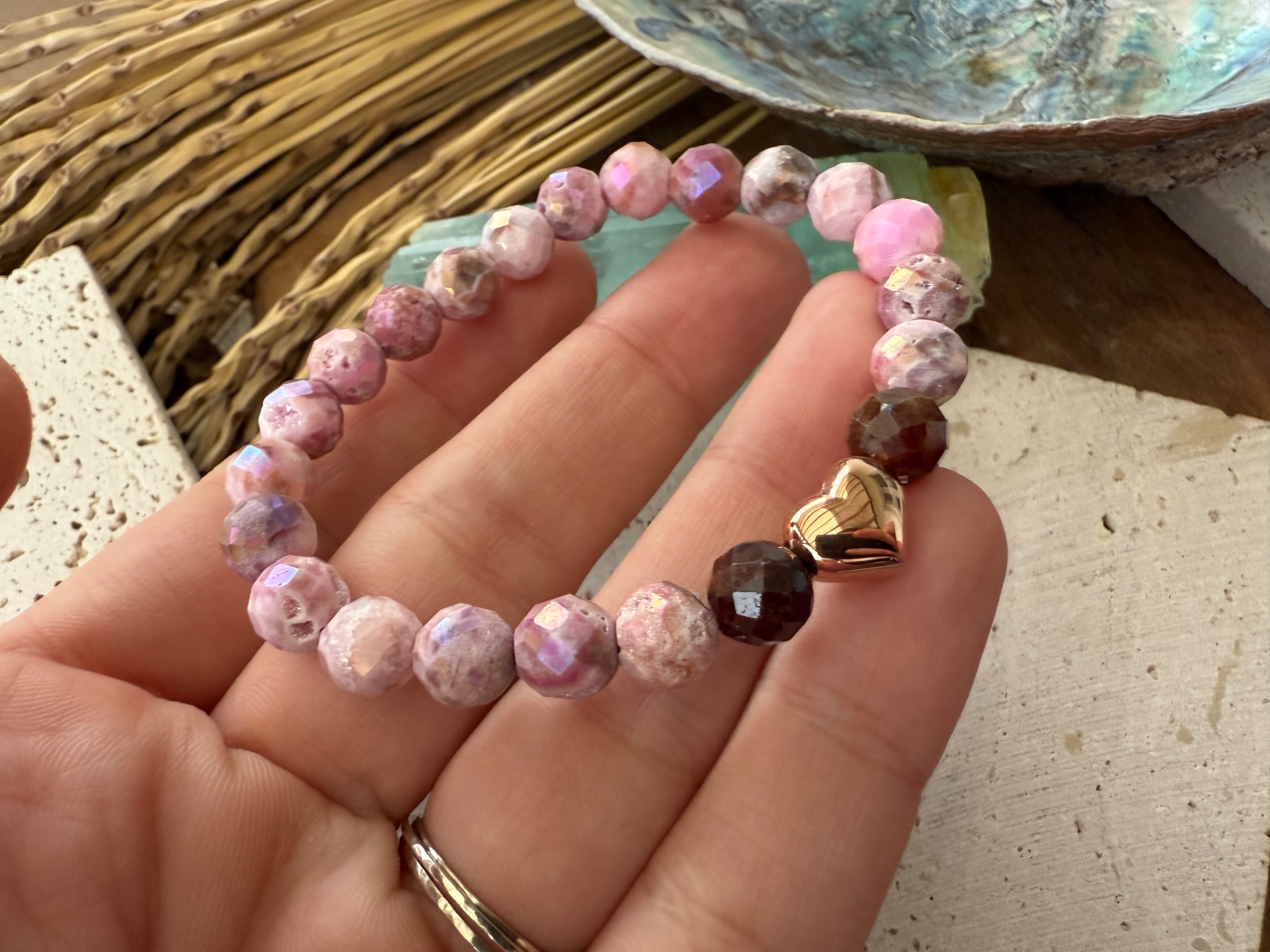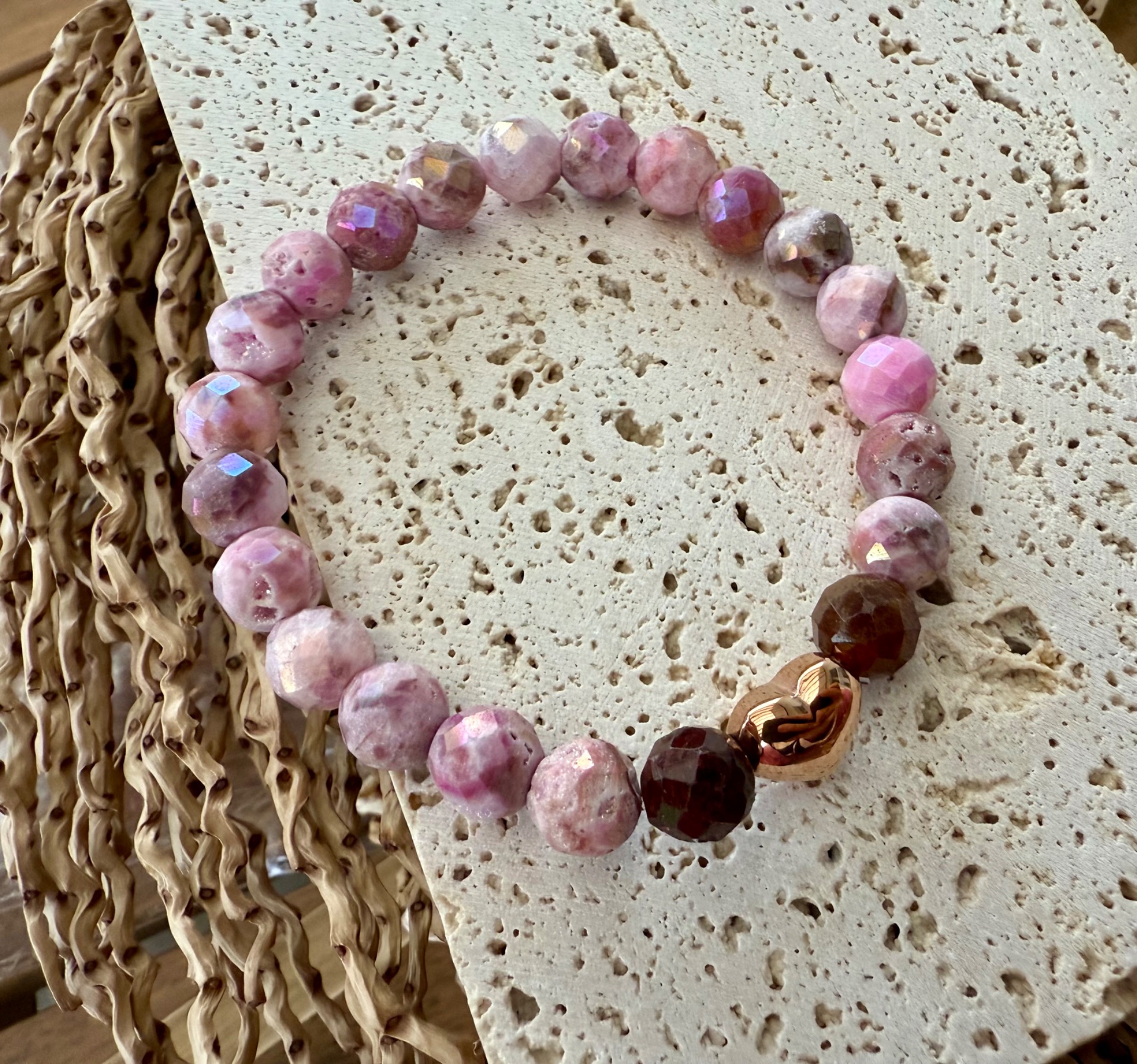Tento náramok v sebe spája jemnosť a silu – ružový achát s jemnou kresbou geód ti prináša pocit bezpečia, prijatia a vnútorného pokoja, zatiaľ čo indický granát prebúdzá tvoju vášeň, odvahu a vnútorný oheň. Spolu vytvárajú harmonickú dvojicu, ktorá ti pripomína, že sebaláska je základom všetkého, čo do života priťahuješ.