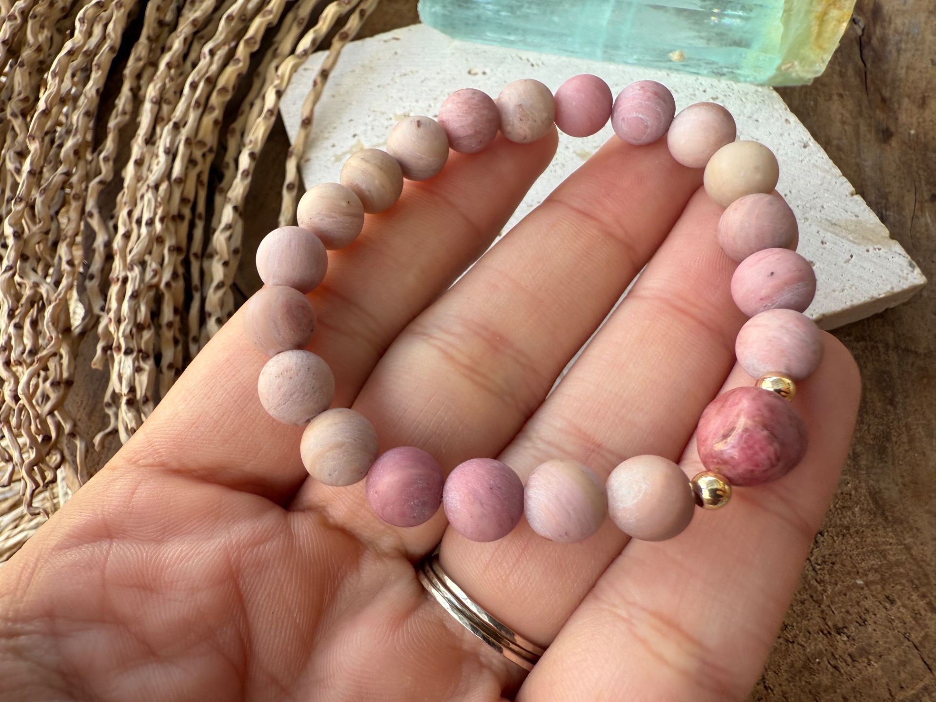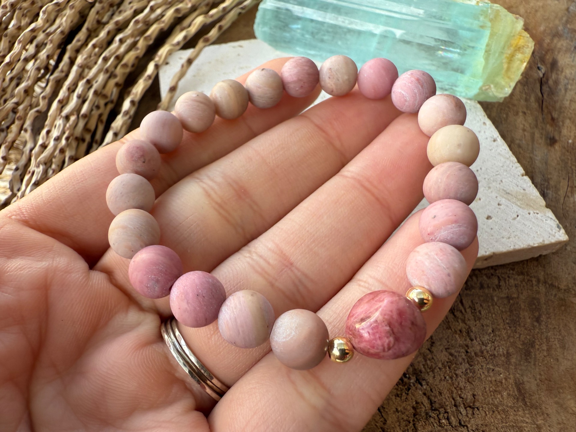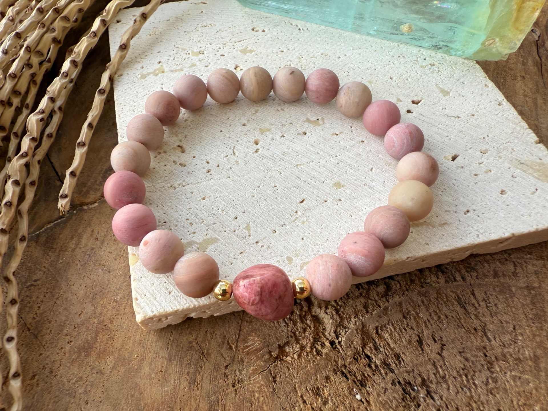 Náramok z minerálu rodonit 8mm matný . Doplnený rodonitom sýto ružovým v prednej časti.
