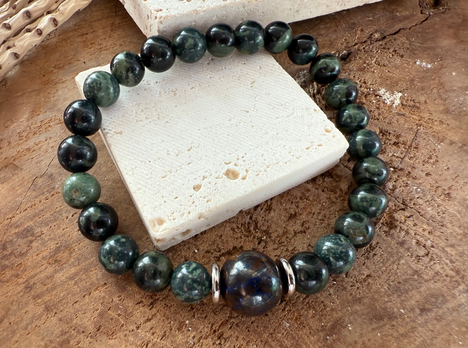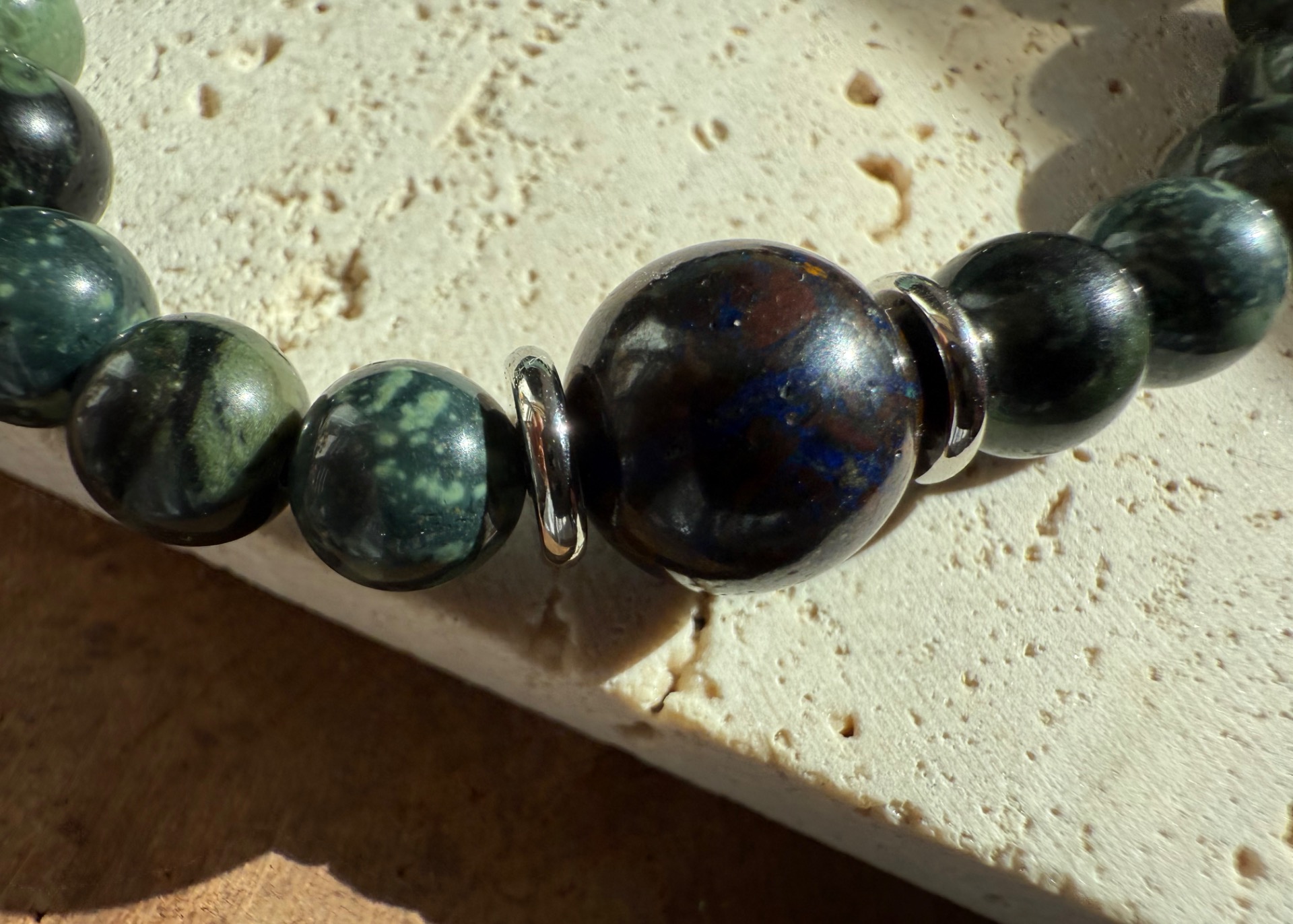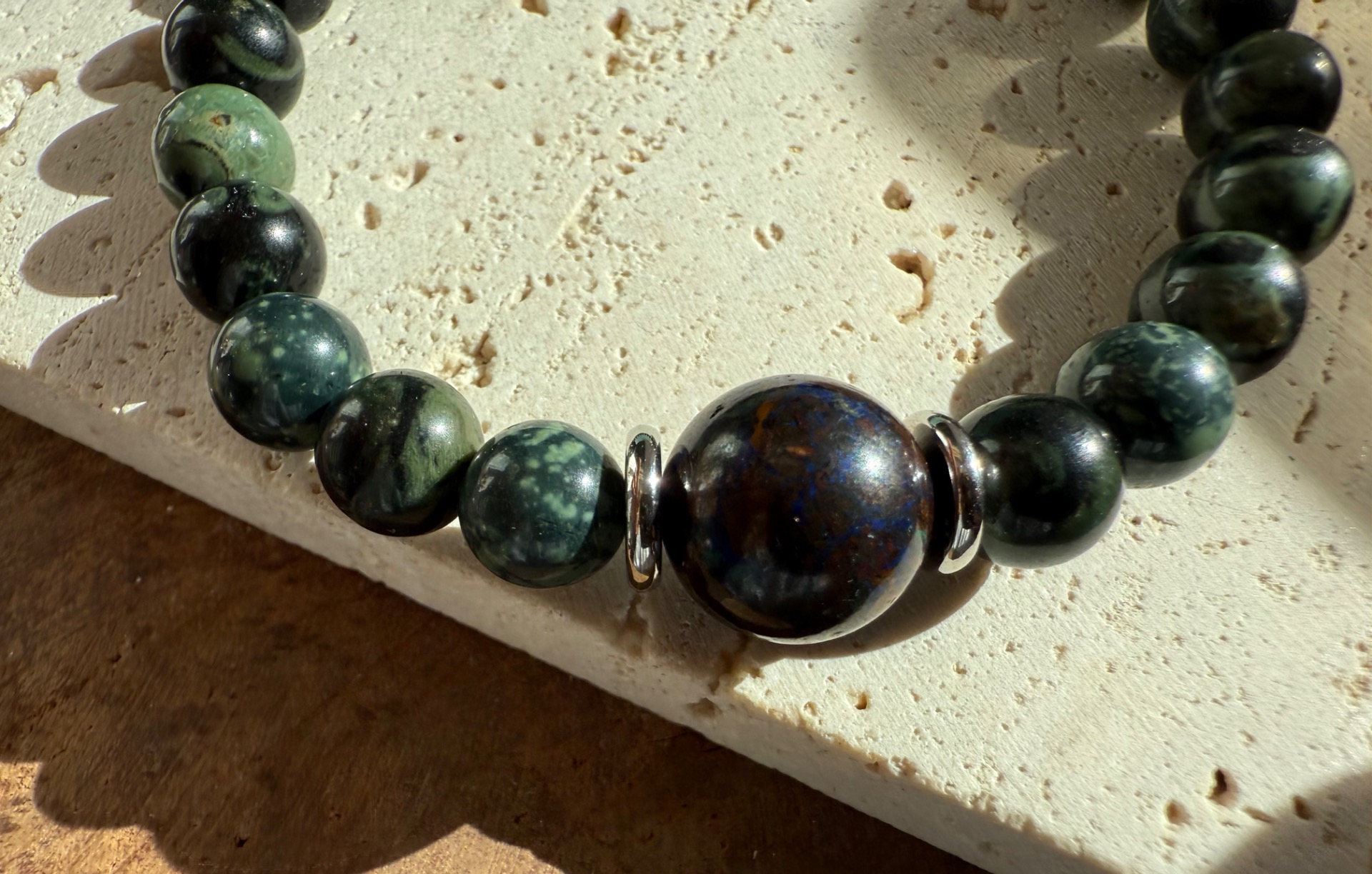 Tento pánsky náramok je navrhnutý ako talizman vnútorného pokoja, uzemnenia a jasnej mysle. Spojenie ryolitu a chryzokolu podporuje stabilitu, sústredenie a pokoj v každodennom živote.