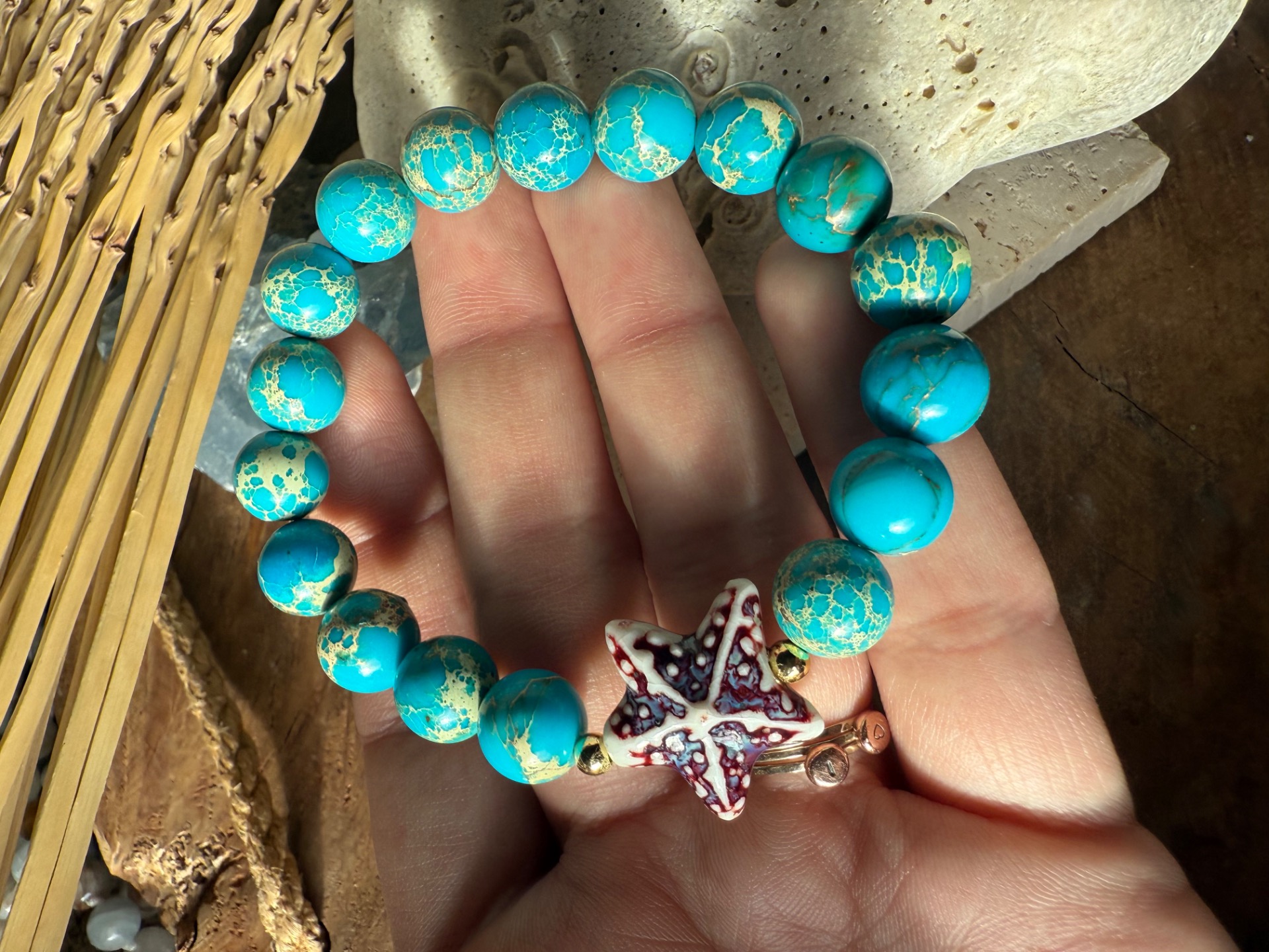 Doplnok tvorí ručne porcelánová hviezdica v hnedo modrých odtieňoch?ktorá symbolizuje svetlo, nádej a spojenie s nekonečnou krásou prírody. Spolu tvoria náramok, ktorý vás sprevádza pokojom, inšpiráciou a hravým šarmom každý deň.