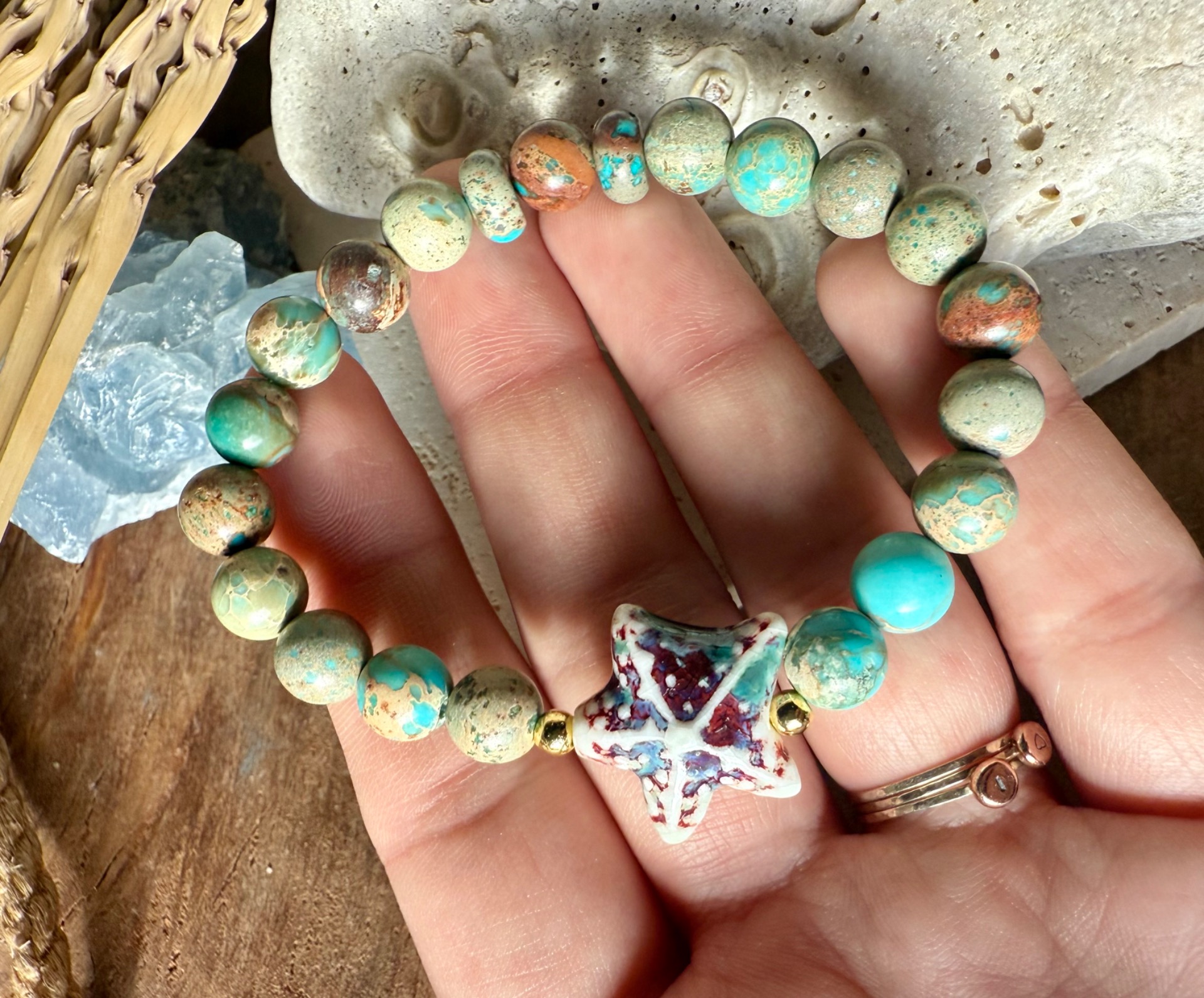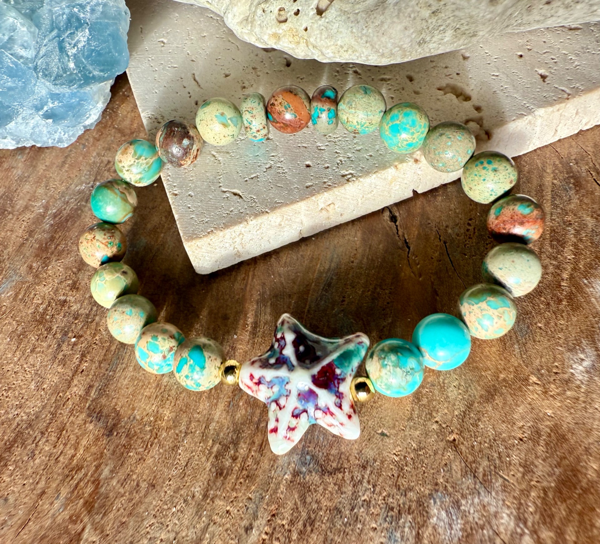 Doplnok tvorí porcelánová hviezdica, ktorá symbolizuje svetlo, nádej a spojenie s nekonečnou krásou prírody. Spolu tvoria náramok, ktorý vás sprevádza pokojom, inšpiráciou a hravým šarmom každý deň.