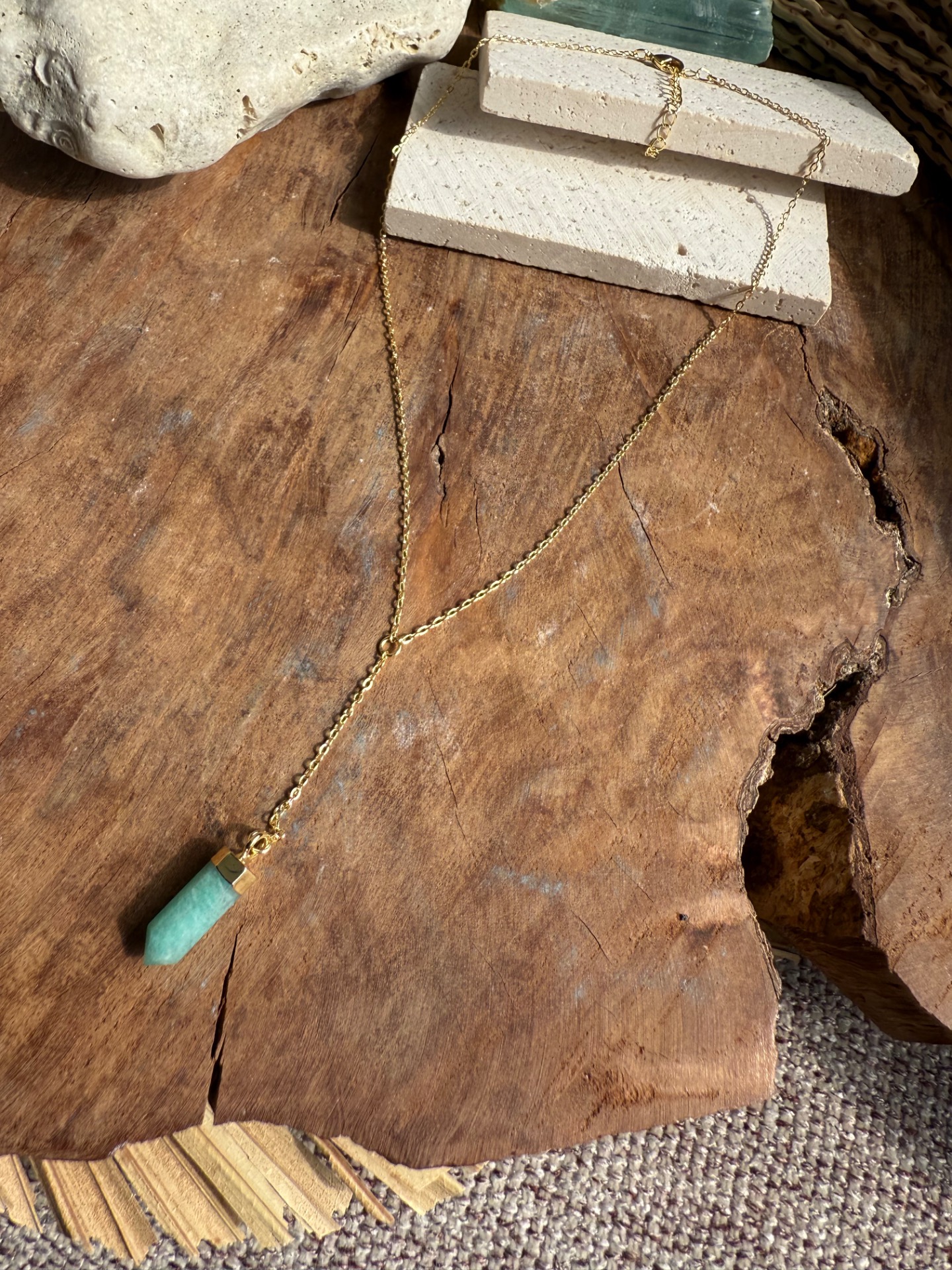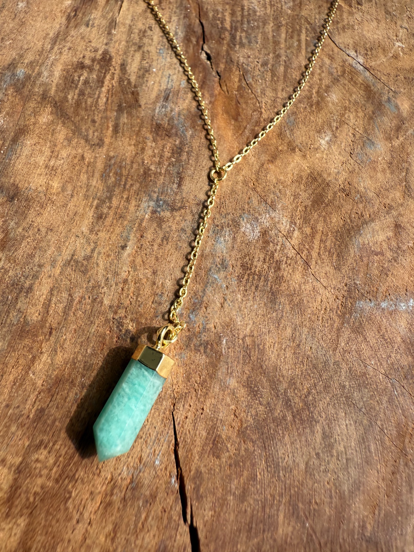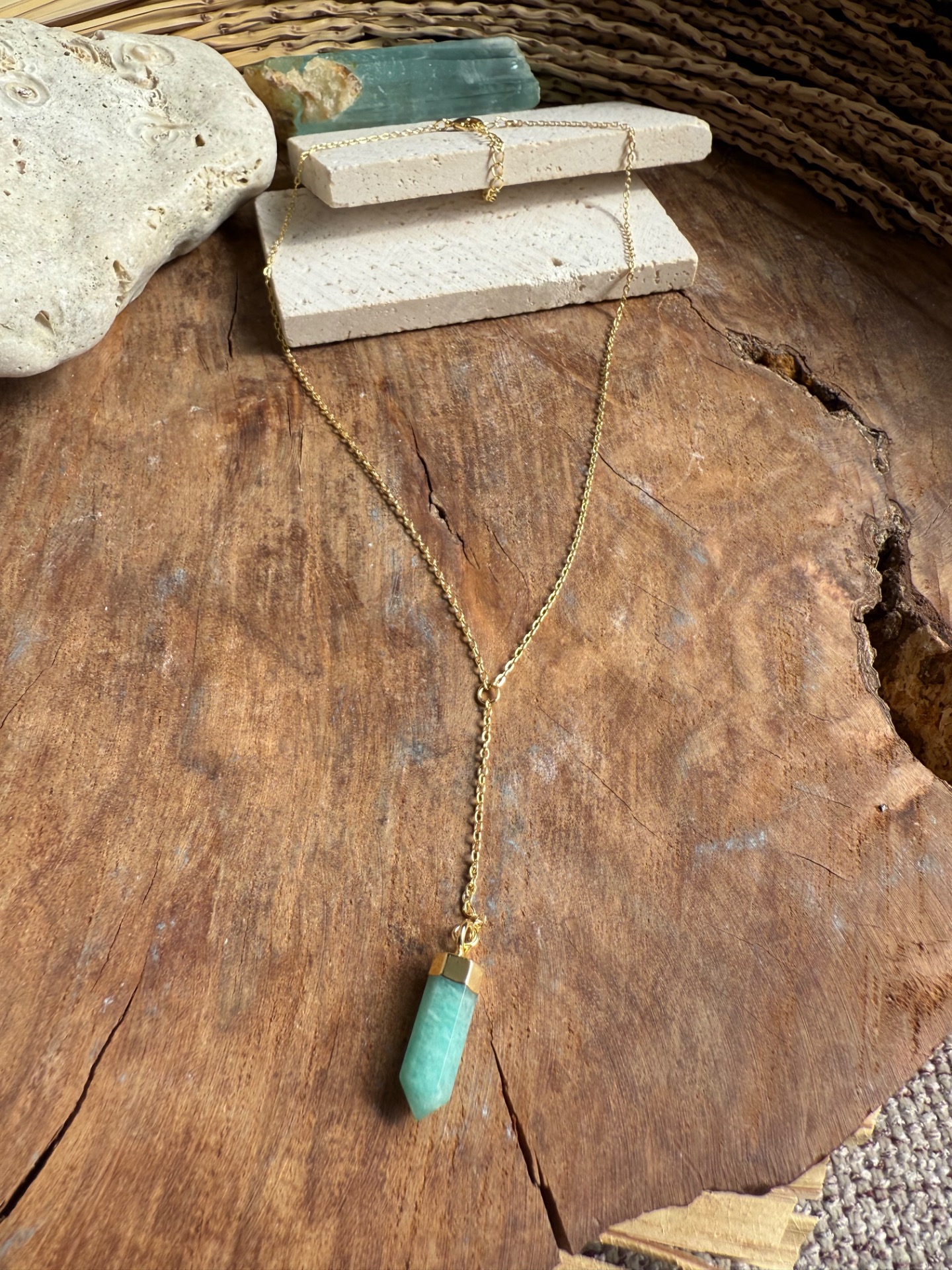 Jemná zlatá retiazka v tvare Y elegantne kopíruje líniu krku a dekoltu. Dominantou je brúsený prívesok z amazonitu, ktorý očarí svojou jemnou modro-zelenou farbou a dodáva šperku sviežu, harmonickú energiu.