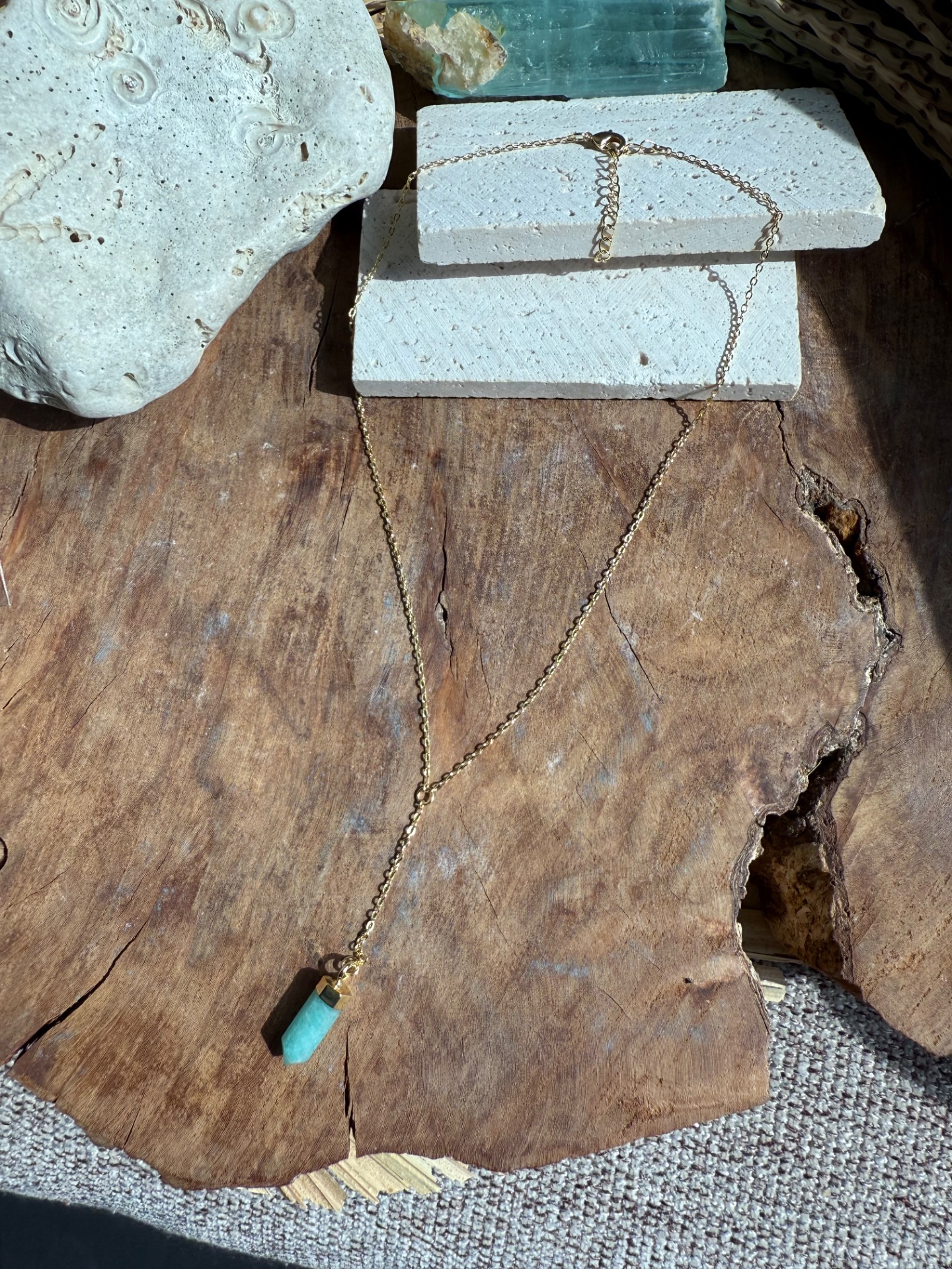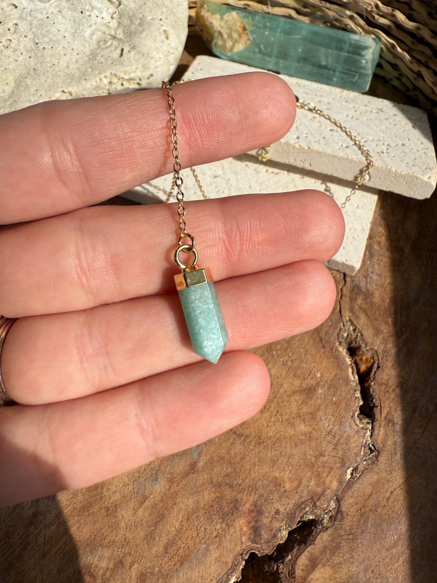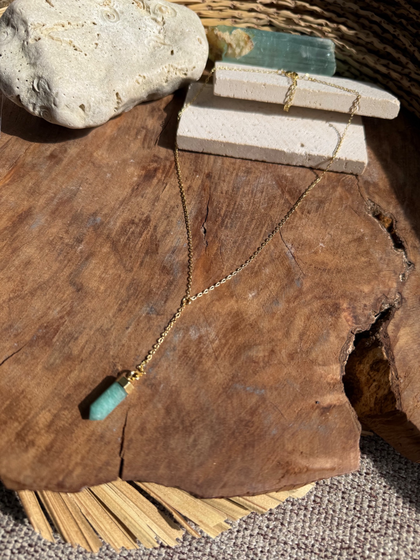 Jemná zlatá retiazka v tvare Y elegantne kopíruje líniu krku a dekoltu. Dominantou je brúsený prívesok z amazonitu, ktorý očarí svojou jemnou modro-zelenou farbou a dodáva šperku sviežu, harmonickú energiu.