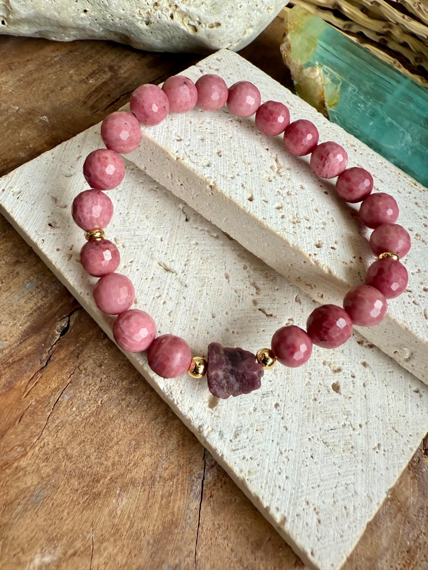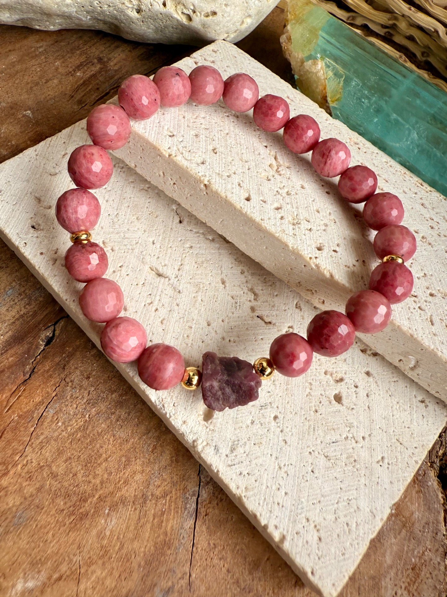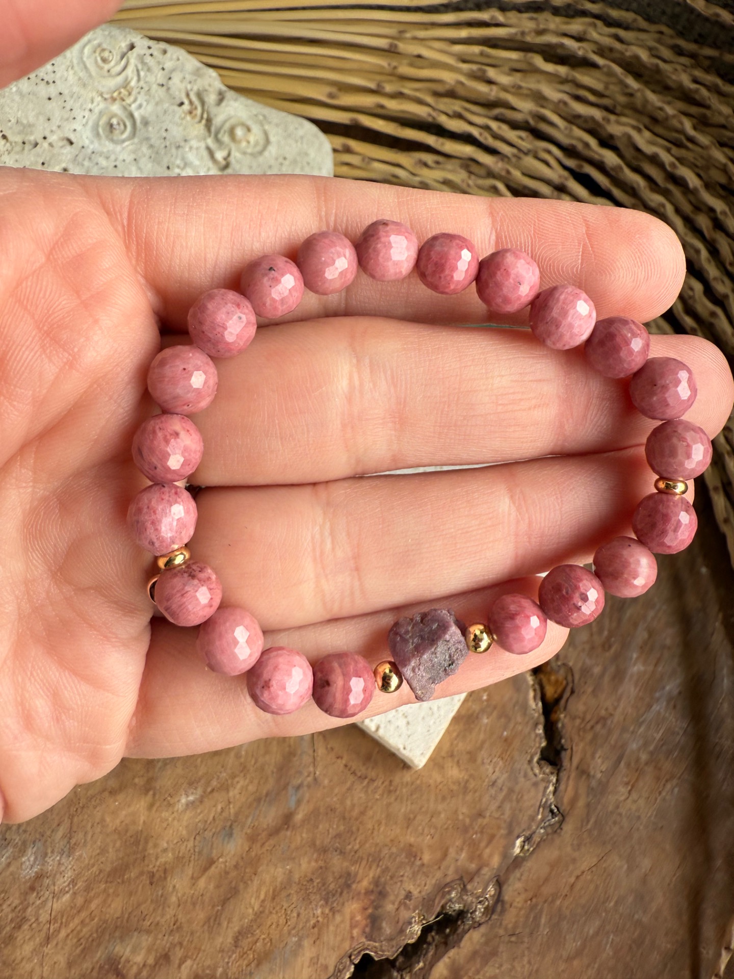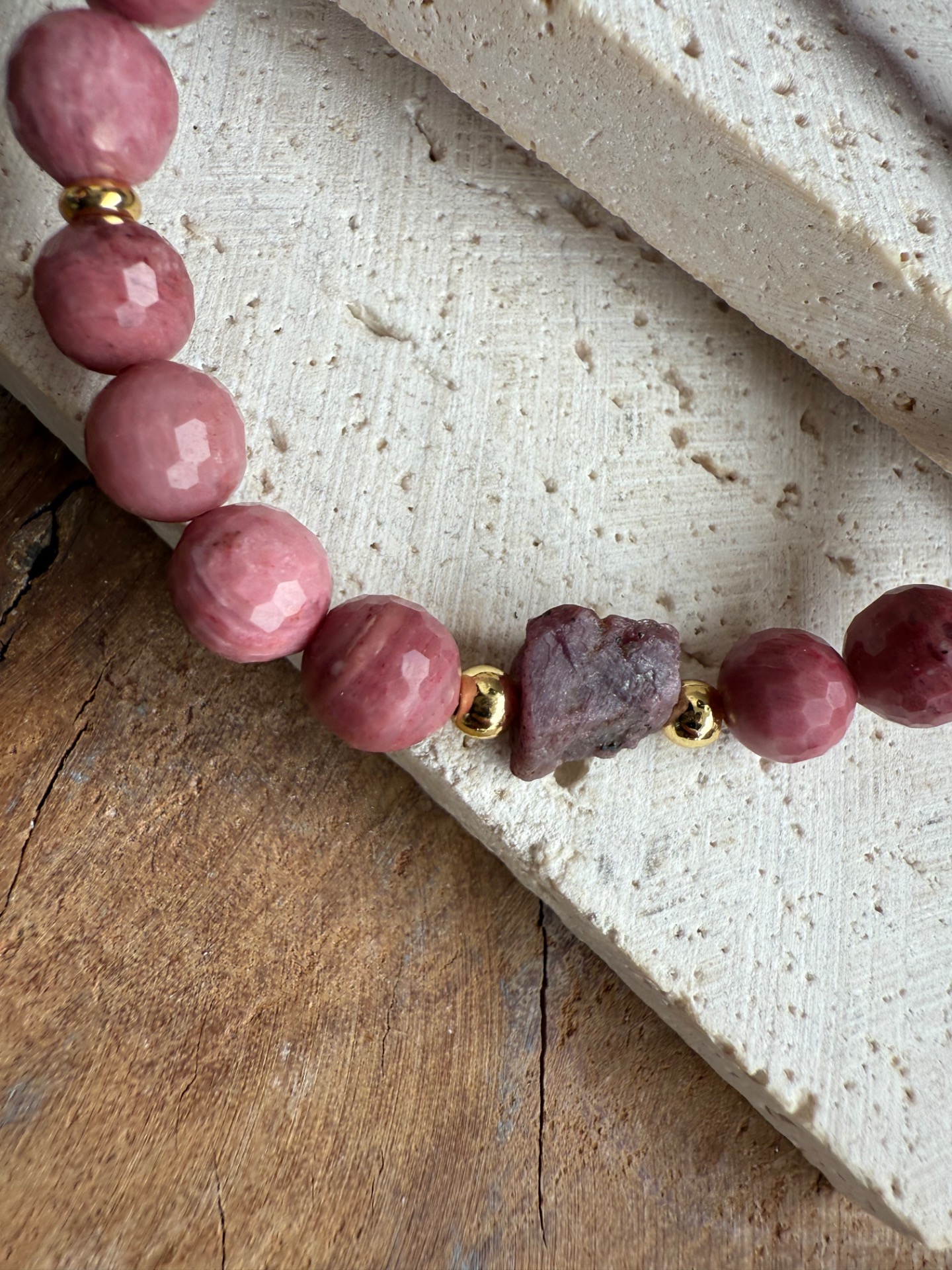 Výrazný náramok z 8 mm korálok rodonitu doplnený surovým rubínom v prednej časti. Kombinácia jemnej ružovej a hlbokej červenej prináša energiu vášne, vitality a vnútorného oživenia.