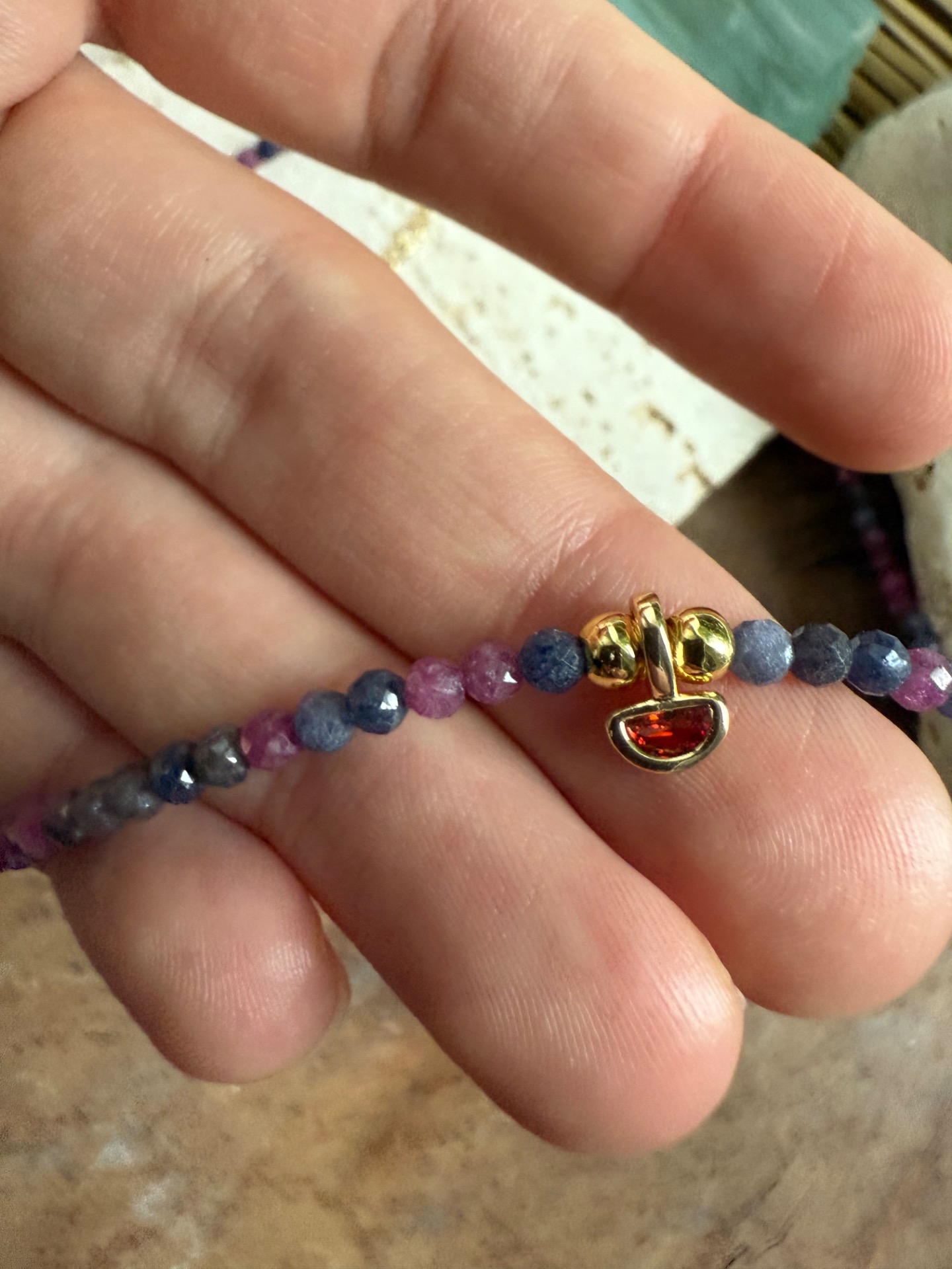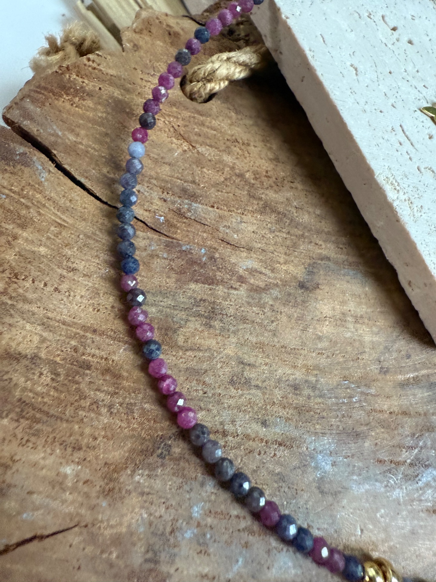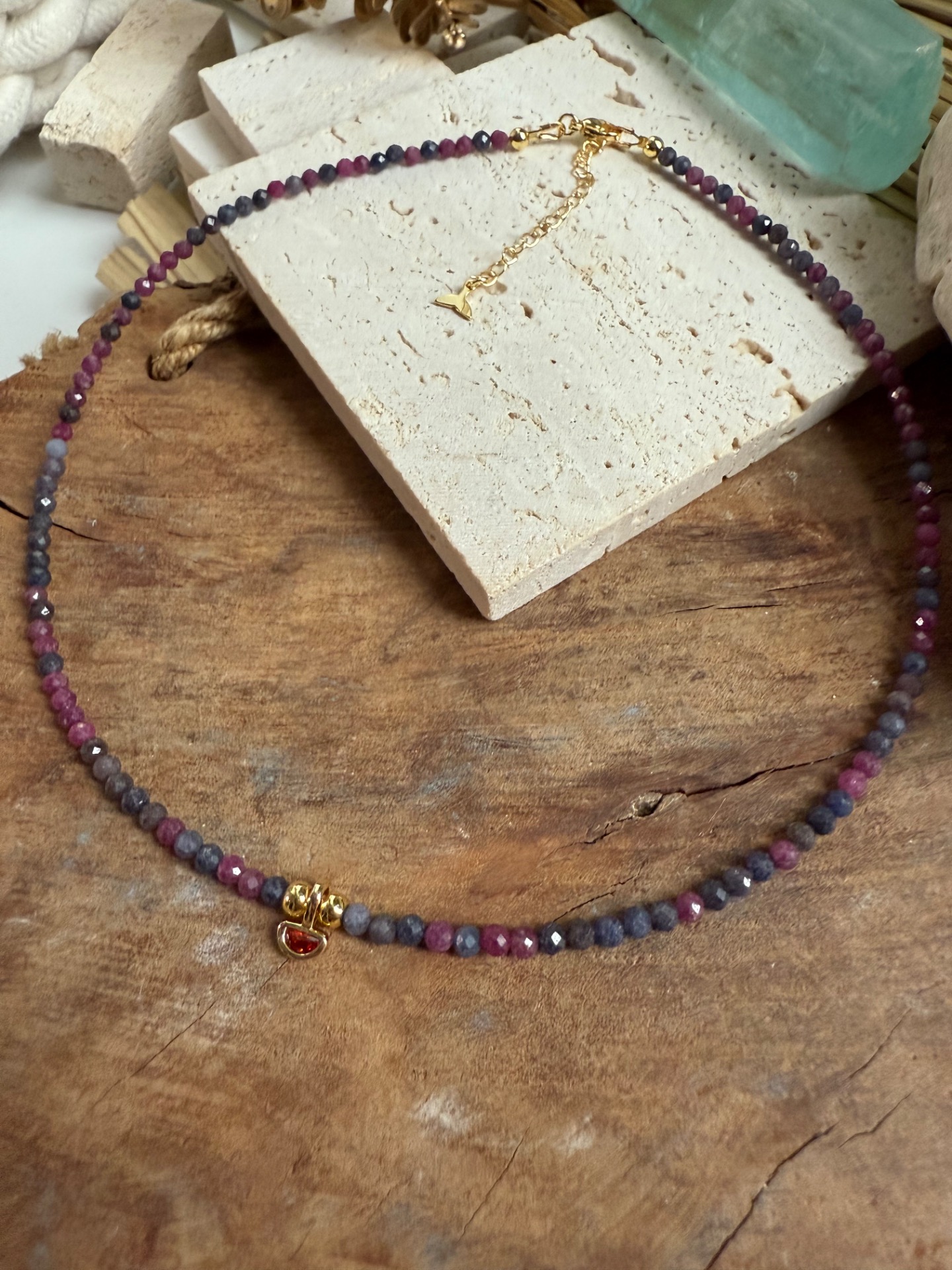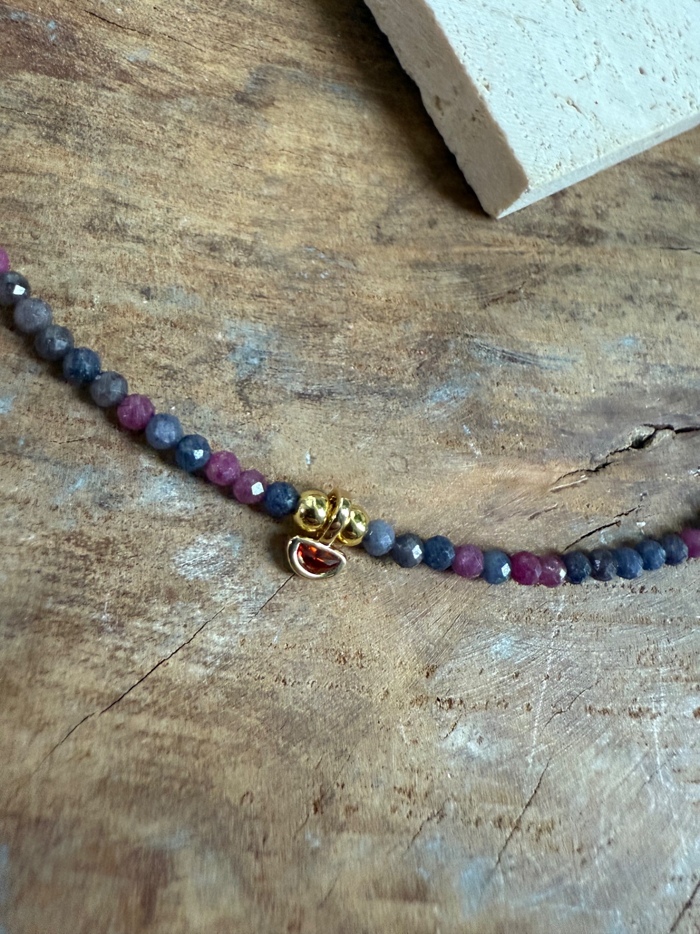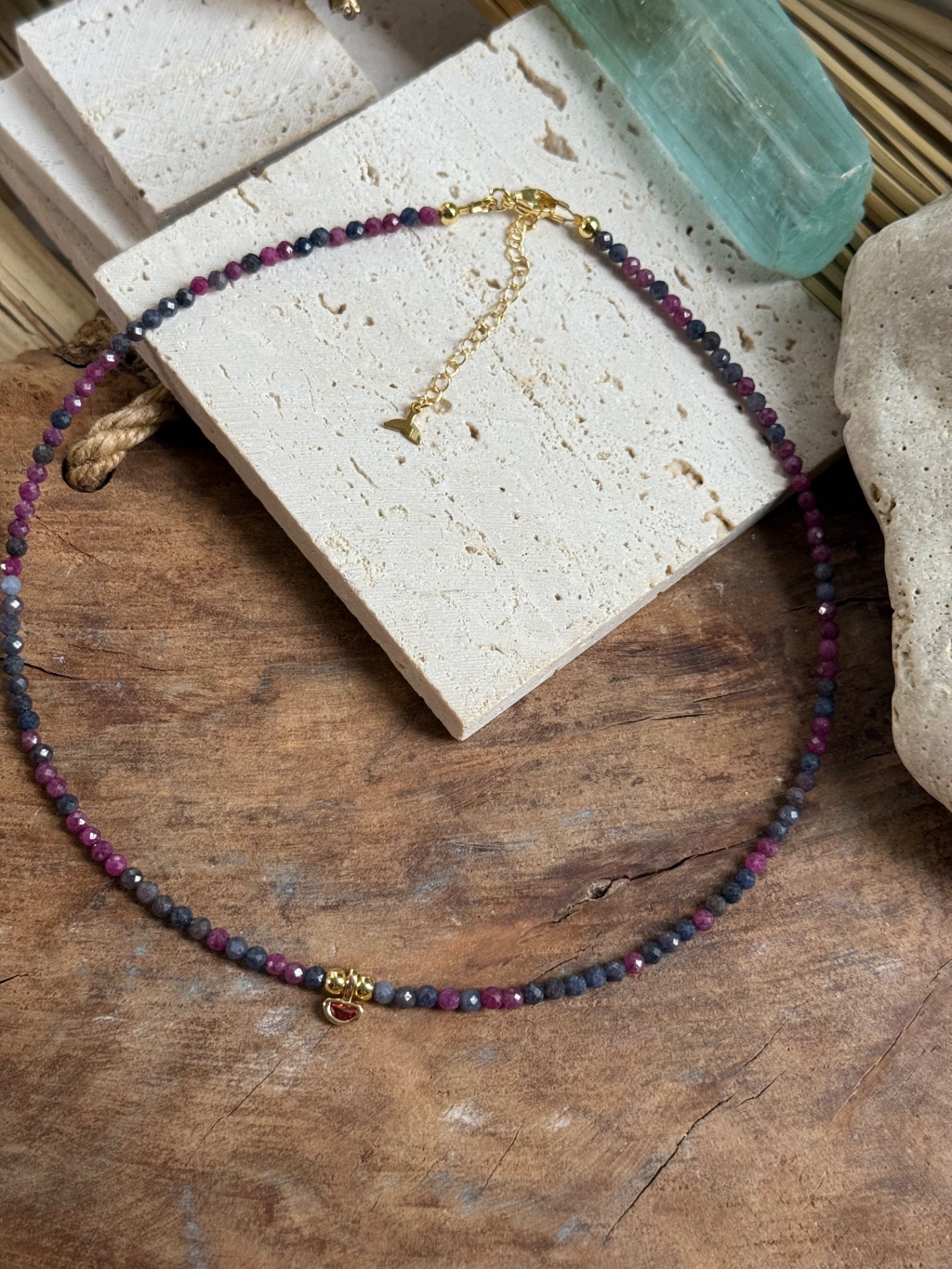 Tento elegantný náhrdelník spája rubín a zafír v 2,5 mm fazetovom výbruse, ktoré spolu vytvárajú jemný, no energeticky silný kontrast. Každá korálka odráža svetlo a dodáva šperku živý a iskrivý charakter.