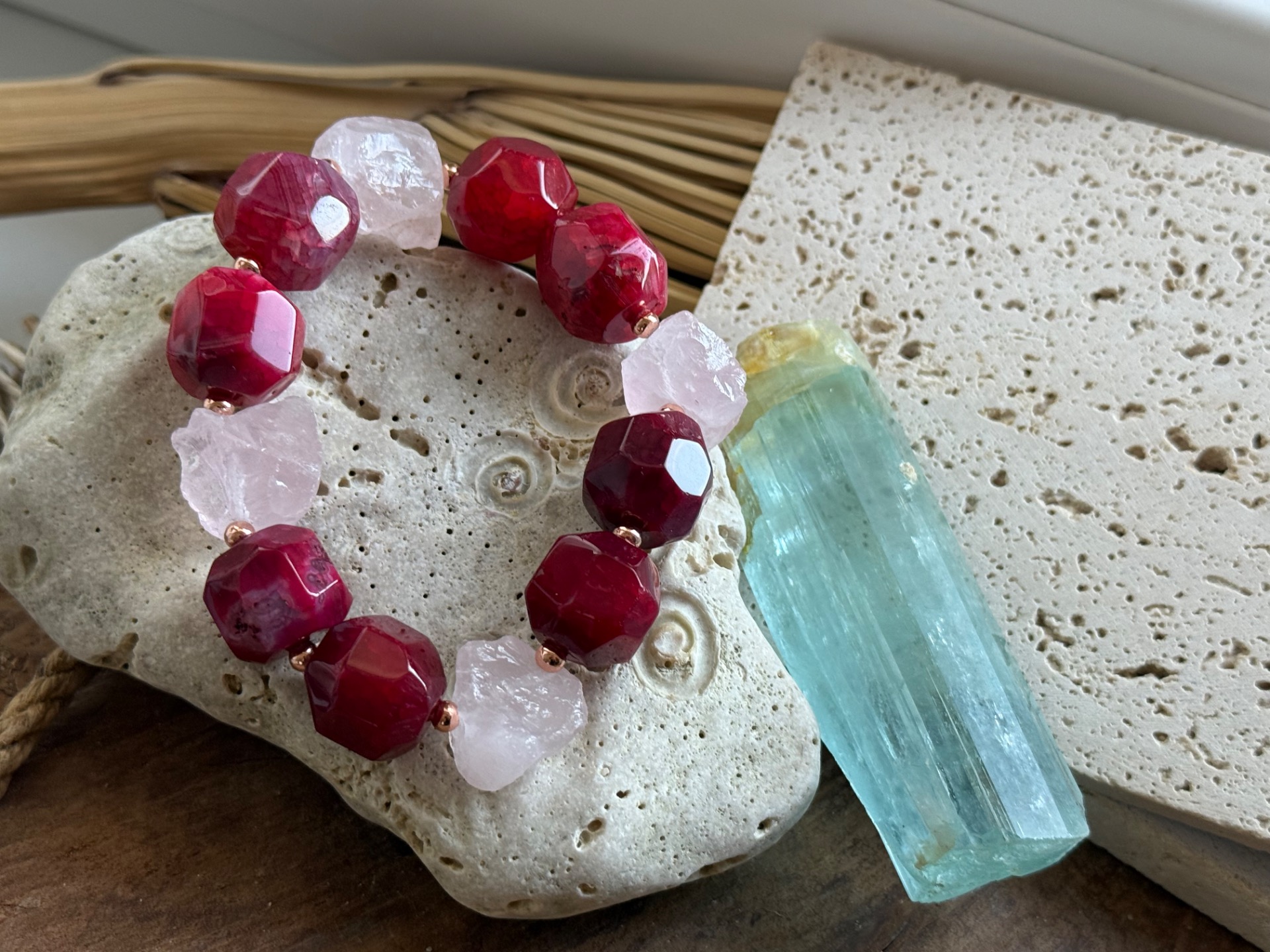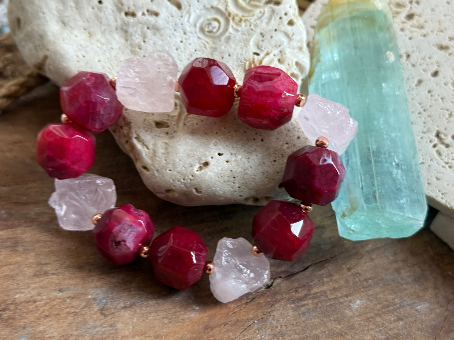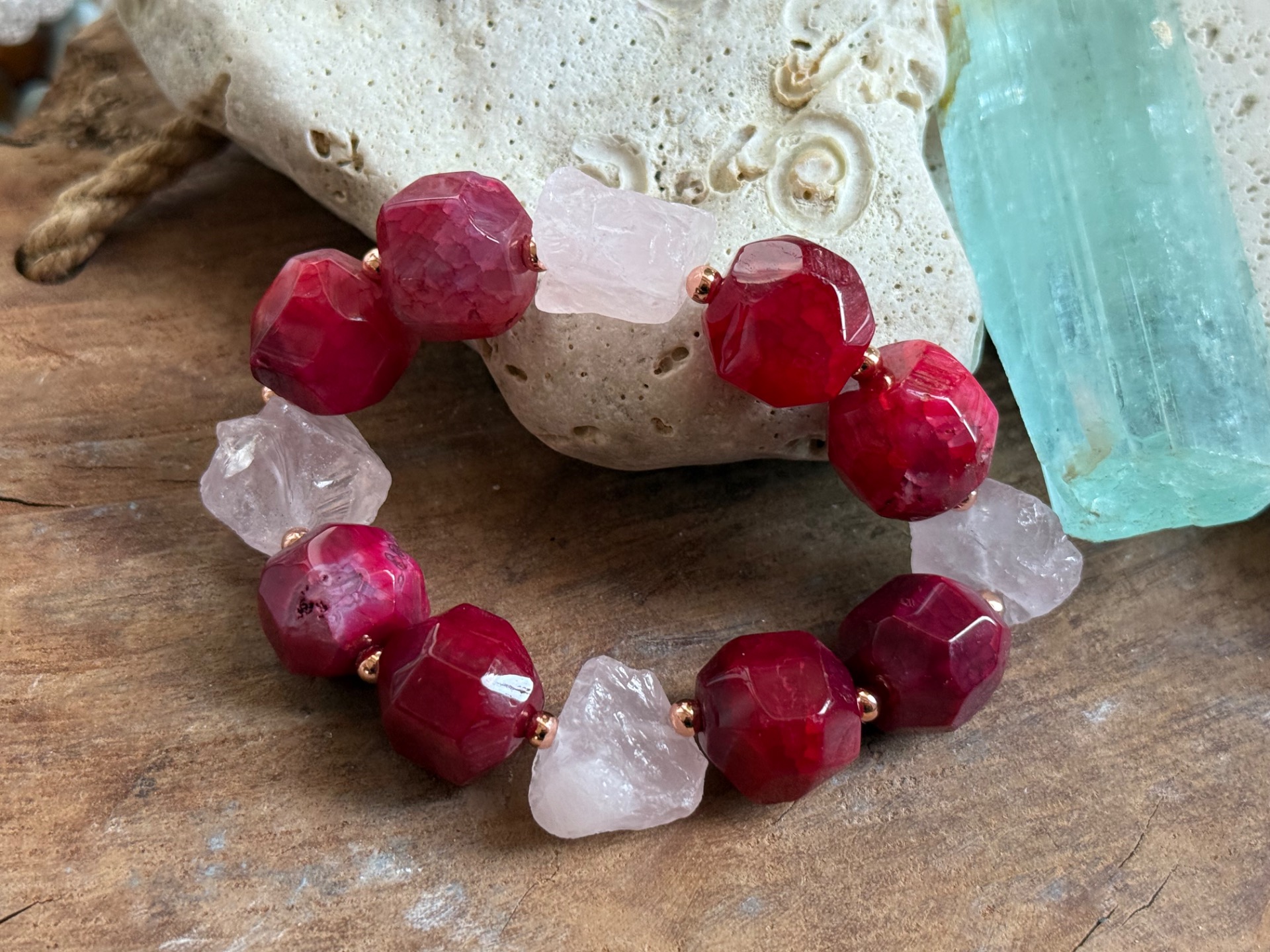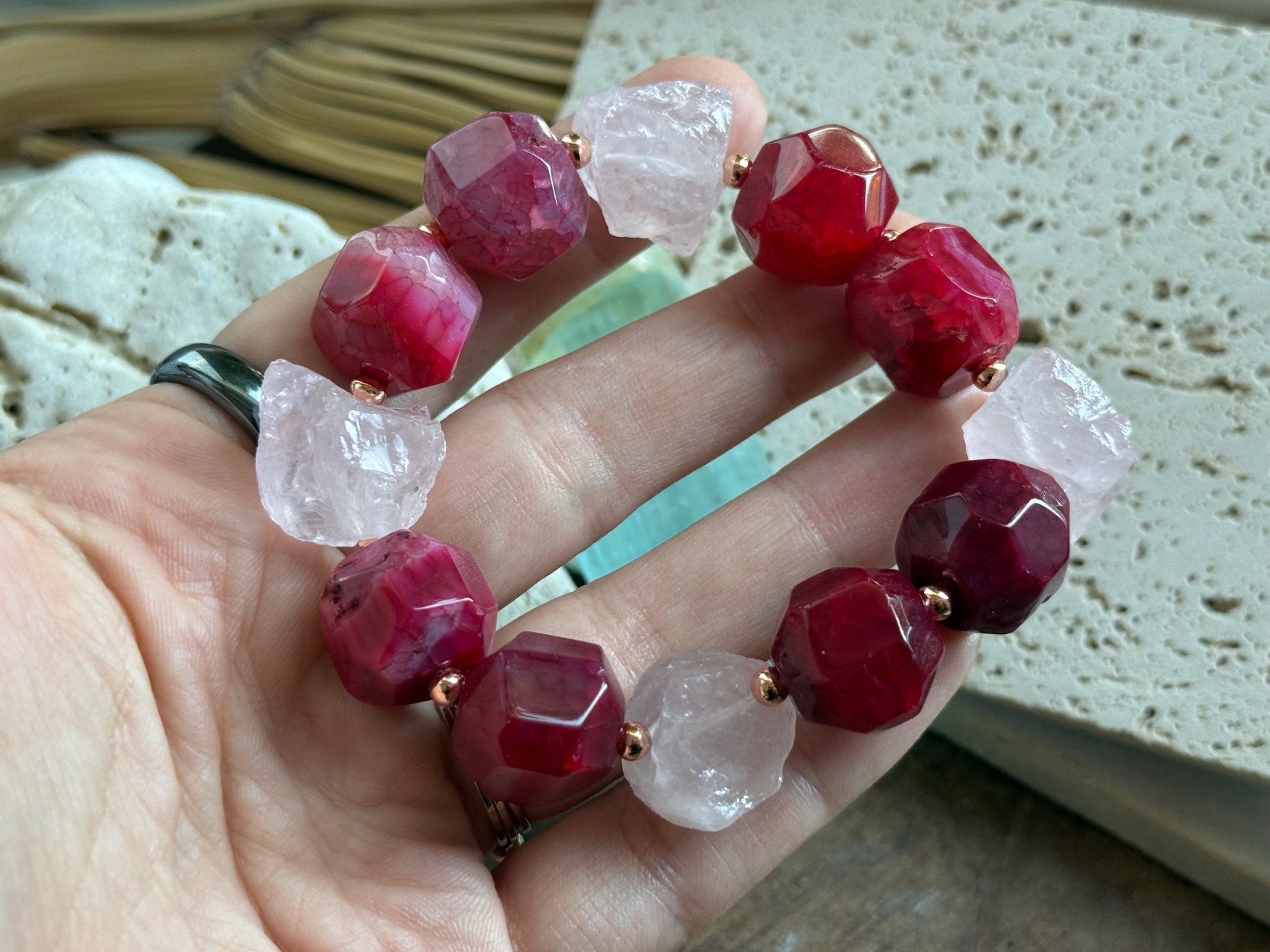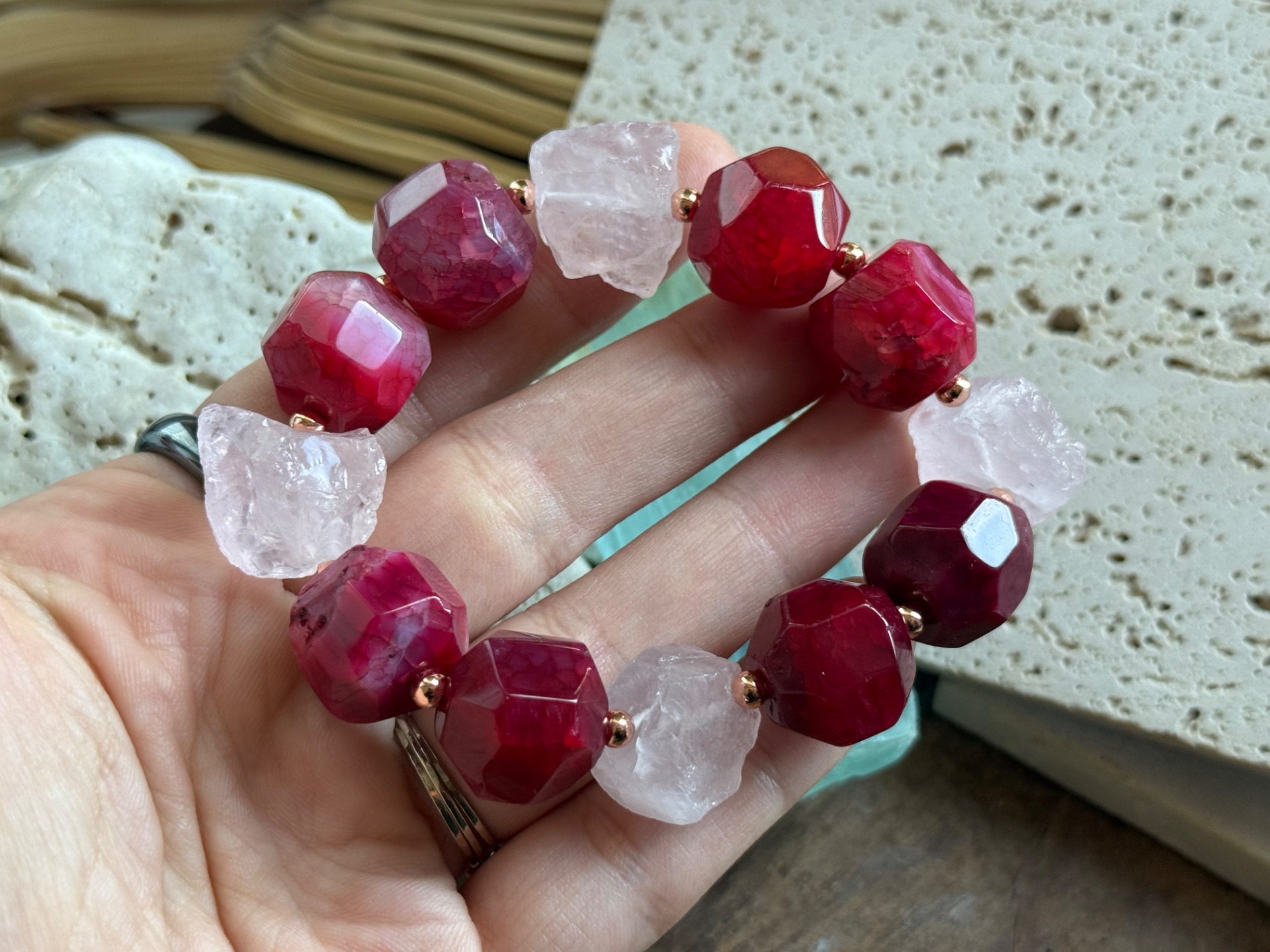 Cik cak boho náramok ružoý achát+ ruženín surový - sebaláska