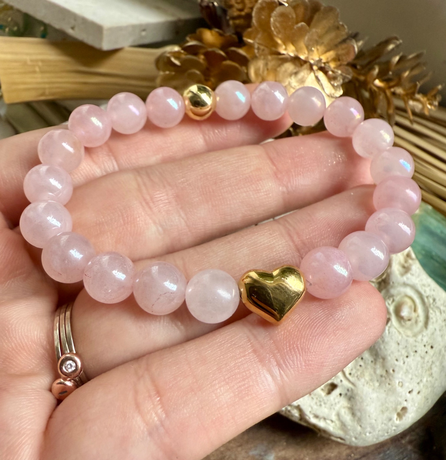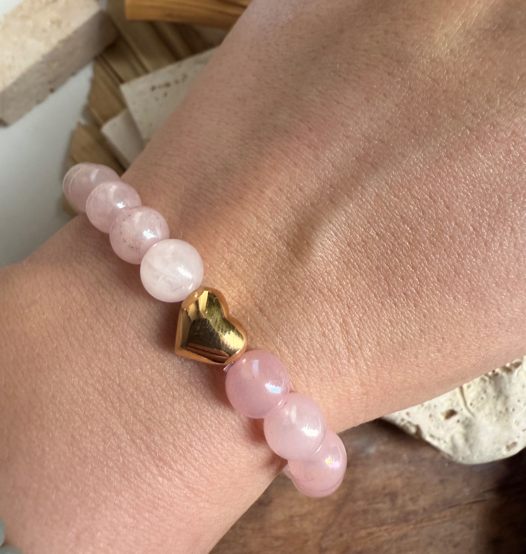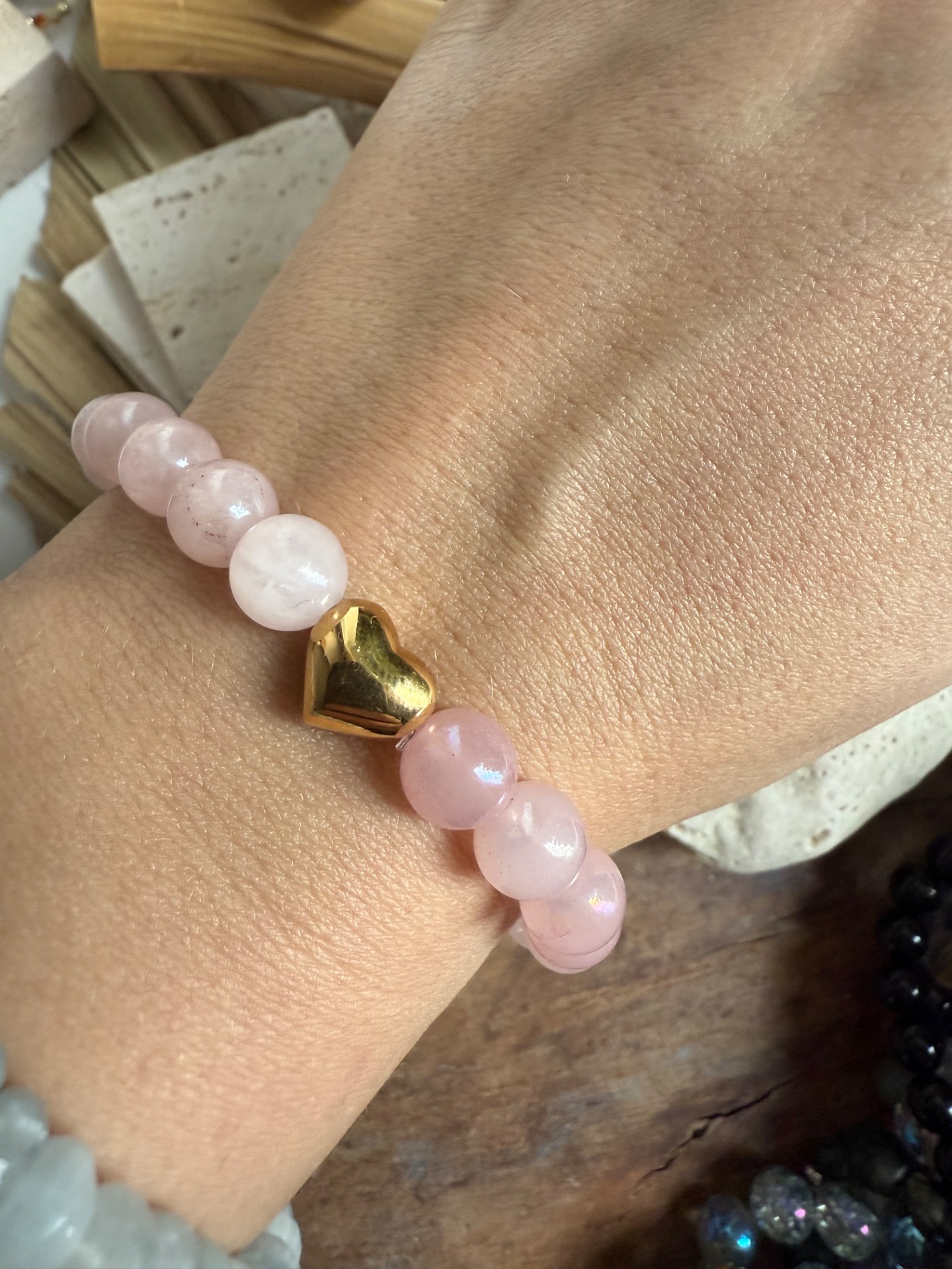 Tento elegantný náramok je vytvorený z 8 mm pokoveného ruženínu, ktorý dodáva náramku jemný lesk a sofistikovaný vzhľad. V strede náramku je nerezové srdiečko, symbol lásky, sebalásky a ochrany. Celková dĺžka náramku je 17 cm, ideálny na každodenné nosenie alebo ako darček.