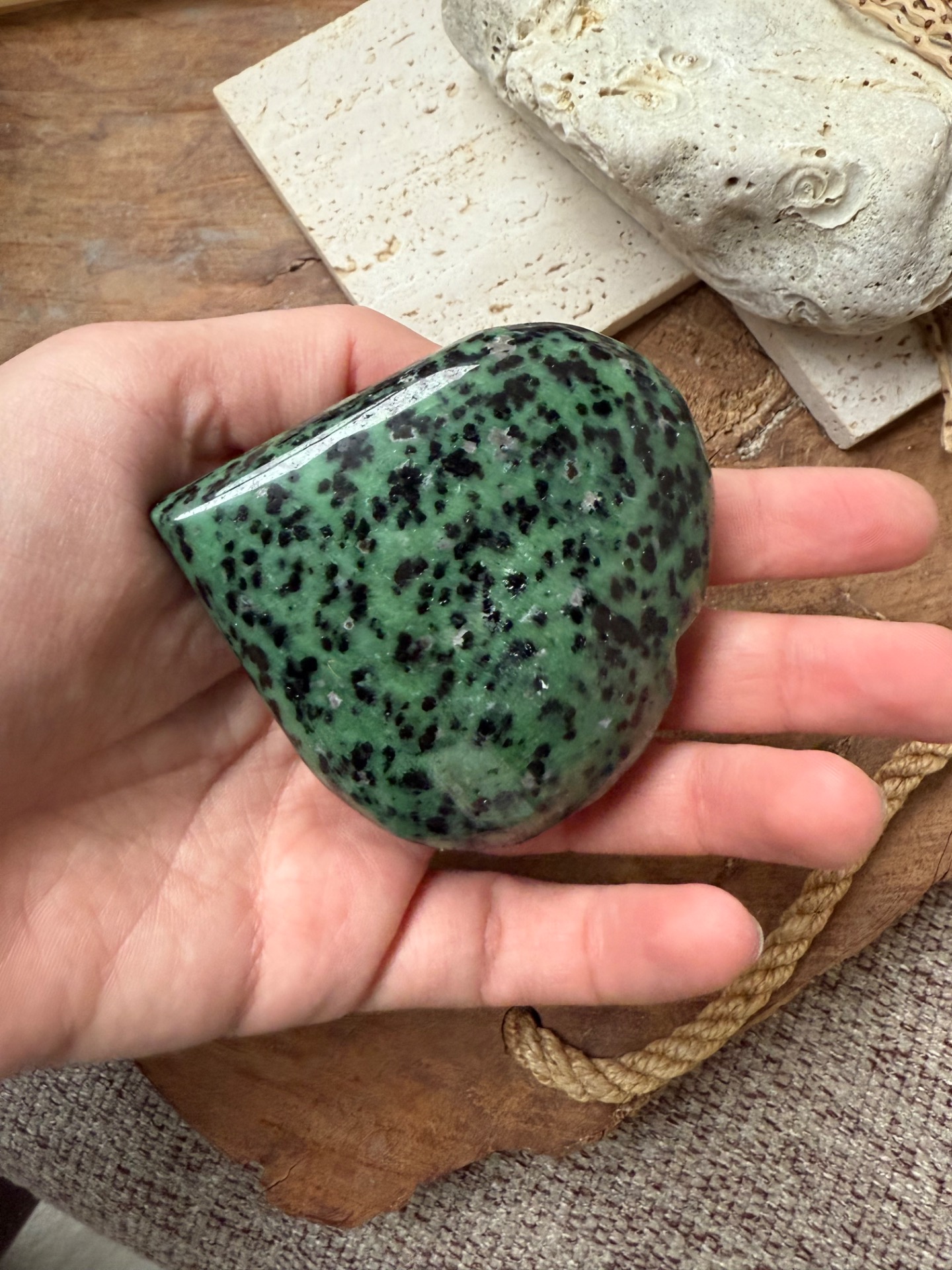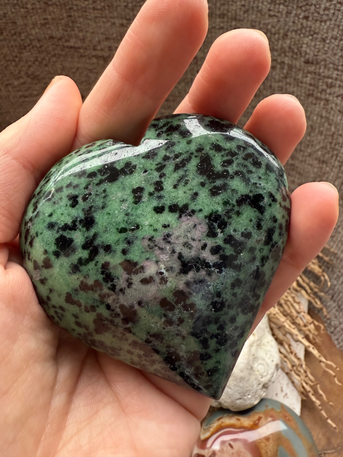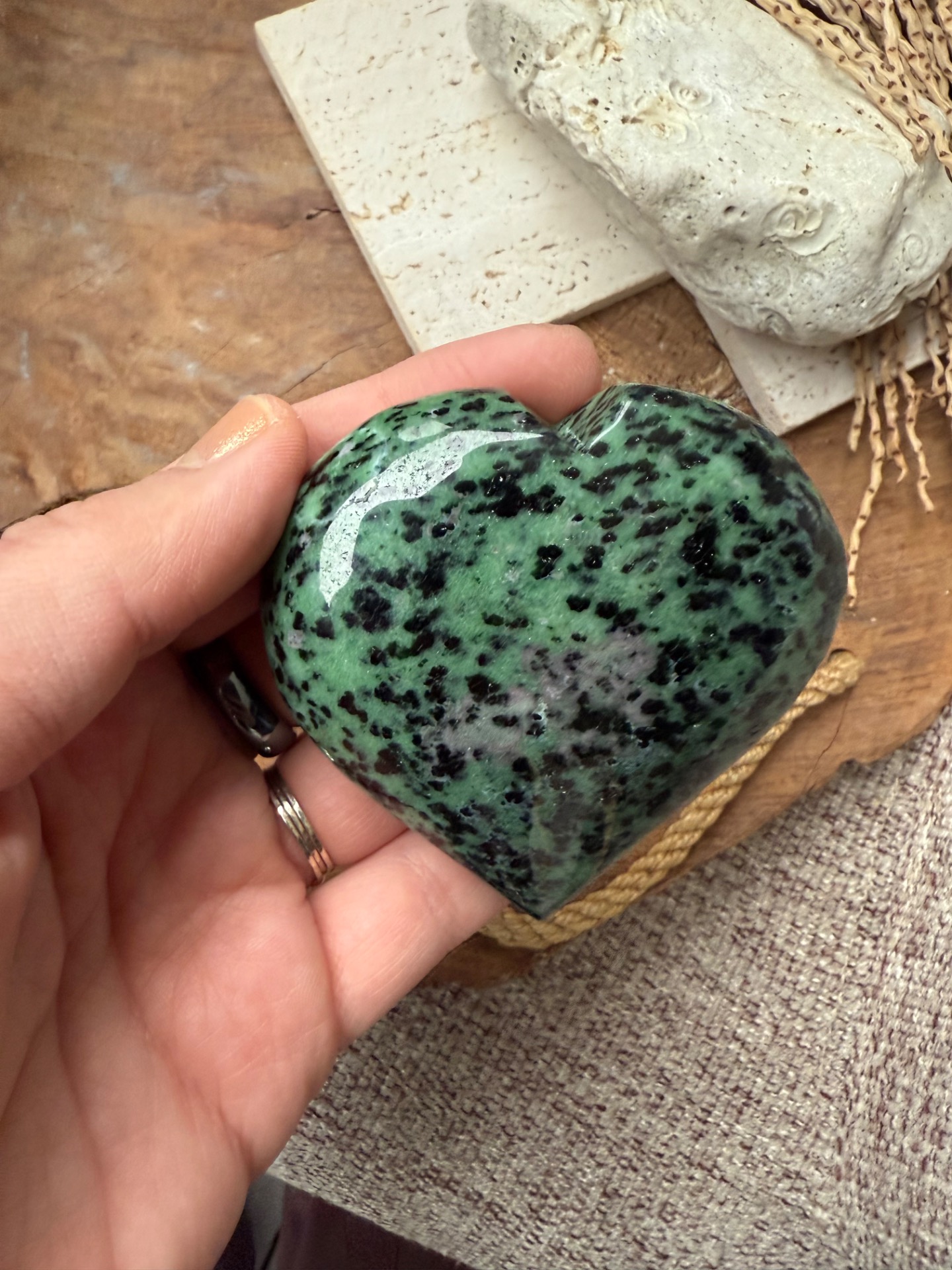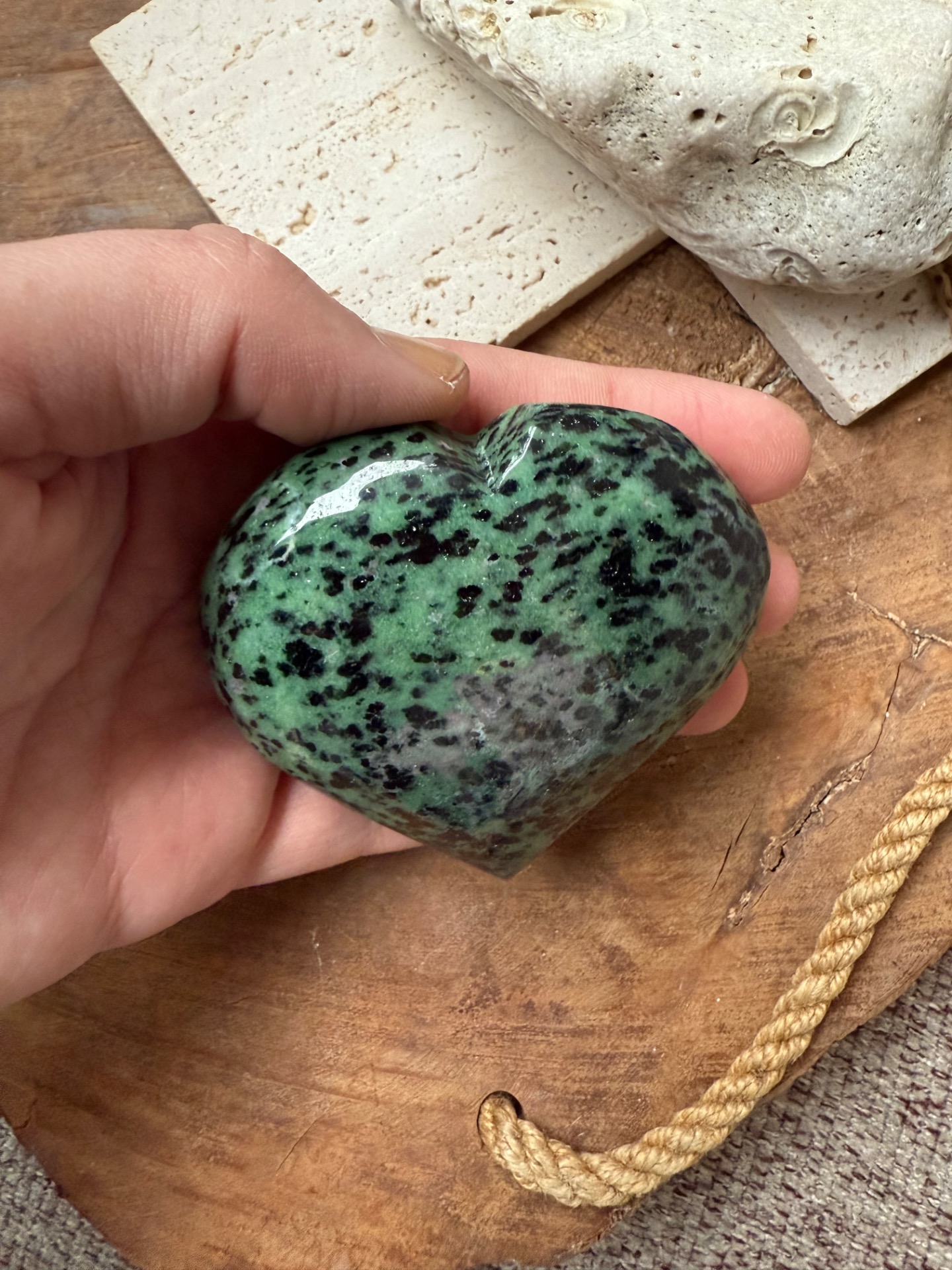 Toto srdce z rubínu v zoisite kombinuje energiu vášne, srdcovej vitality a životnej radosti. Rubín prináša odvahu, silu a podporuje sebadôveru, zatiaľ čo zoisit harmonizuje emócie, znižuje stres a podporuje vnútornú rovnováhu.