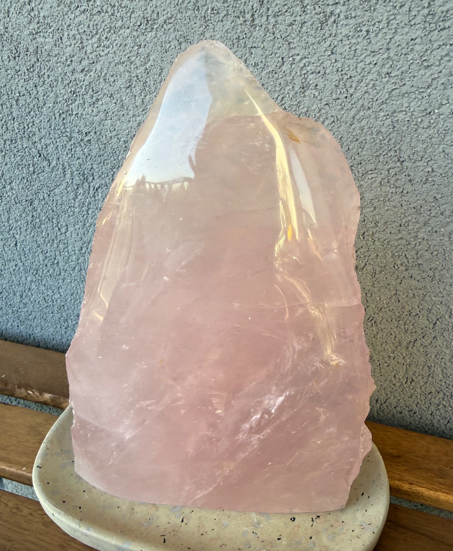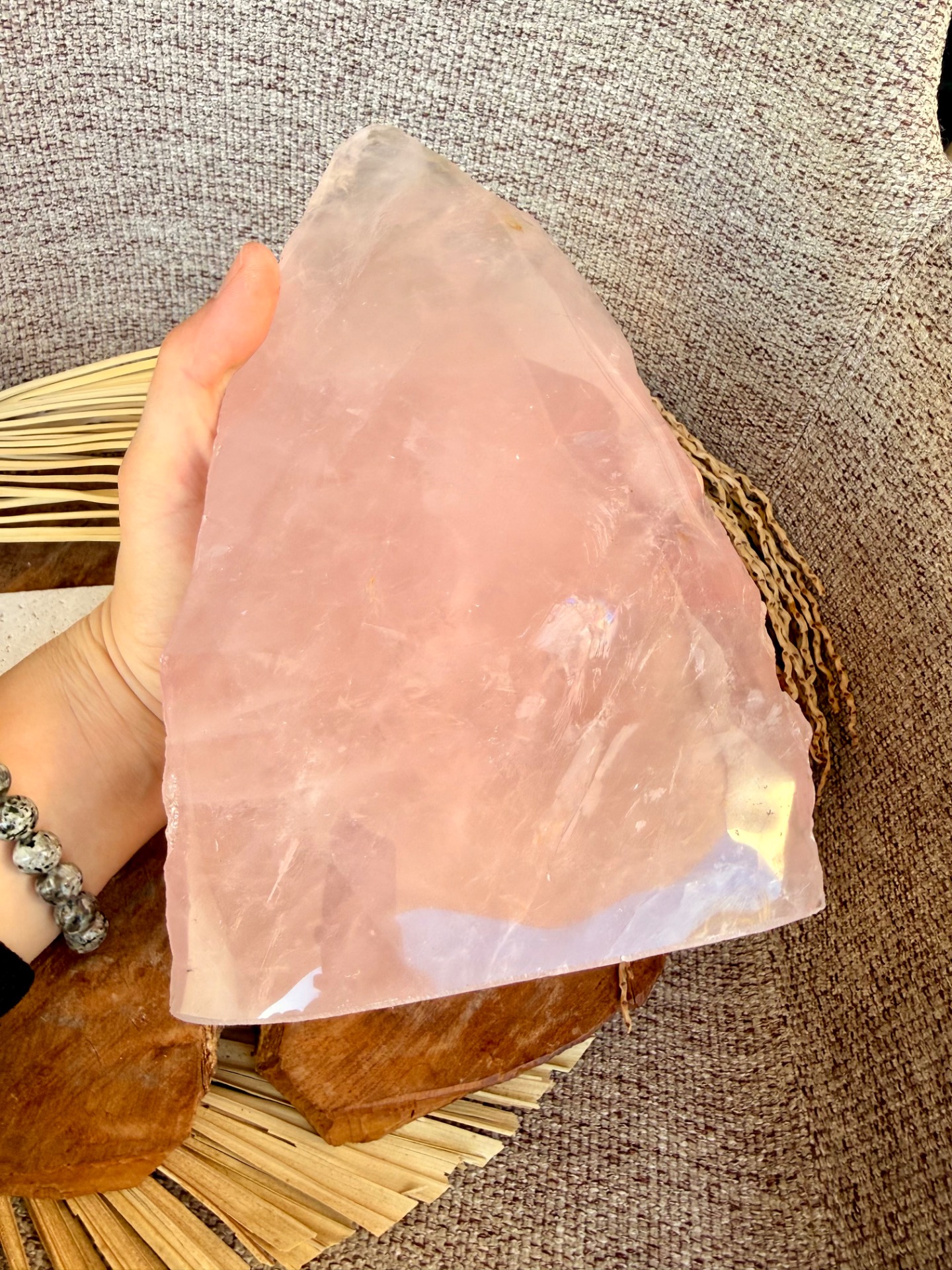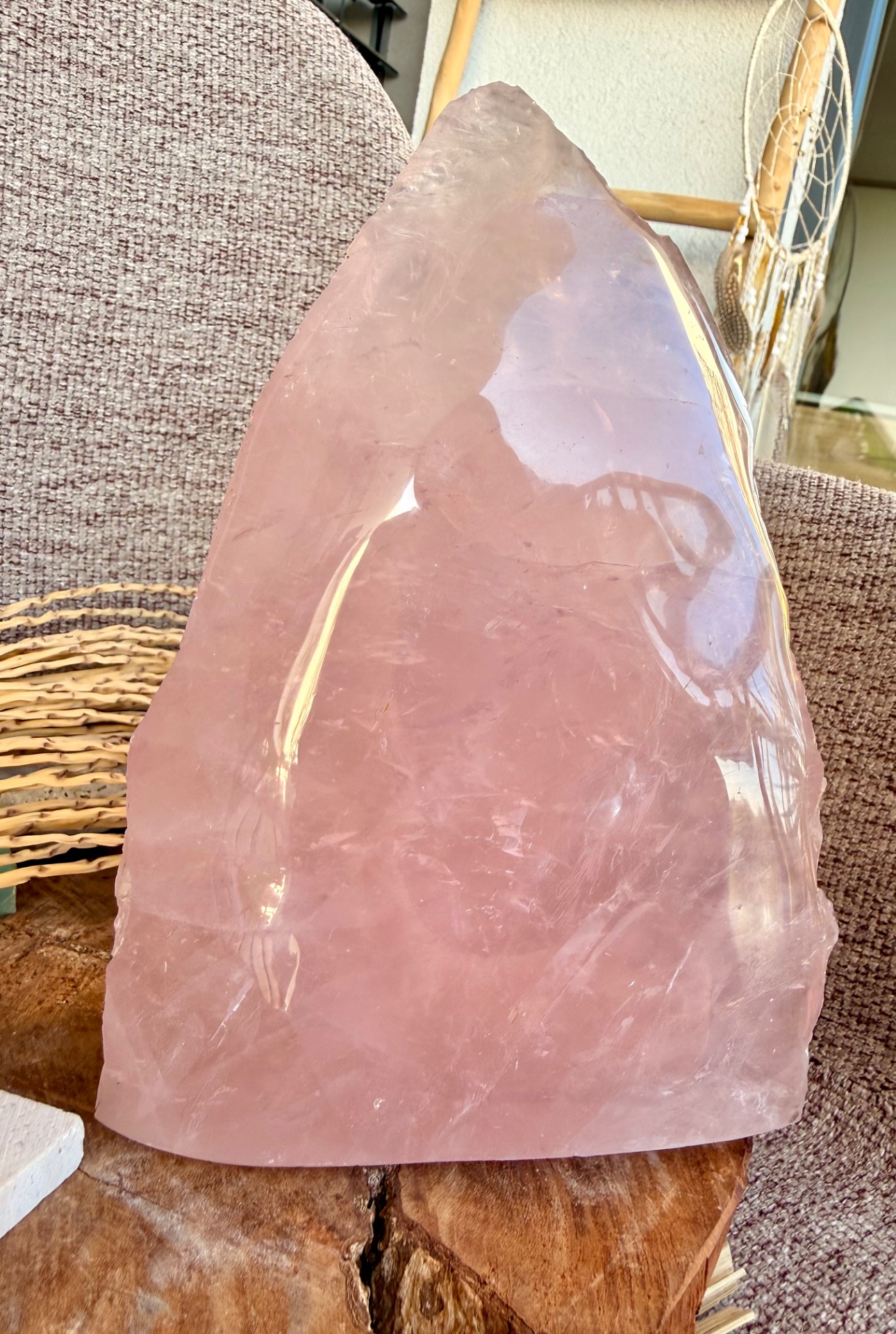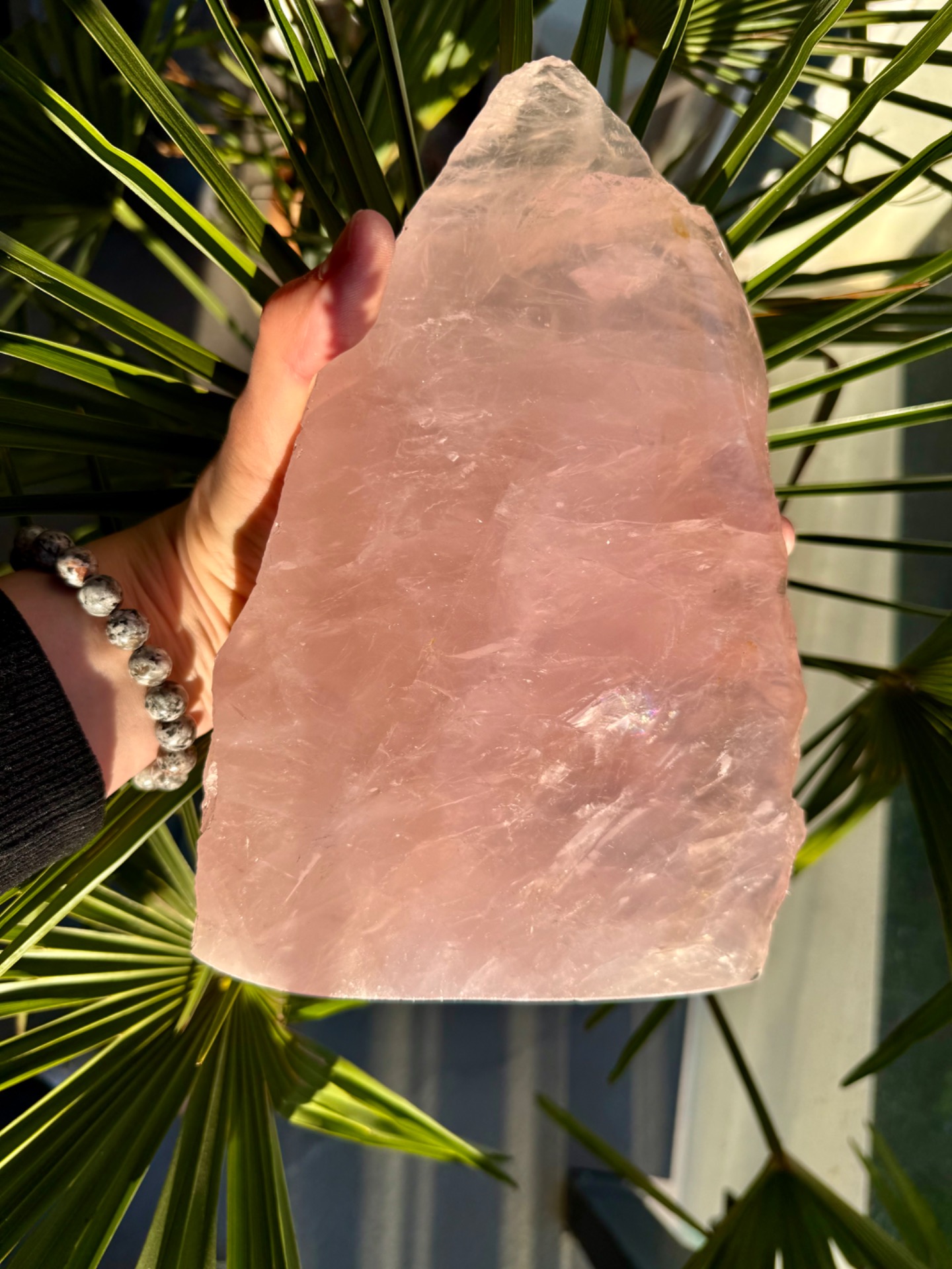 Výnimočný, veľký ruženín v tvare pyramídy s hmotnosťou 2,9 kg je silný energetický klenot, ktorý spája dve tváre jedného kameňa – jemnú leštenú stranu a prirodzene surovú, neopracovanú energiu minerálu.