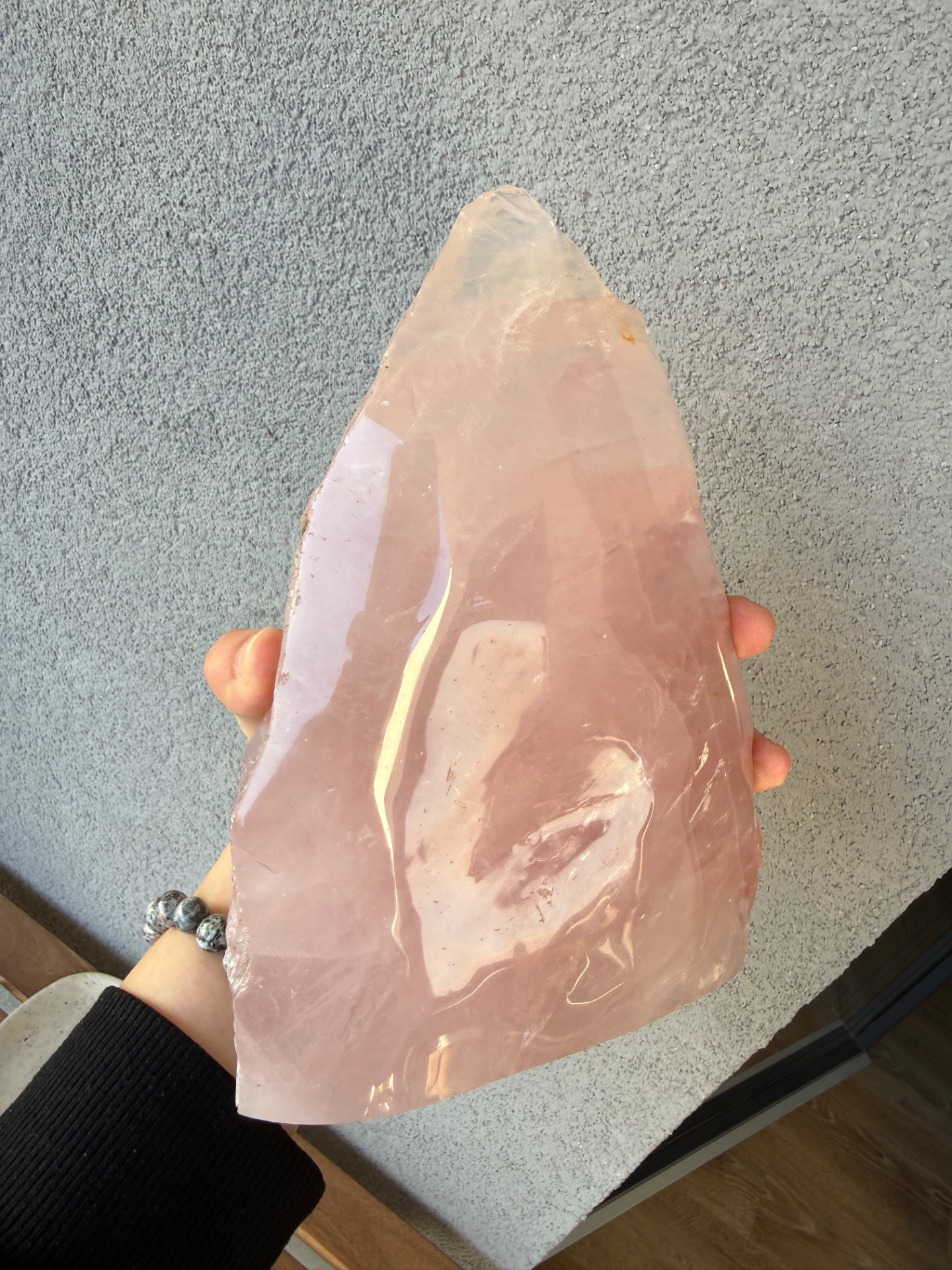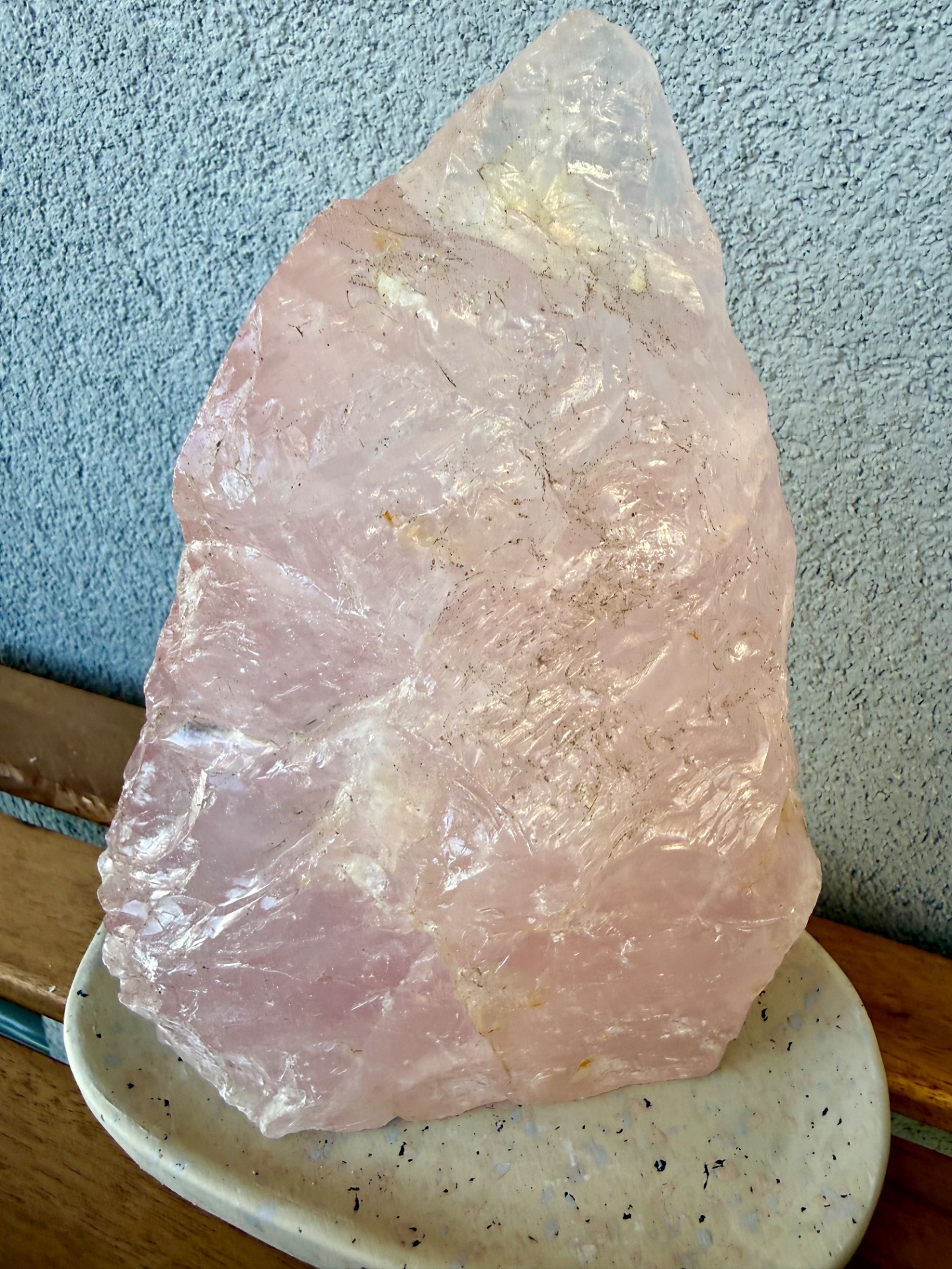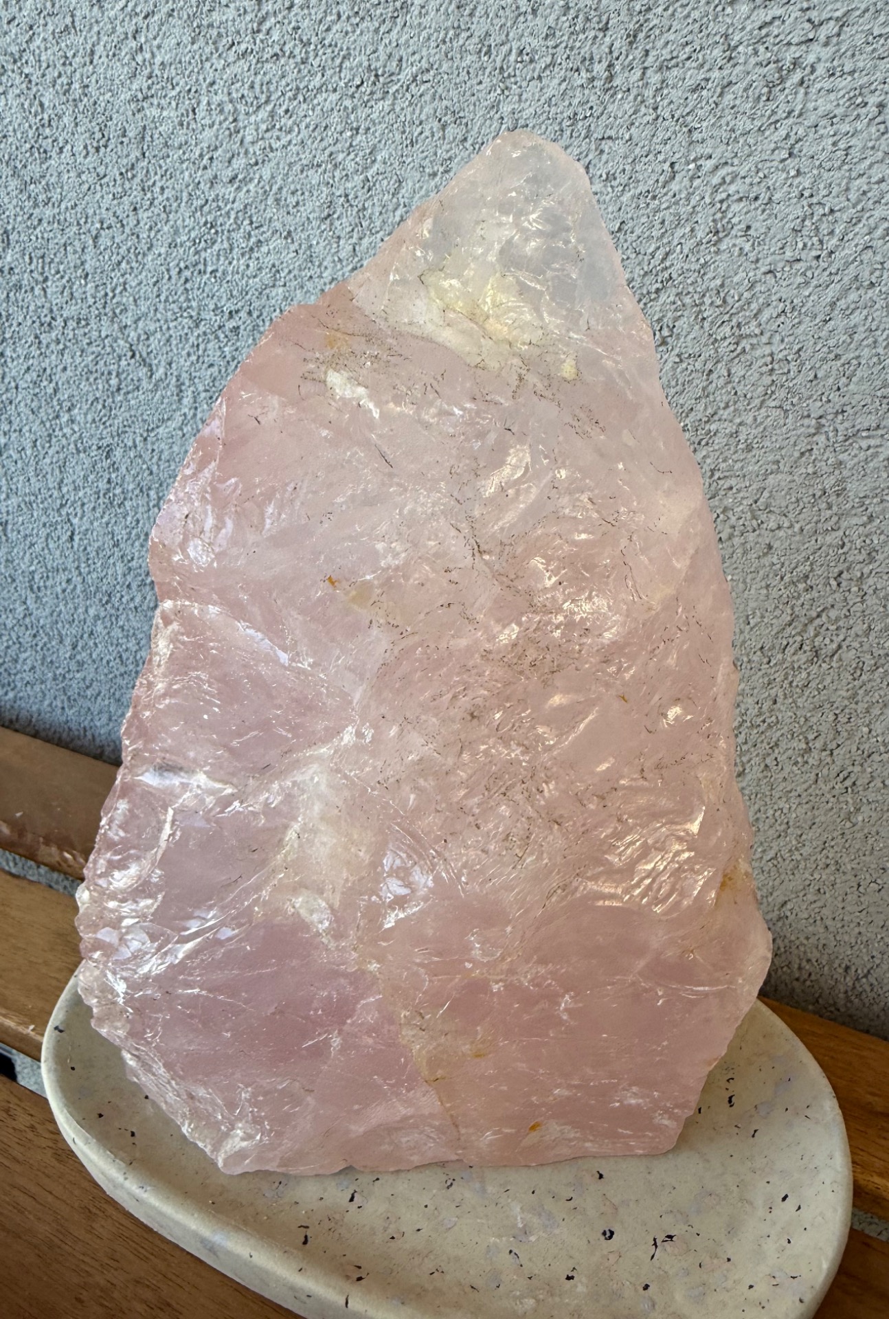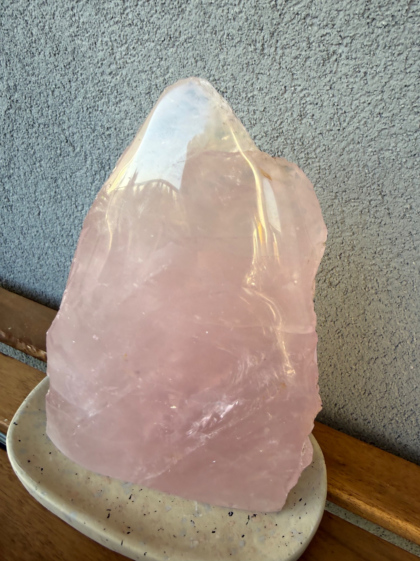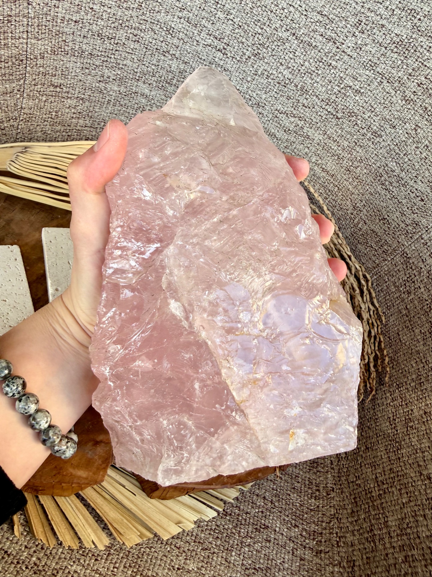 Výnimočný, veľký ruženín v tvare pyramídy s hmotnosťou 2,9 kg je silný energetický klenot, ktorý spája dve tváre jedného kameňa – jemnú leštenú stranu a prirodzene surovú, neopracovanú energiu minerálu.