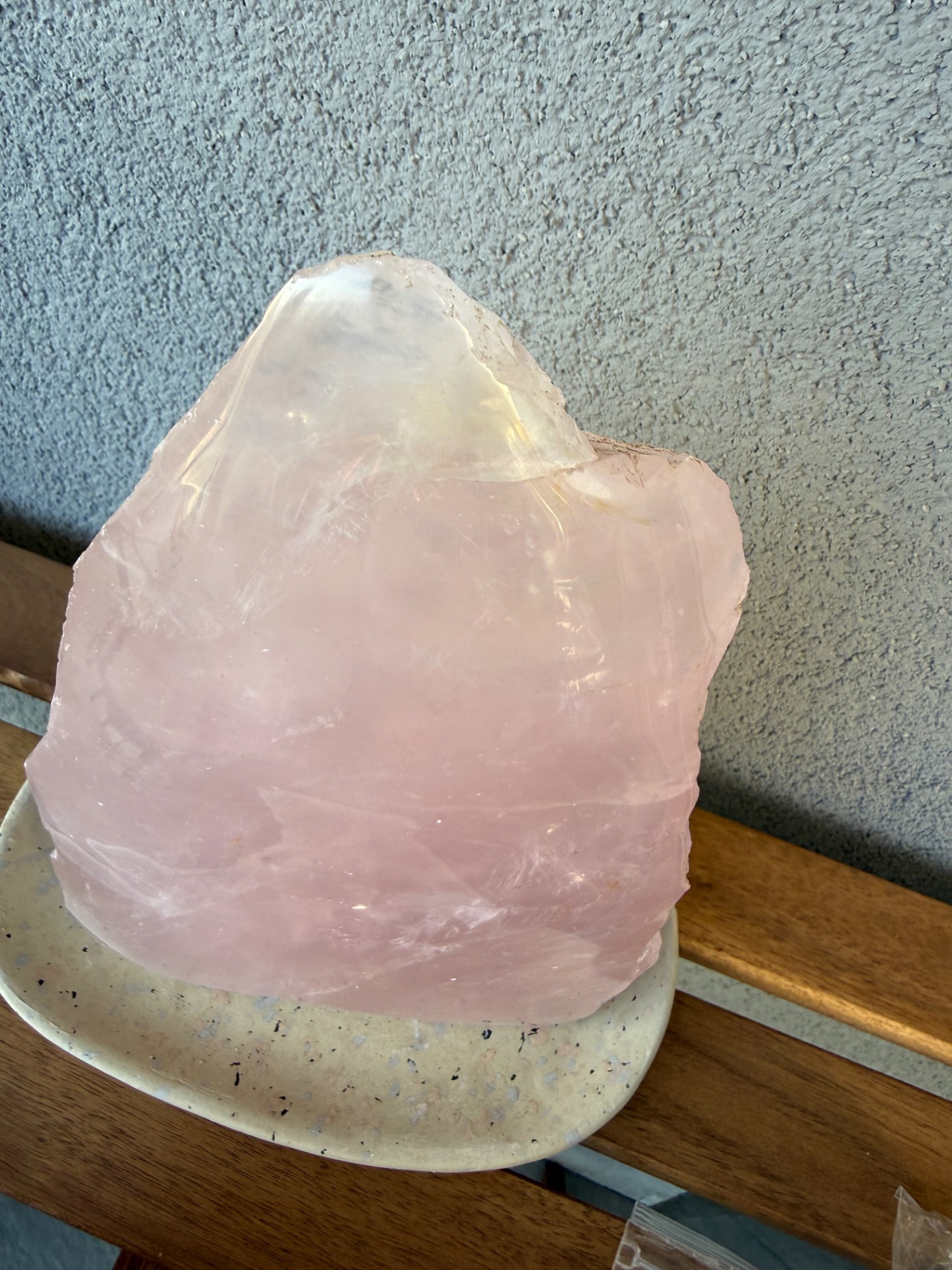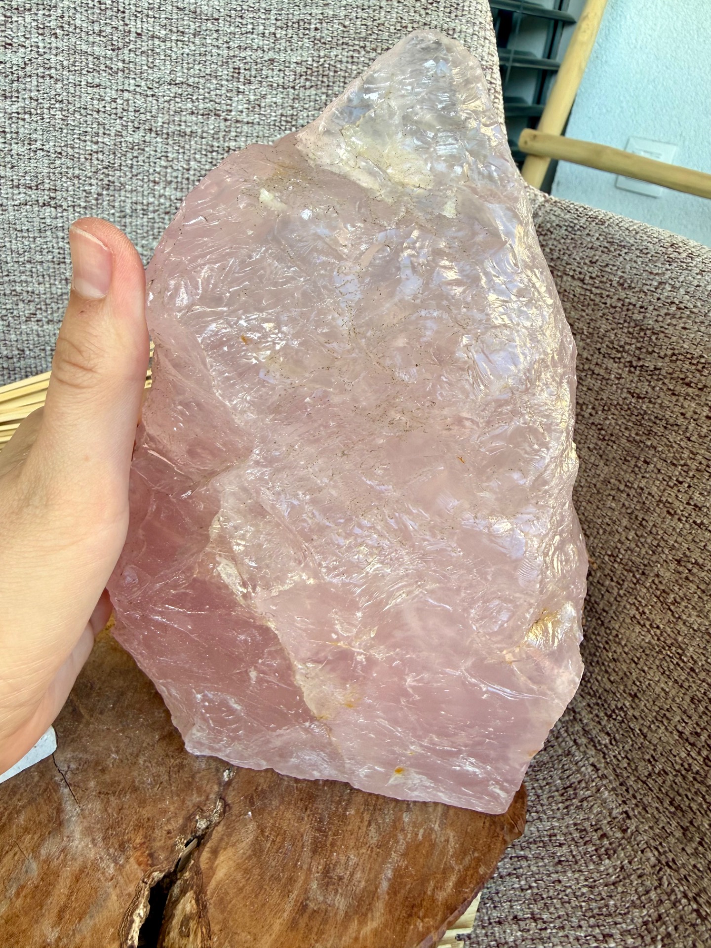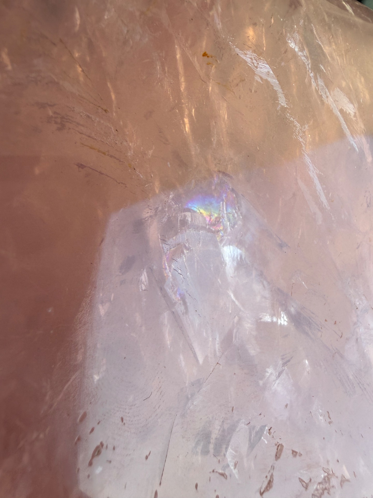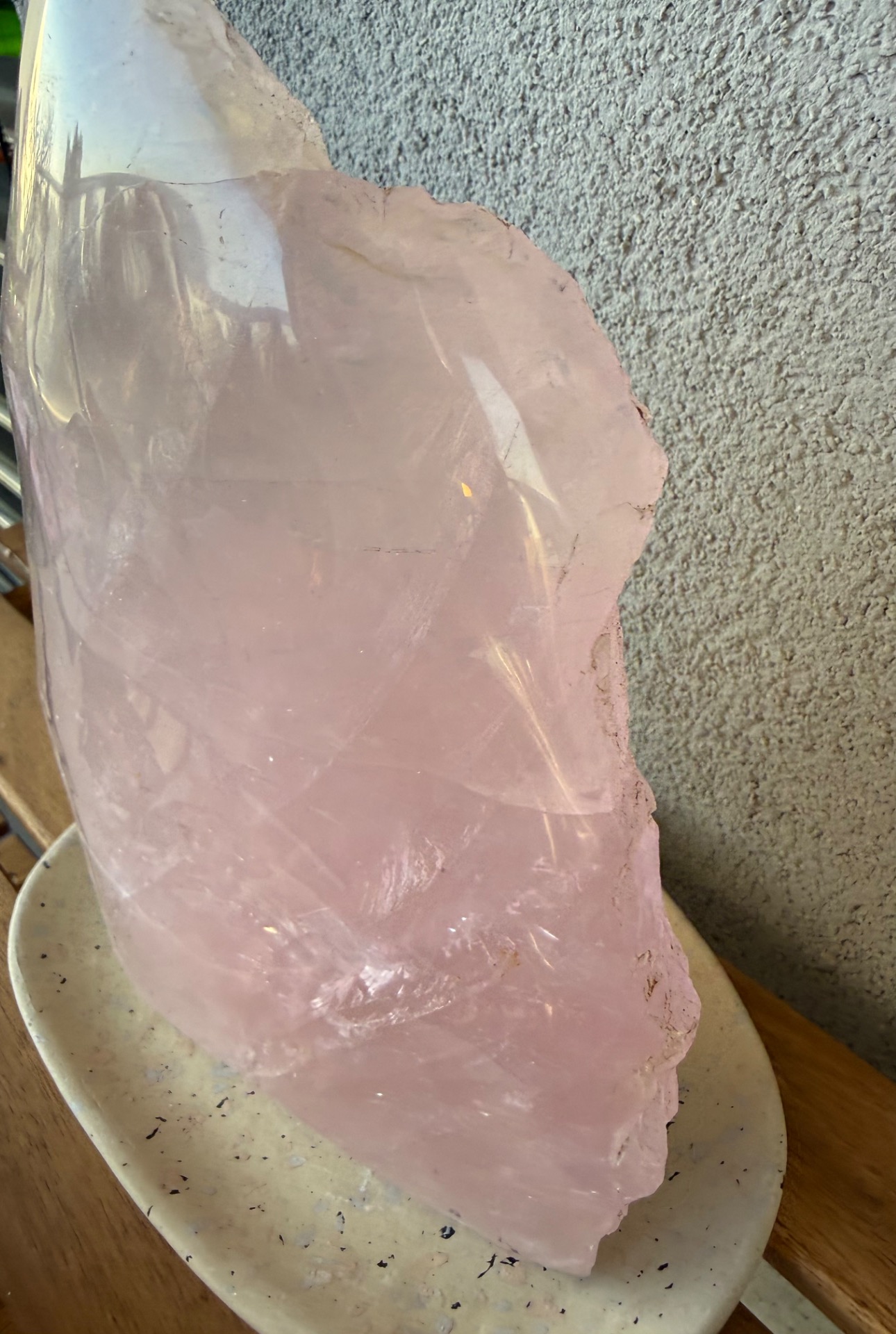 Výnimočný, veľký ruženín v tvare pyramídy s hmotnosťou 2,9 kg je silný energetický klenot, ktorý spája dve tváre jedného kameňa – jemnú leštenú stranu a prirodzene surovú, neopracovanú energiu minerálu.