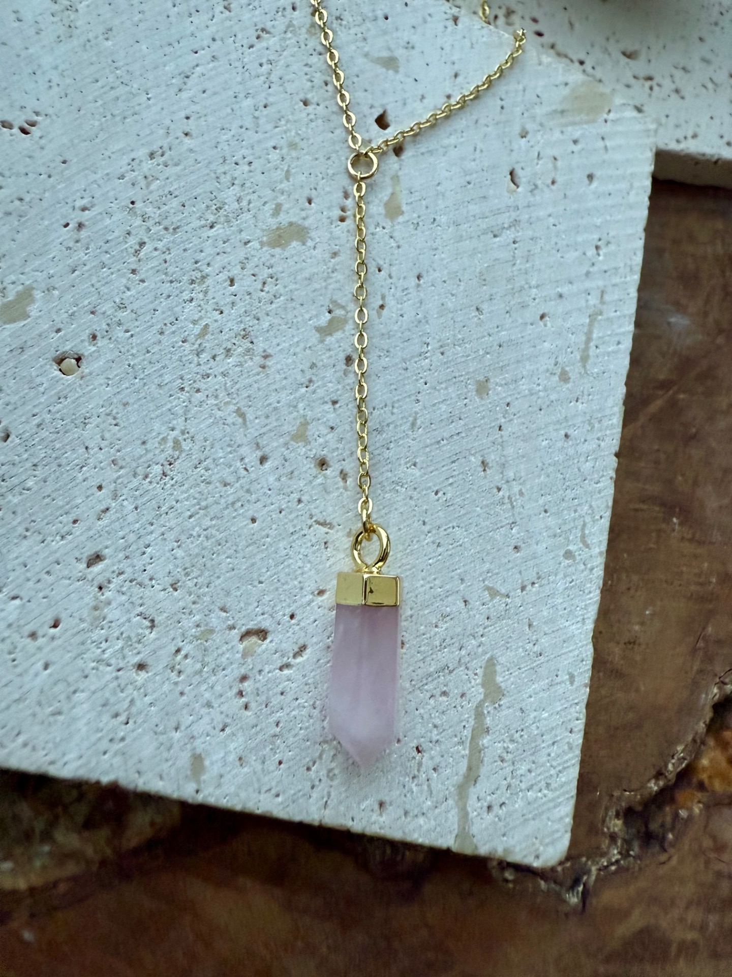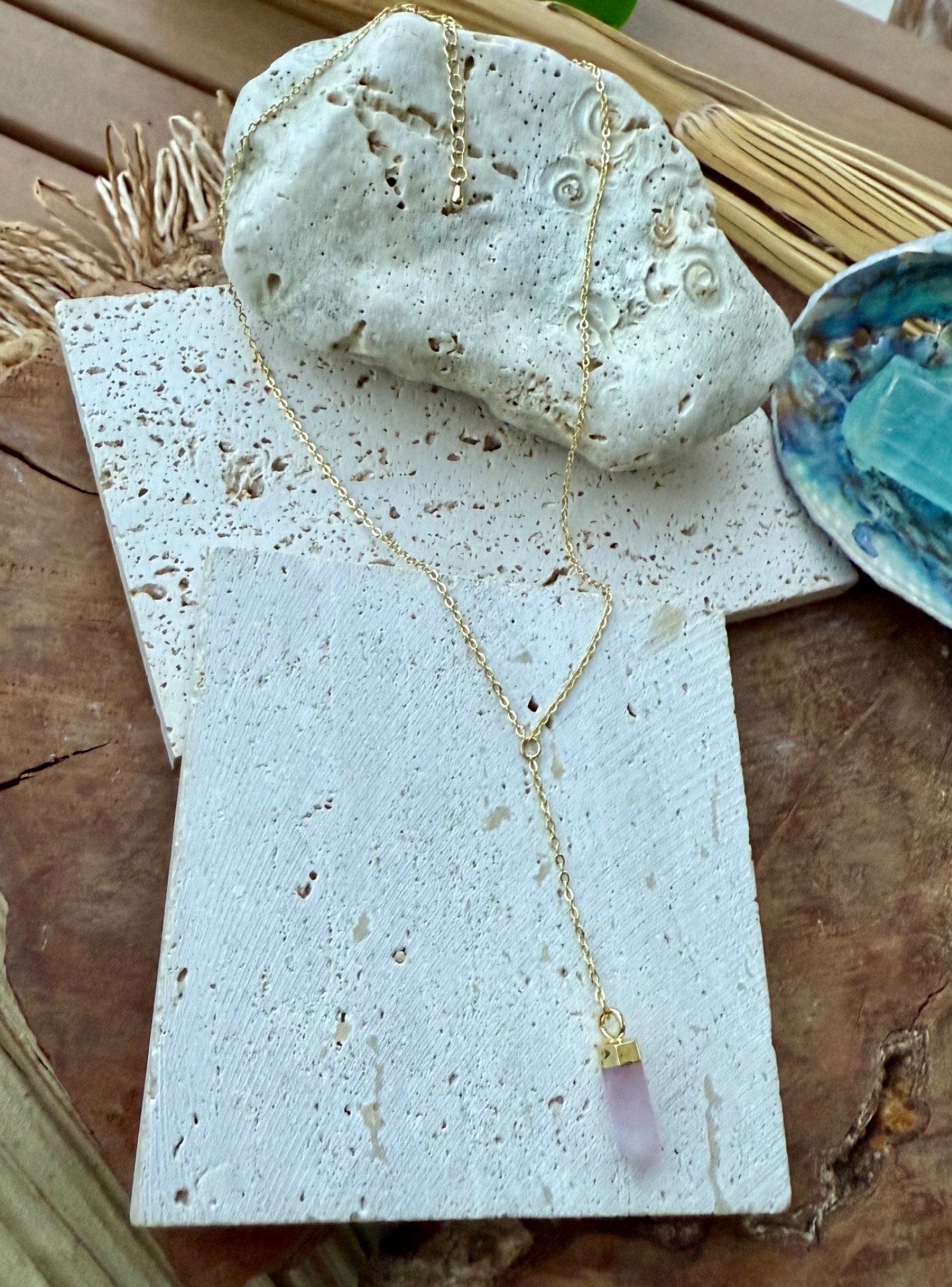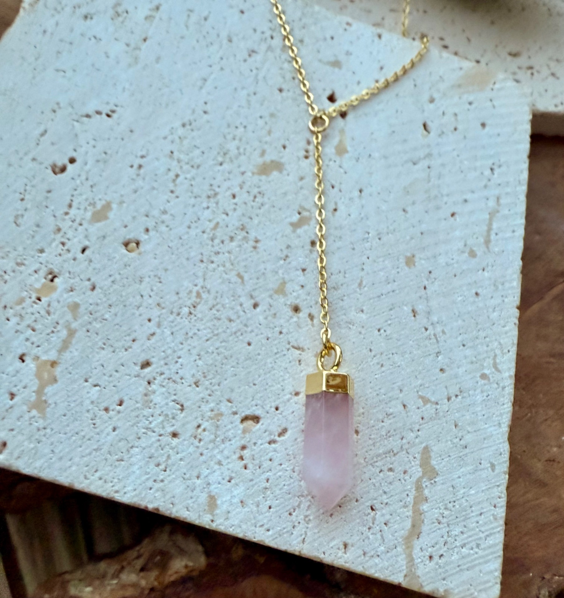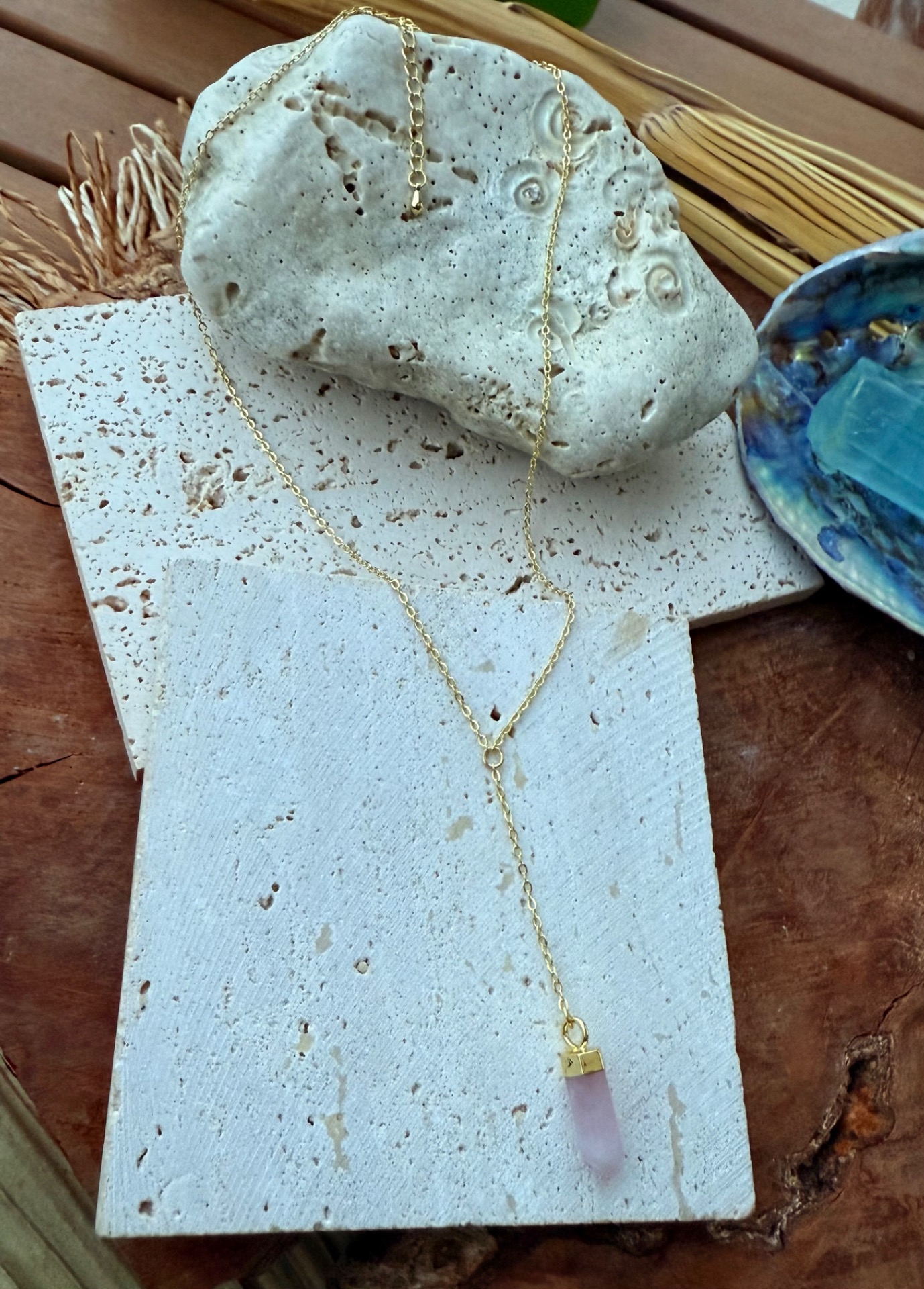 Elegantná Y retiazka s jemným zlatým leskom 18k gold plated prináša svetlo a energiu do každého dňa. Na jej konci visiaci hrot ruženínu prebúdza radosť, optimizmus a životnú energiu, pričom dodáva šperku jemný, nežný lesk.