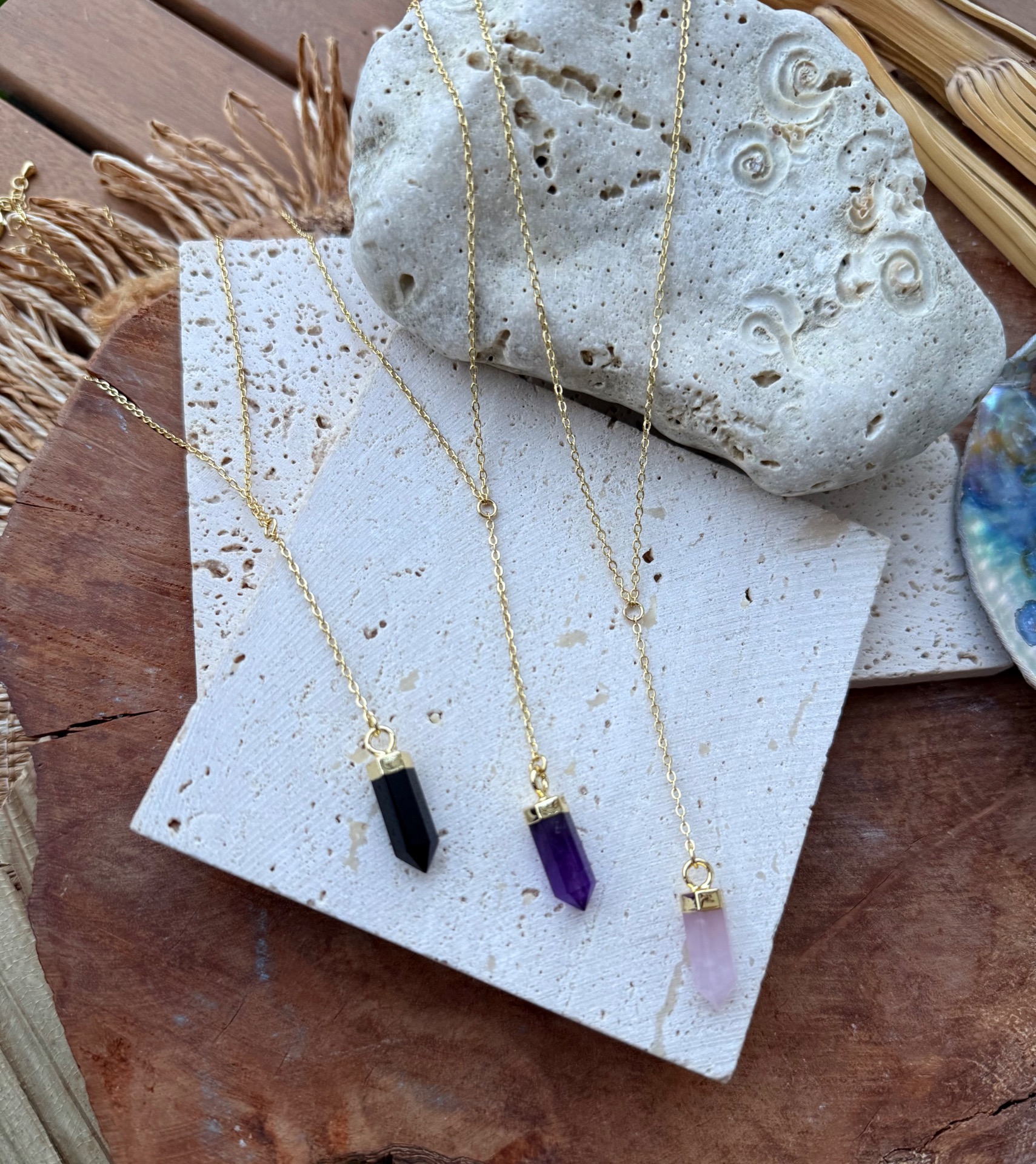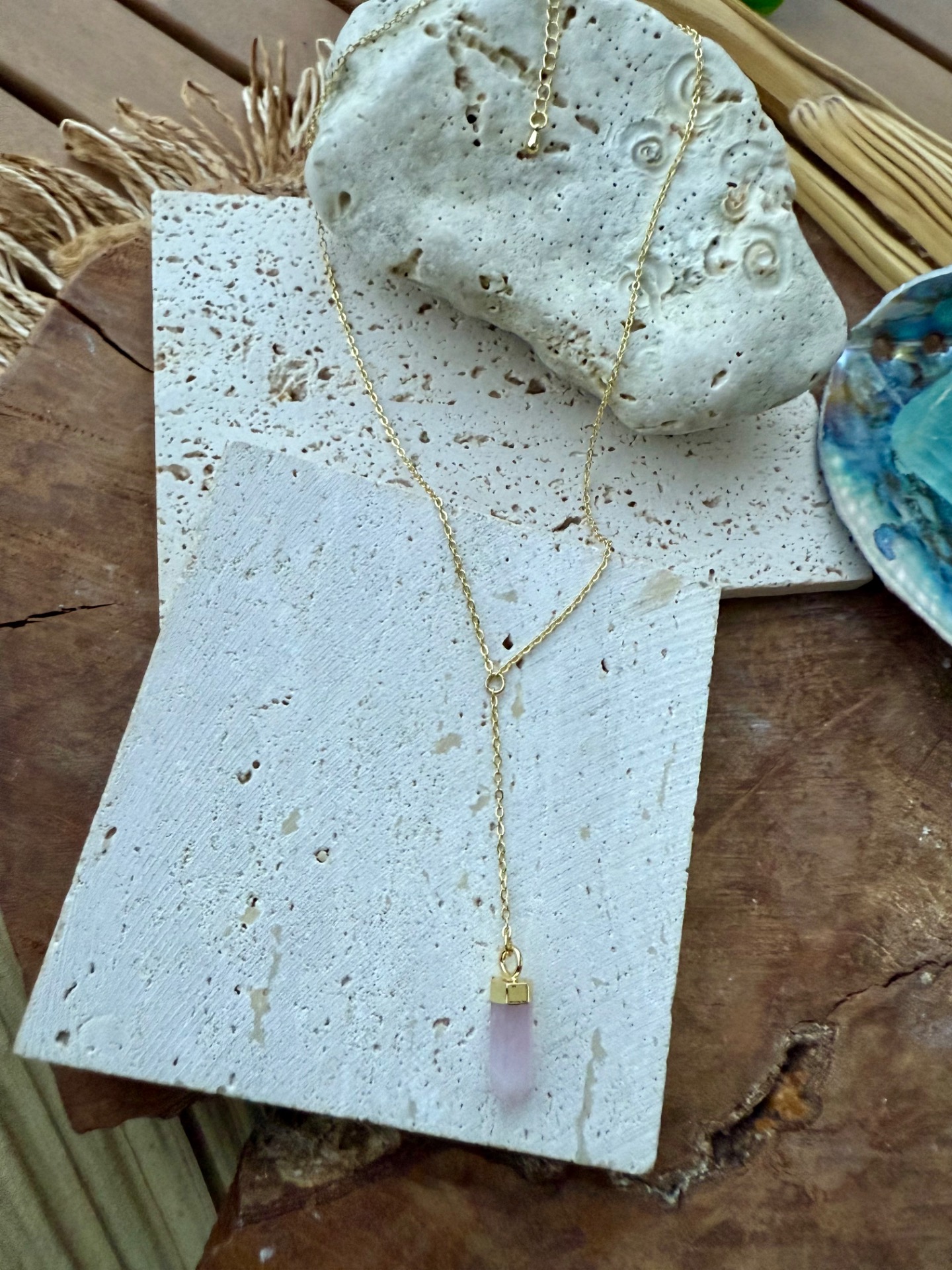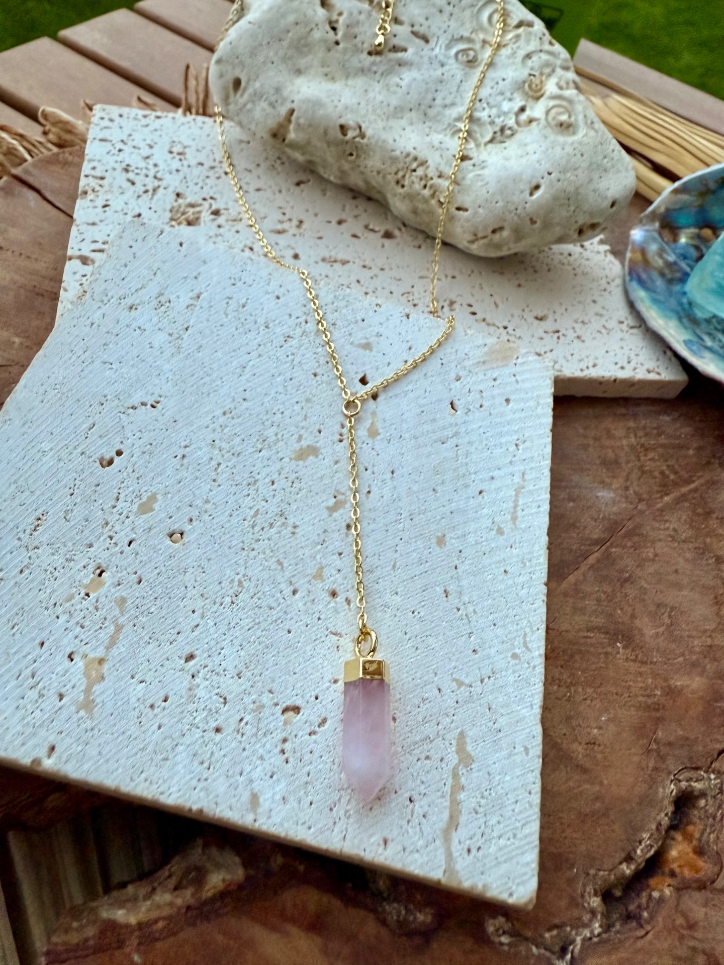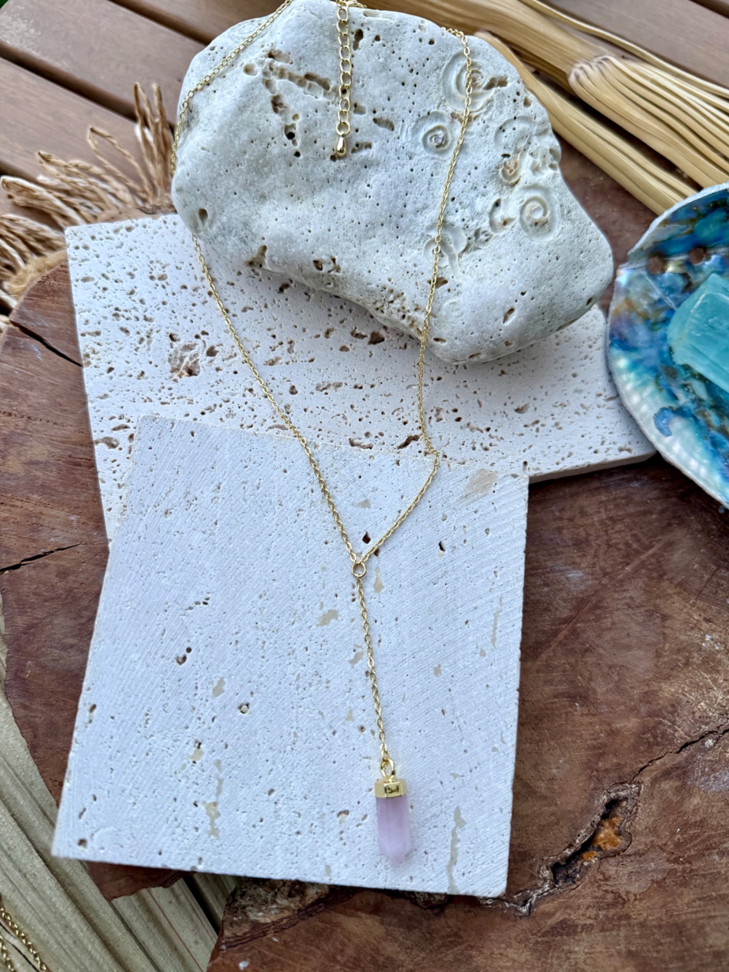 Elegantná Y retiazka s jemným zlatým leskom 18k gold plated prináša svetlo a energiu do každého dňa. Na jej konci visiaci hrot ruženínu prebúdza radosť, optimizmus a životnú energiu, pričom dodáva šperku jemný, nežný lesk.