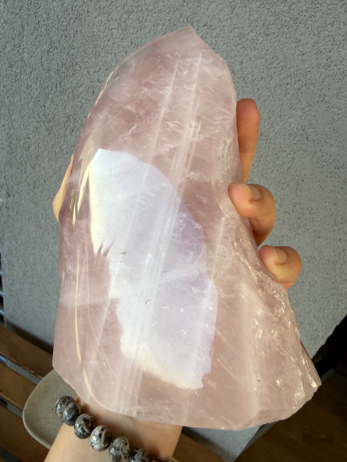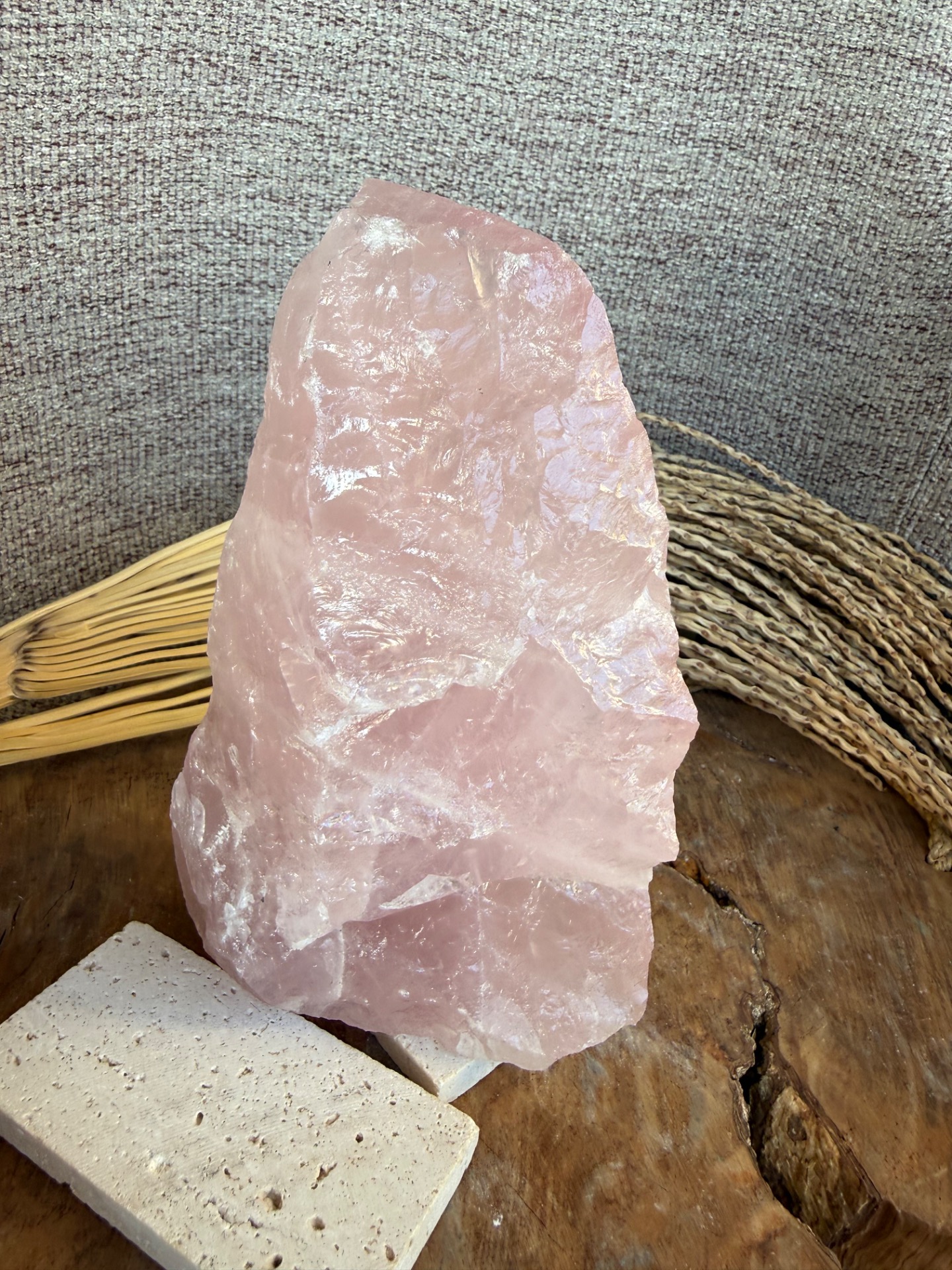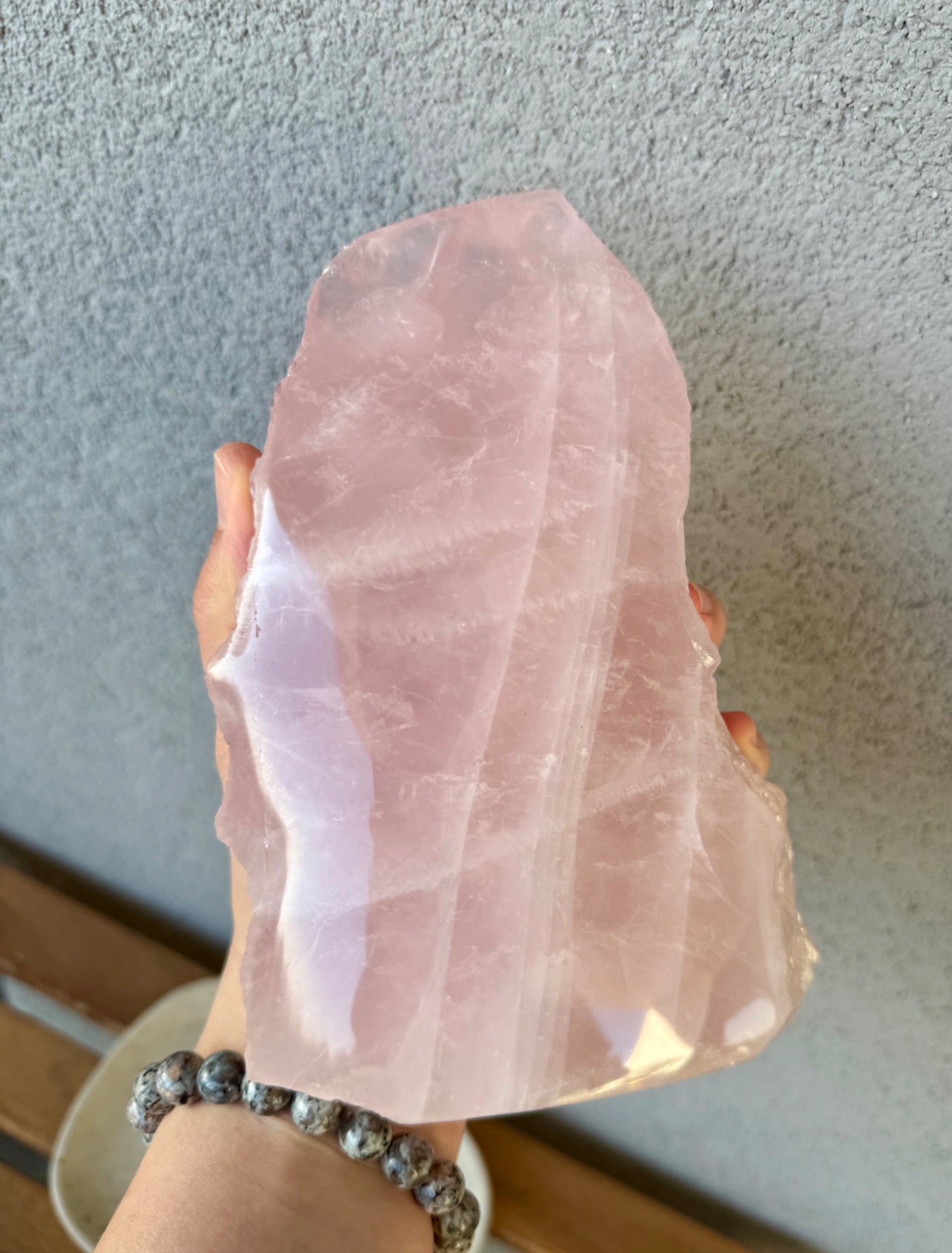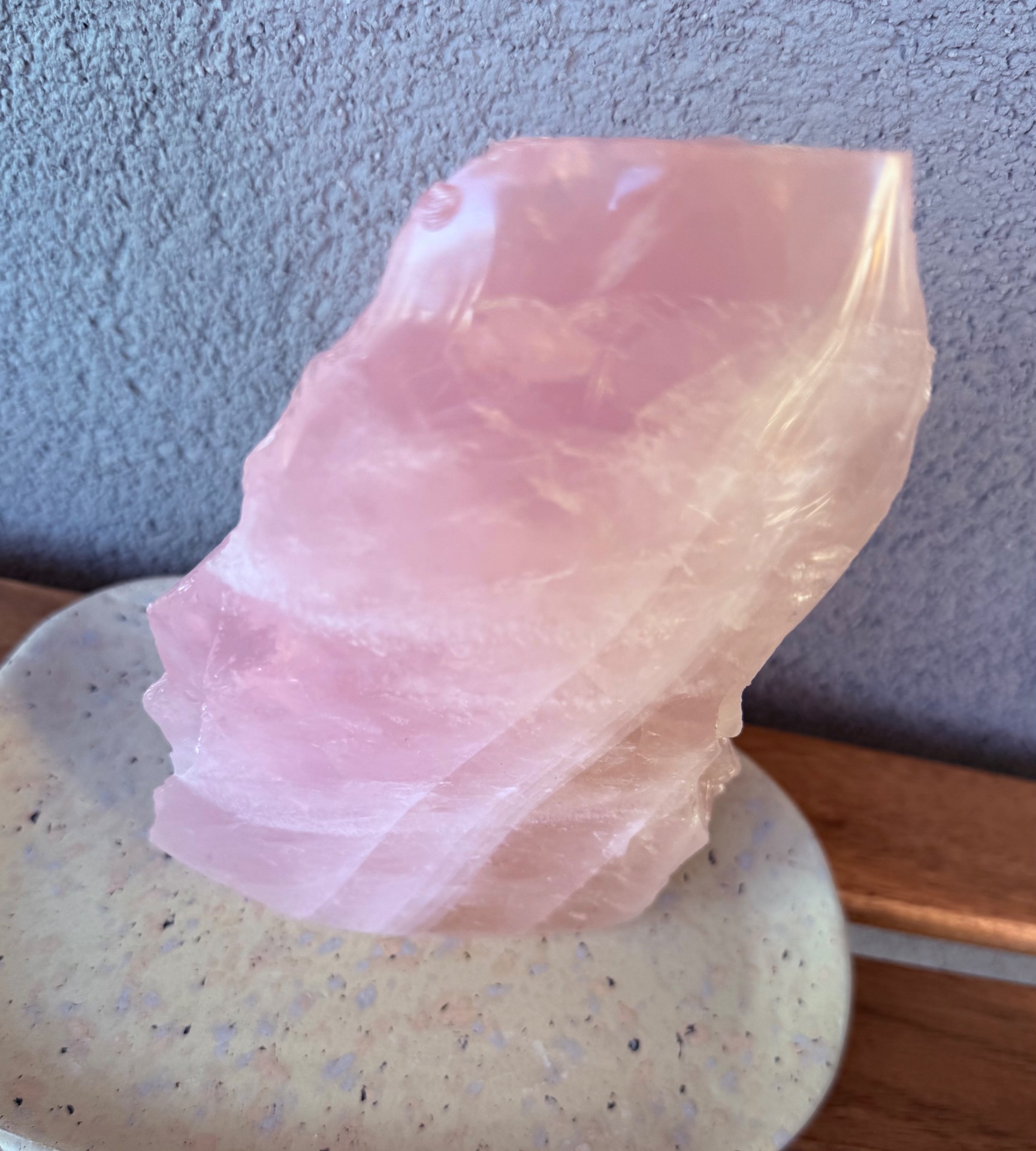 Jedna strana je precízne leštená, čo zvýrazňuje jemnosť, čistotu a nežnú vibráciu kameňa. Druhá strana zostáva v surovom prírodnom stave, čím pripomína jeho autentický pôvod a silu Zeme. Tento kontrast vytvára dokonalú rovnováhu medzi jemnosťou a prirodzenou silou.