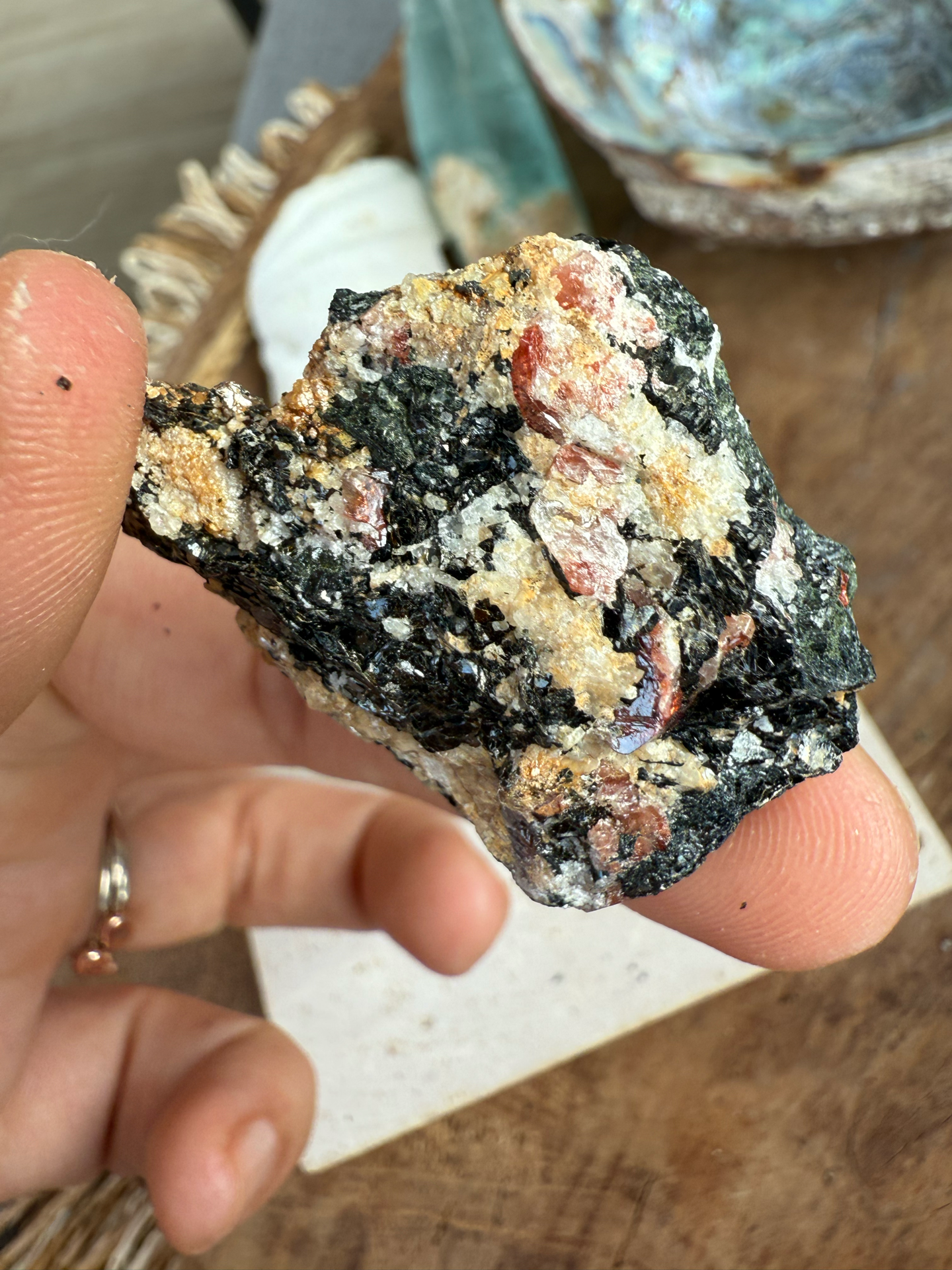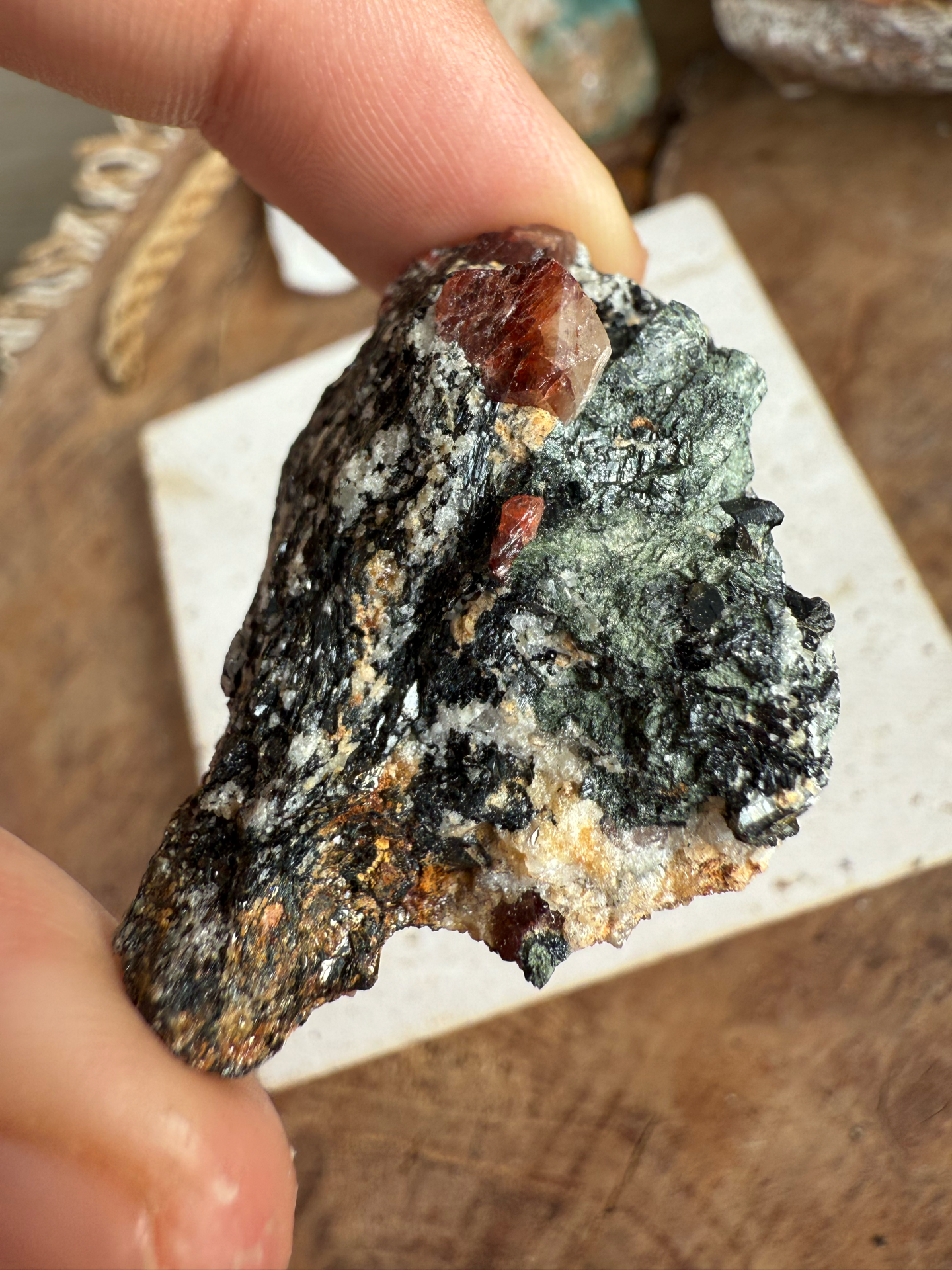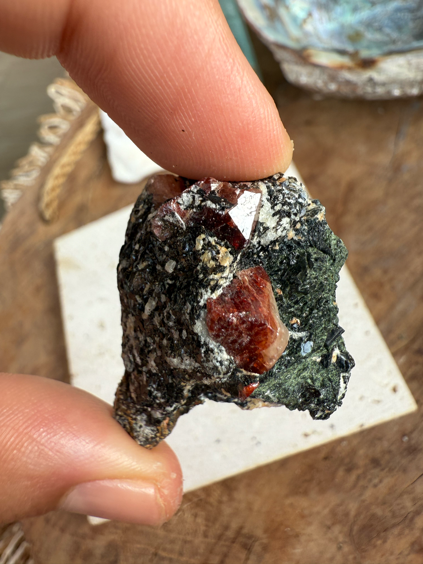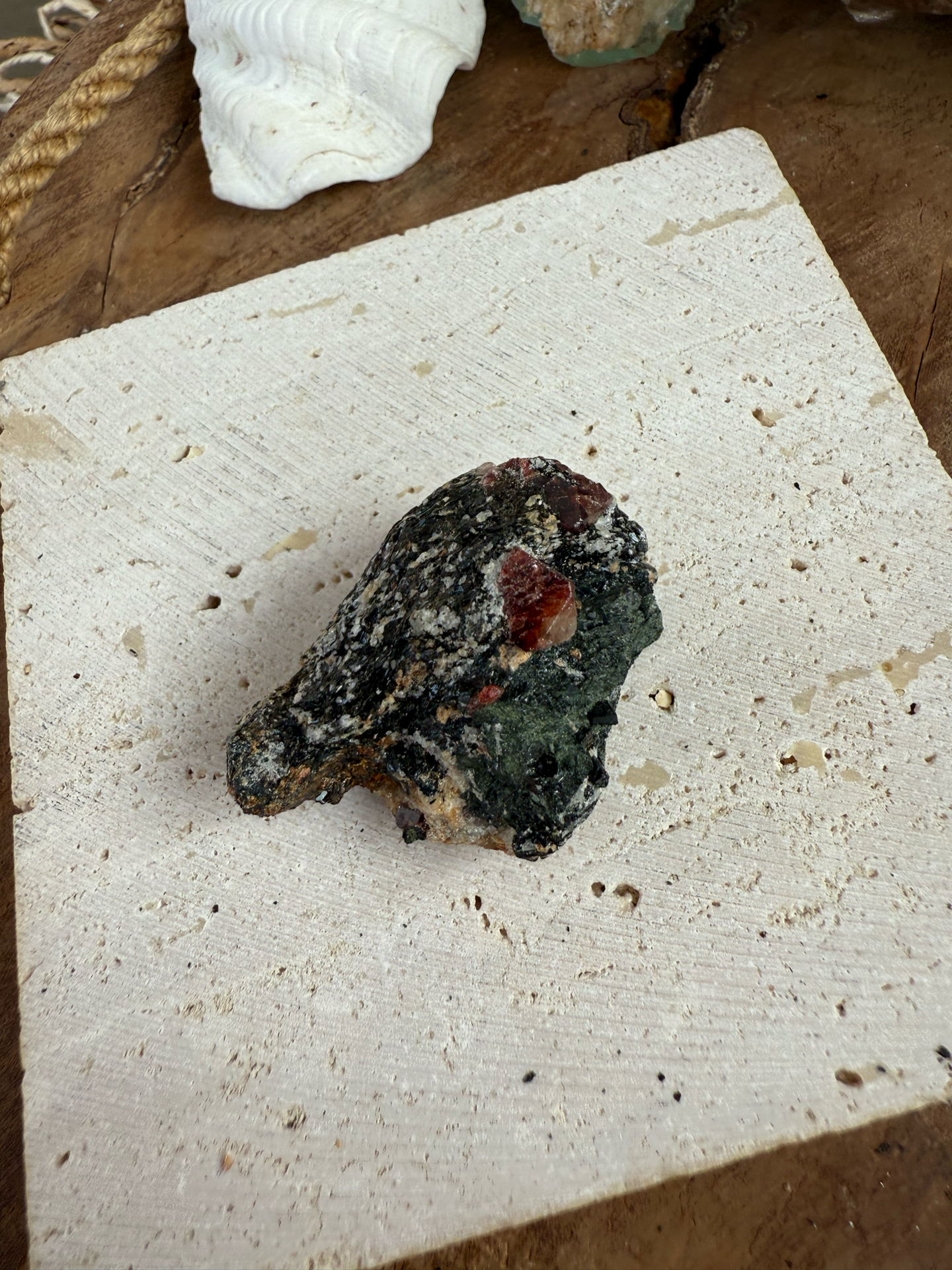 Jeho sýte červeno-krvavé odtiene žiaria v kontraste s horninou, z ktorej sa zrodil. Tento minerál v matrici pôsobí mimoriadne surovo, silno a pravdivo – ako by v sebe niesol samotný dych Zeme.