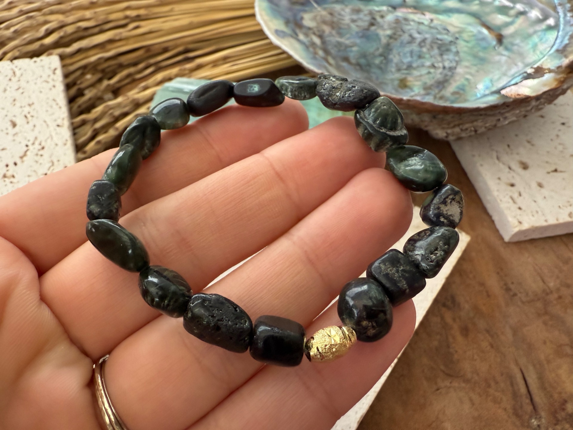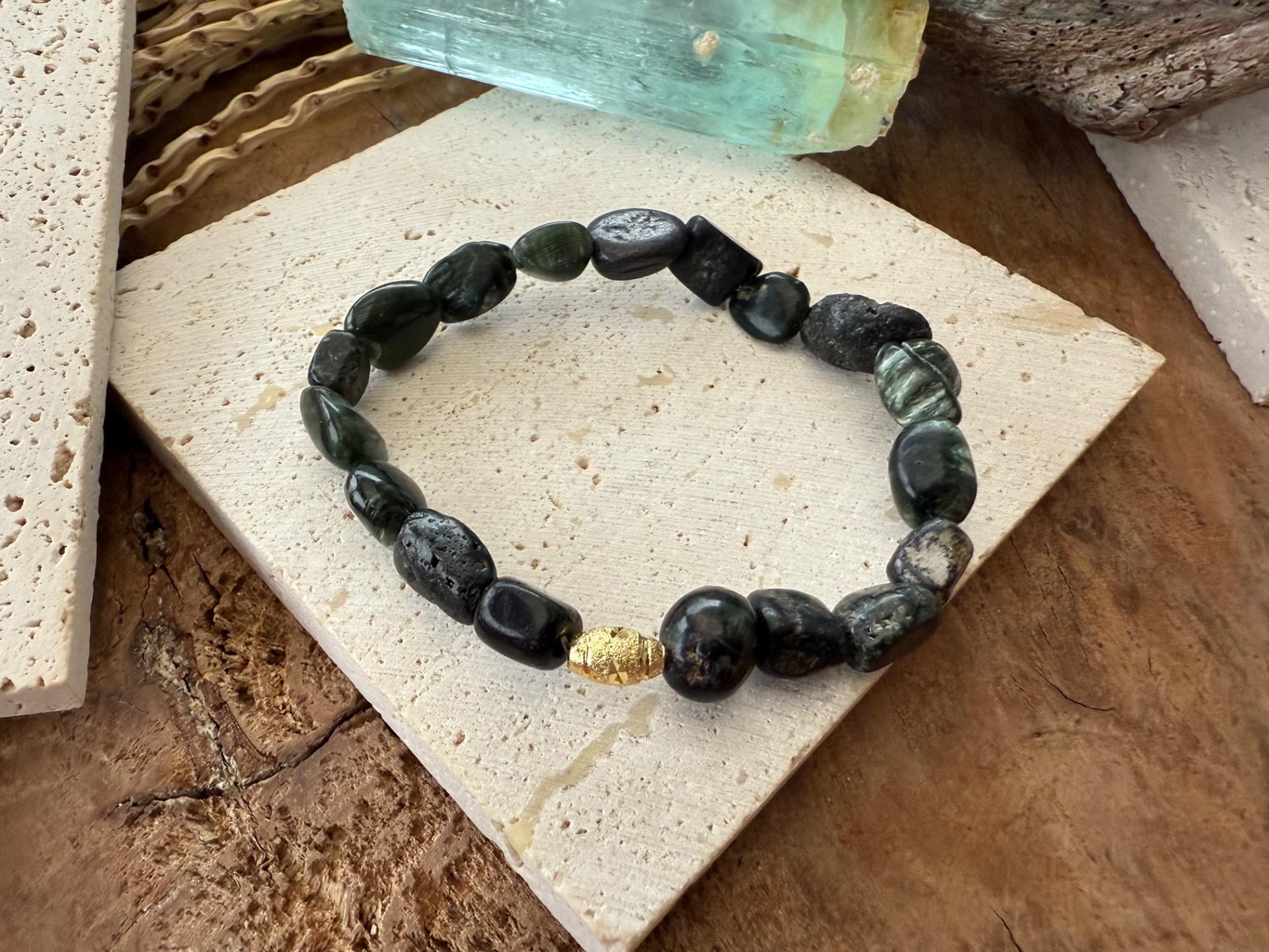 Jeho zelenostrieborné odlesky v sebe spájajú zemskú múdrosť a nebeské svetlo. Náramok ti pomáha uzemniť sa, načúvať svojmu telu a zároveň otvárať srdce vyššej láske a dôvere. Je ako most medzi nebom a Zemou – tichý sprievodca, ktorý ťa vracia späť do rovnováhy.