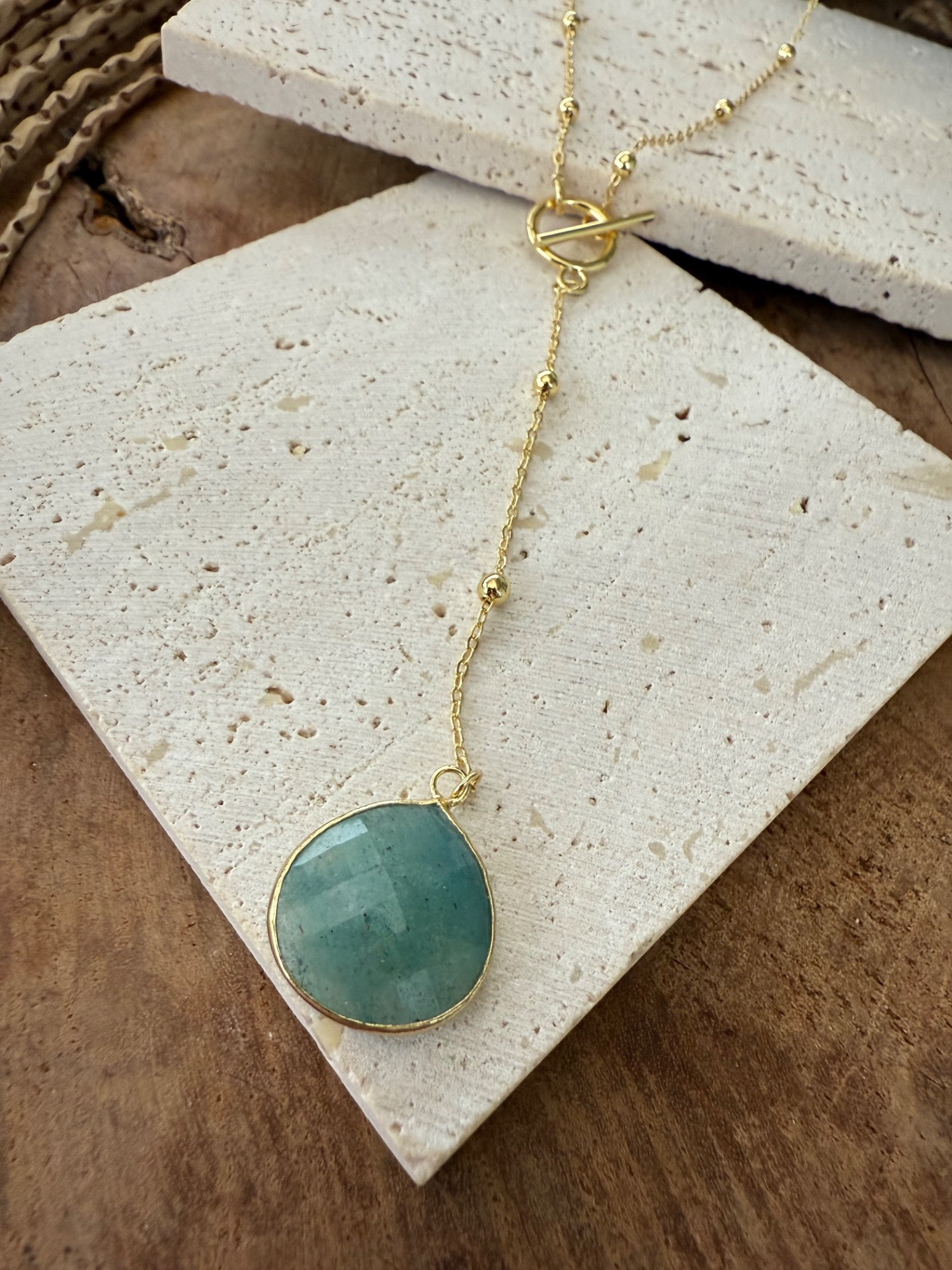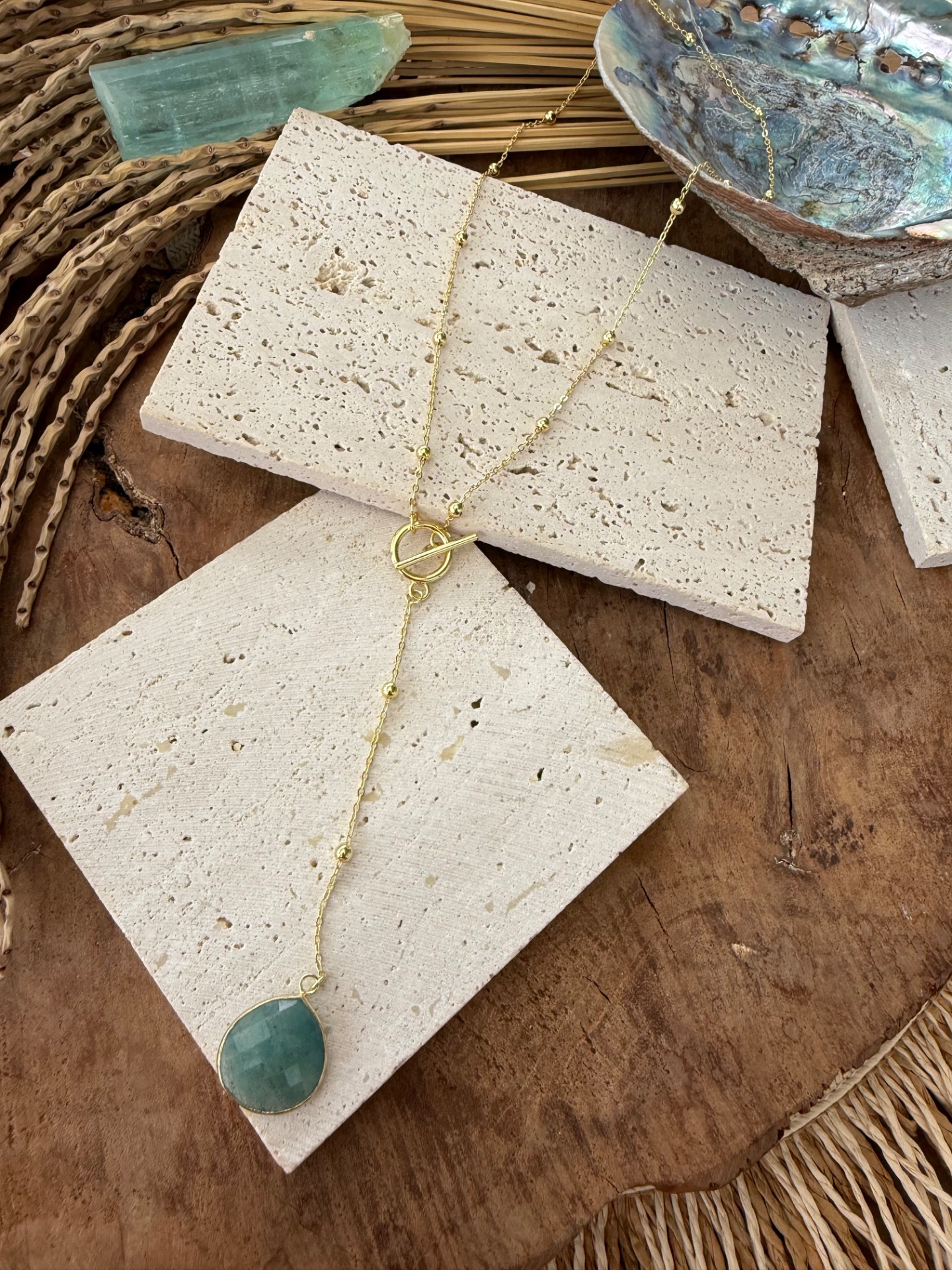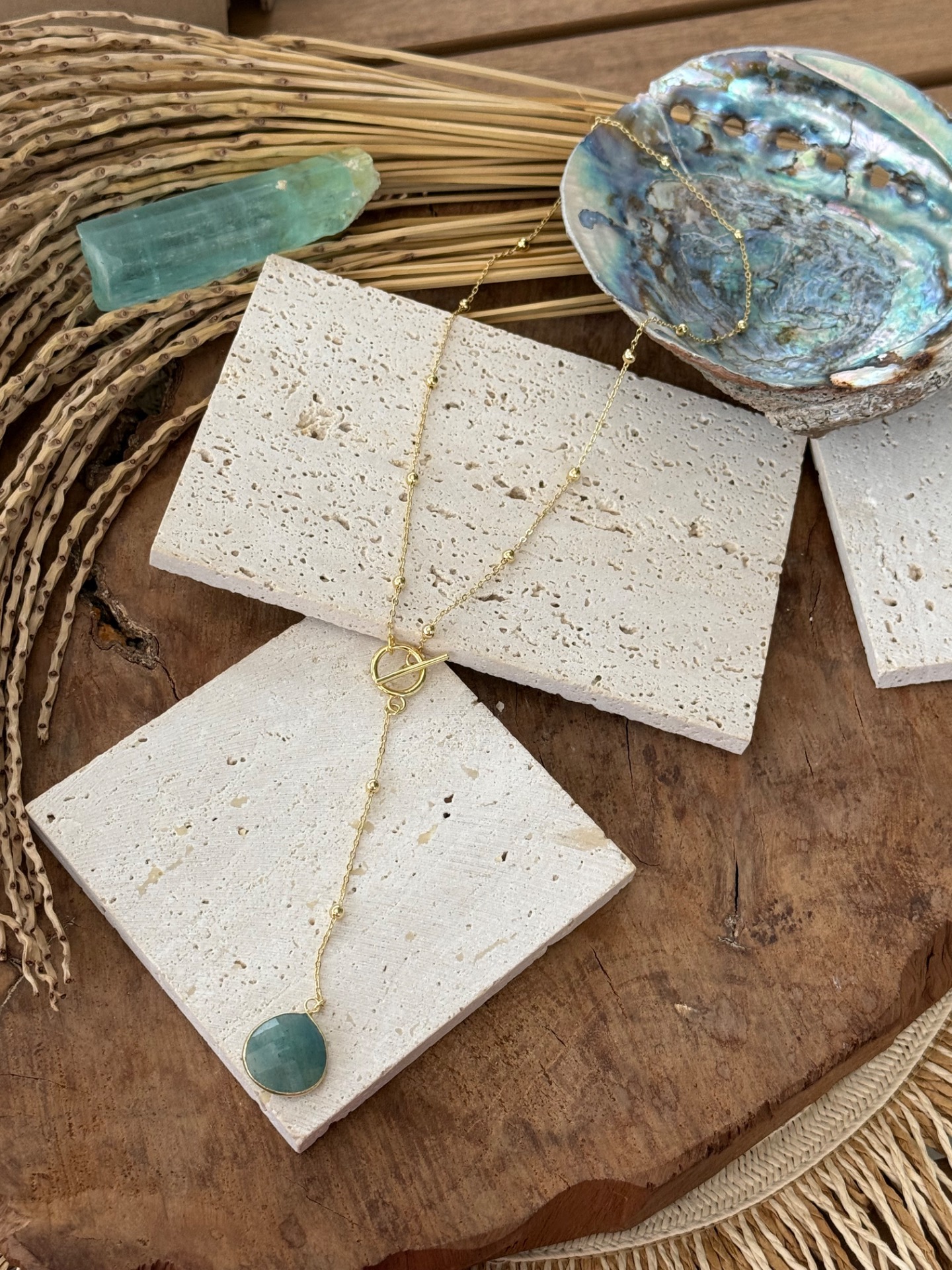 Elegantná Y retiazka s jemným zlatým leskom 18k gold plated je dokonalým šperkom, ktorý rozžiari každý outfit. Na jej konci visiaca fázetovaná slza amazonitu prináša pokoj, rovnováhu a vnútornú jasnosť. Tento šperk je stvorený pre ženy, ktoré chcú nosiť eleganciu spojenú s energiou minerálu.