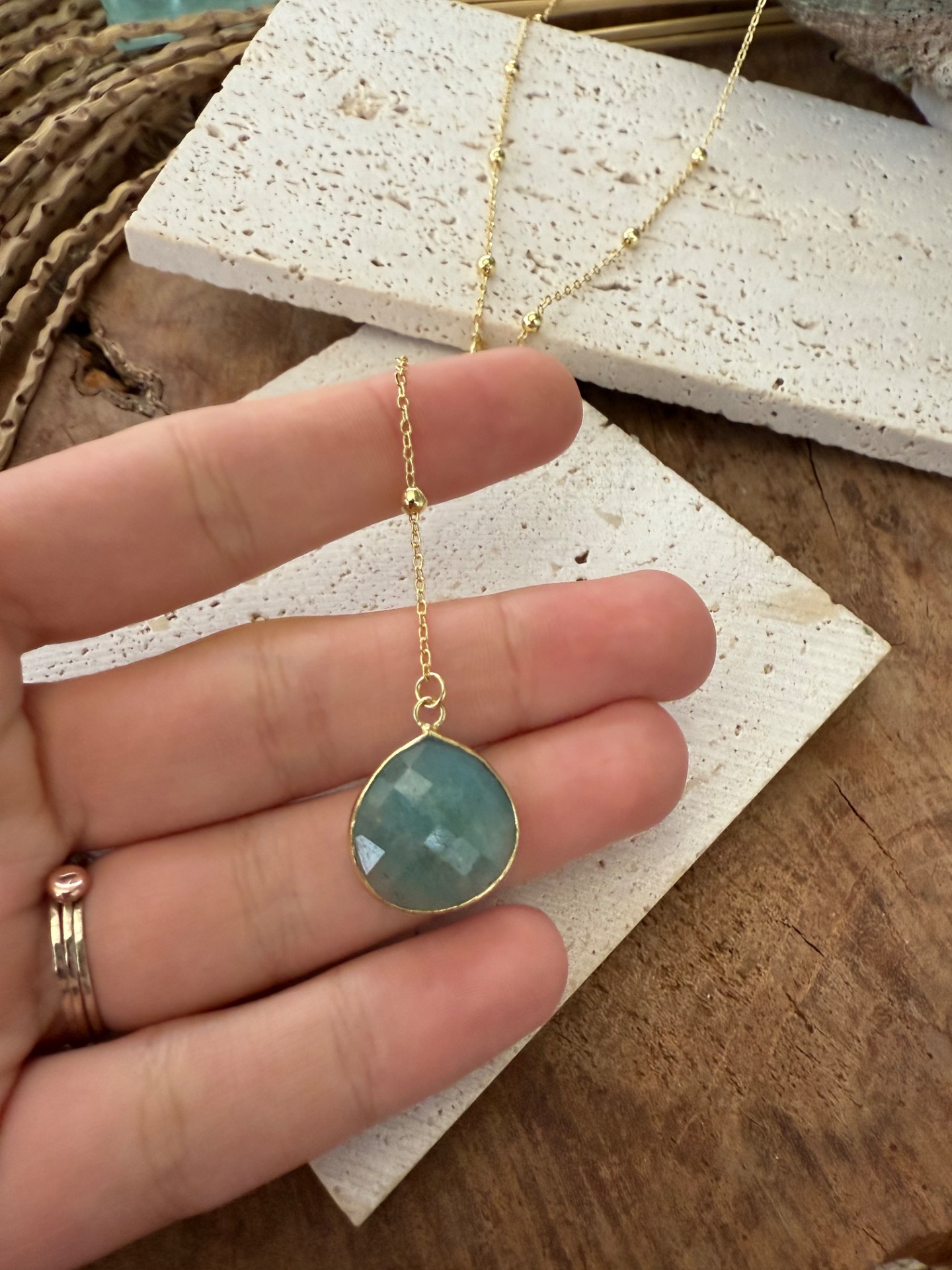 (18k gold plated Y retiazka s americkým zapínanim dĺžk 45,7 cm, prívesok amazonit slza, fazetovaný výbrus)