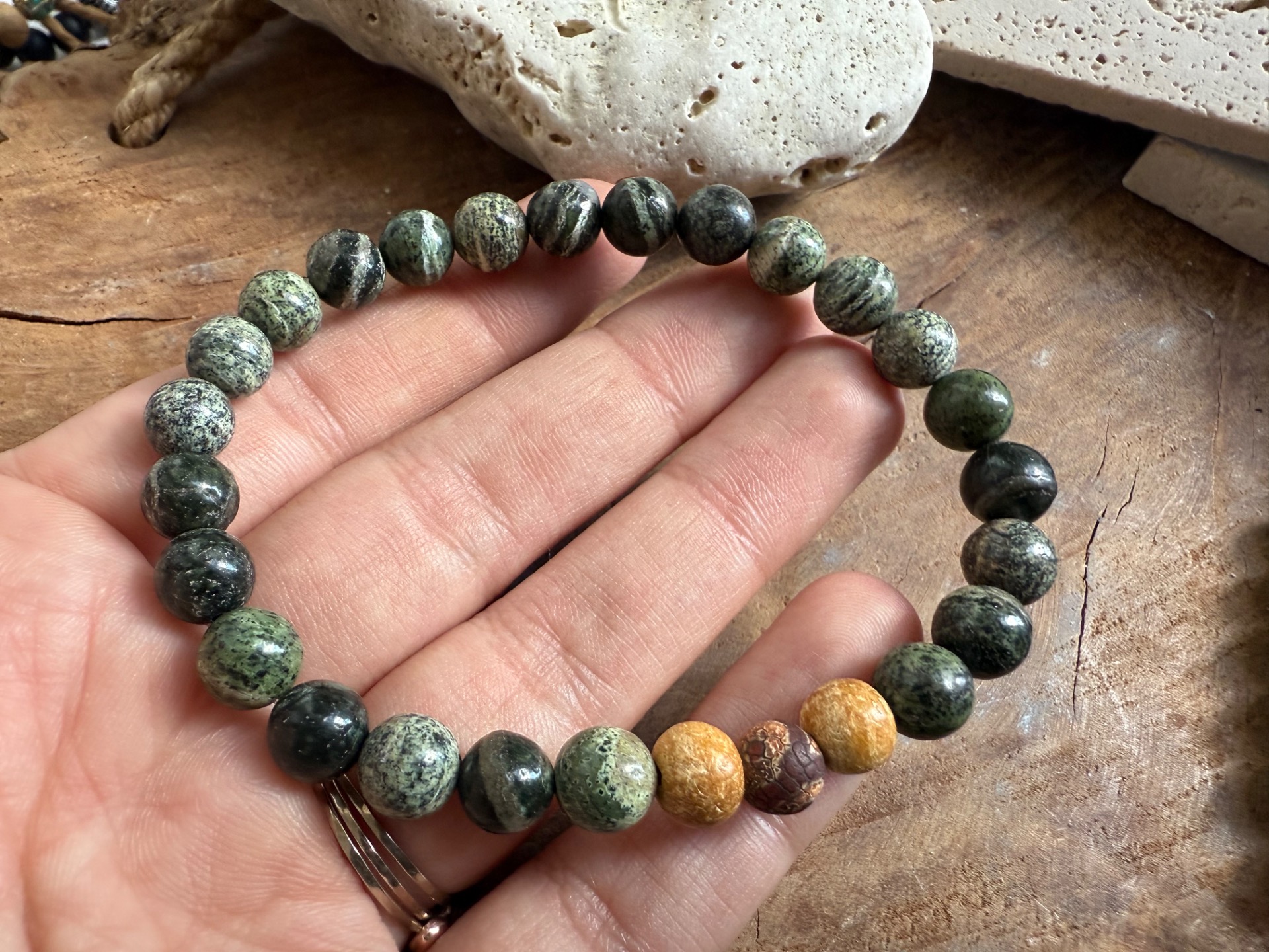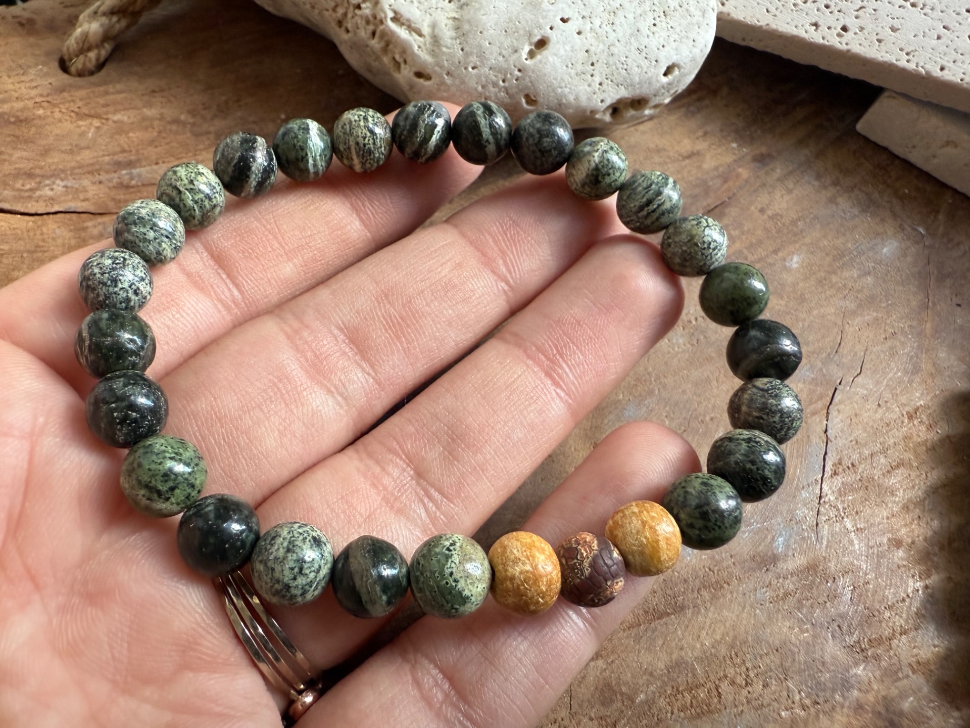 Každá 8 mm korálka serpentinitu nesie energiu zeme a harmónie – jeho zelenošedé tóny pripomínajú kameň, z ktorého sa rodí sila a rovnováha. Palo Santo dodáva náramku nielen nádhernú vôňu, ale aj duchovný rozmer – podľa tradícií čistí od negatívnej energie a prináša mier.