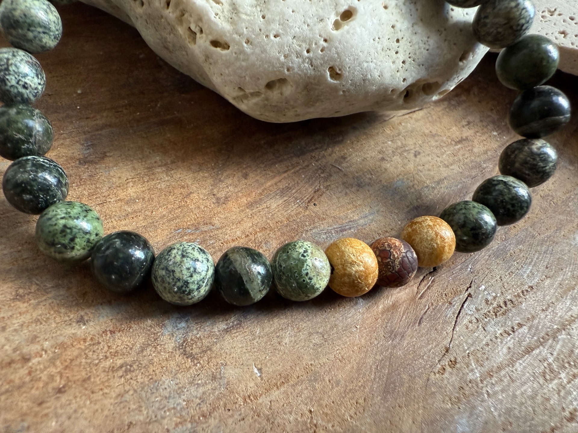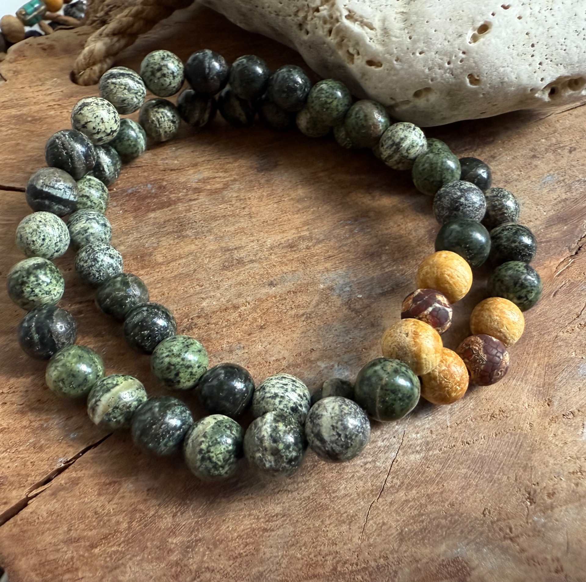 "Strážca posvätnej cesty" – pánsky náramok zo serpentinitu, Palo Santa a Dzi achátu