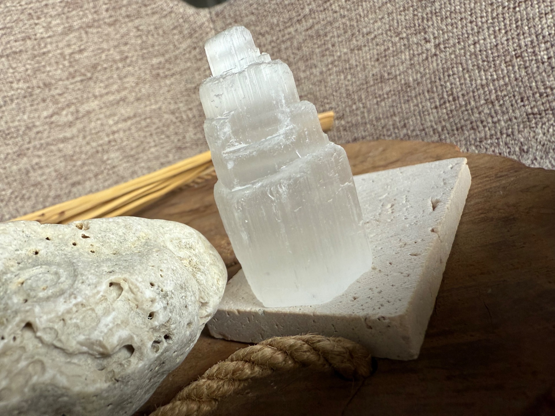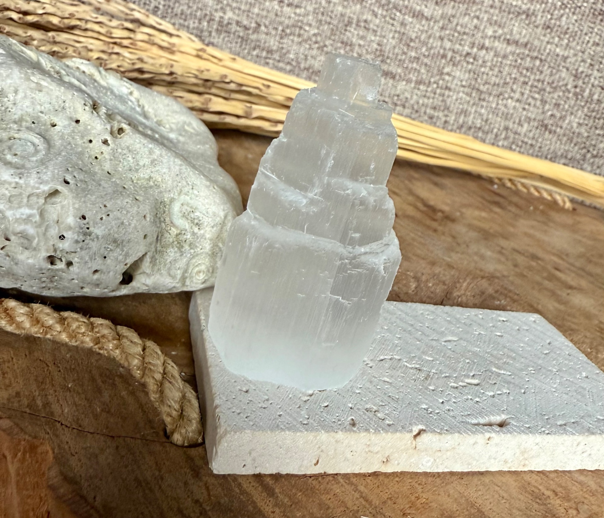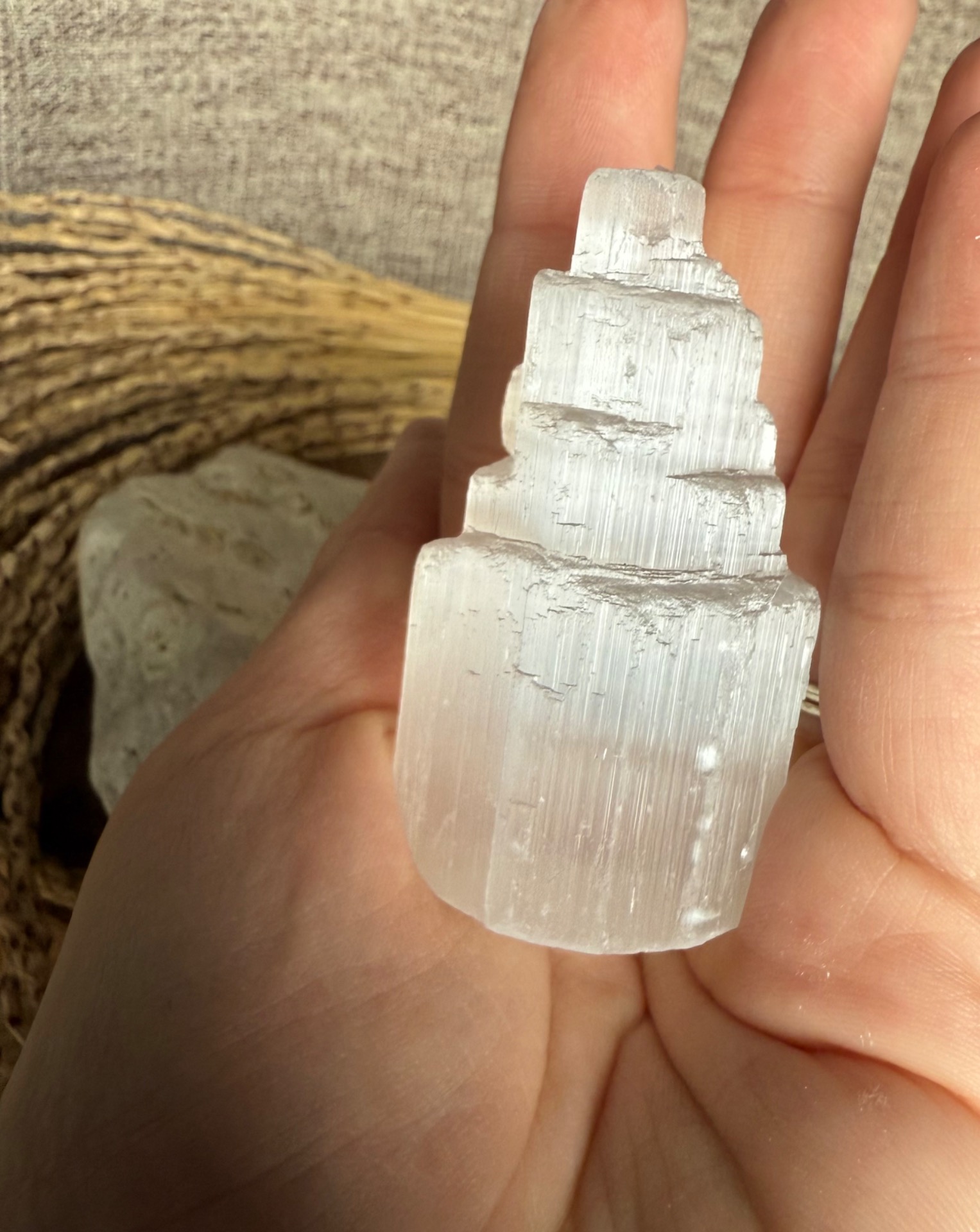 Pôvod a vznik: Selenit vzniká z minerálu gipsu a je známy svojou čistou, jemnou a svetelnou energiou. Každá vežička je ručne opracovaná, aby zachovala prirodzenú štruktúru minerálu a zároveň pôsobila ako elegantný dekoratívny prvok.