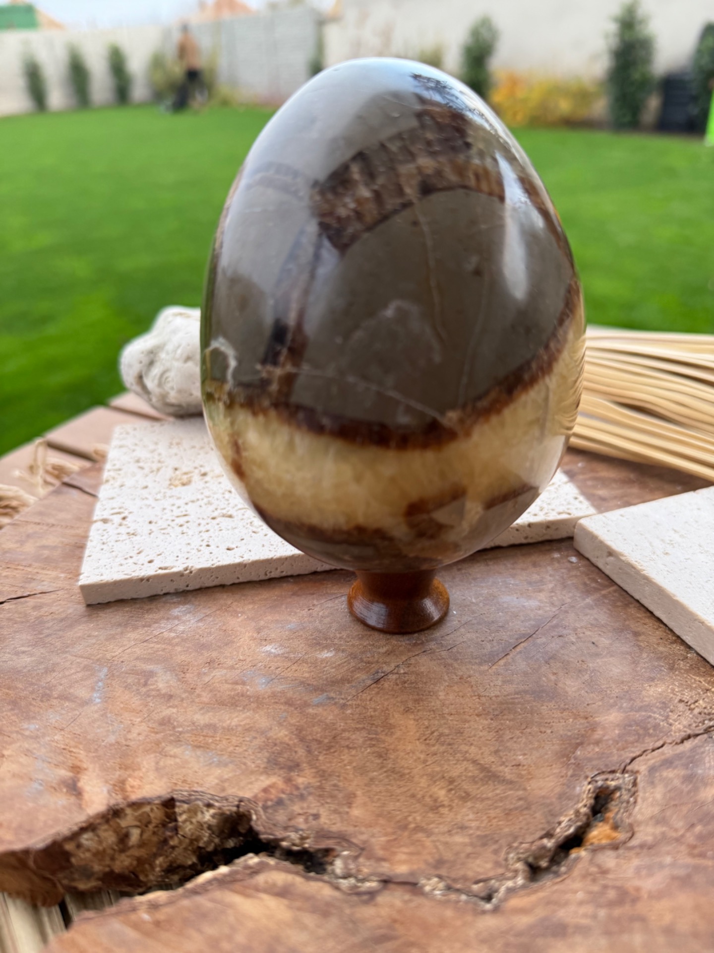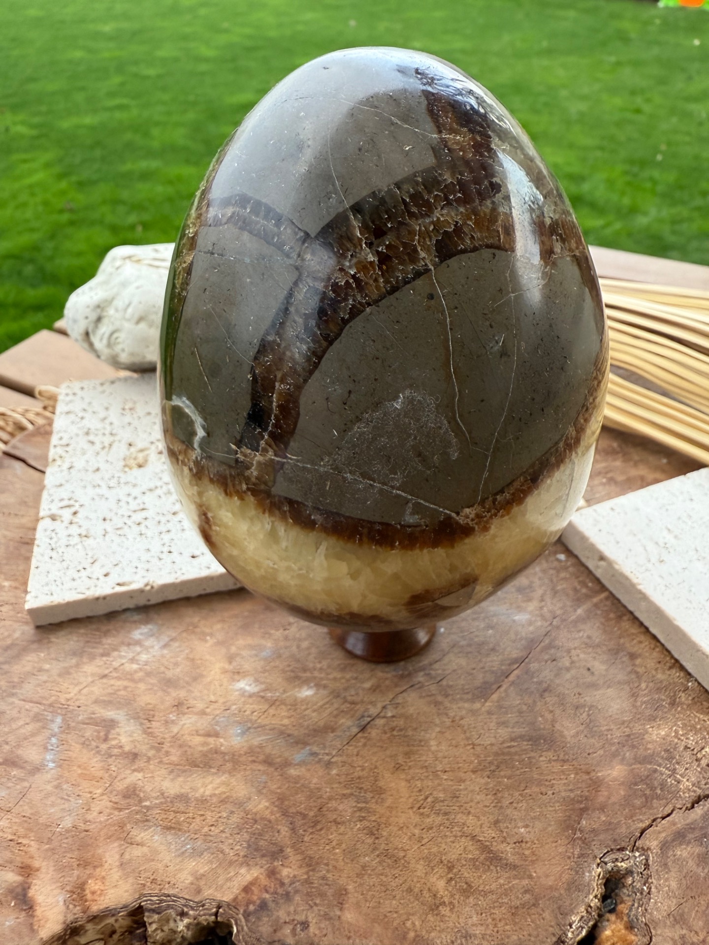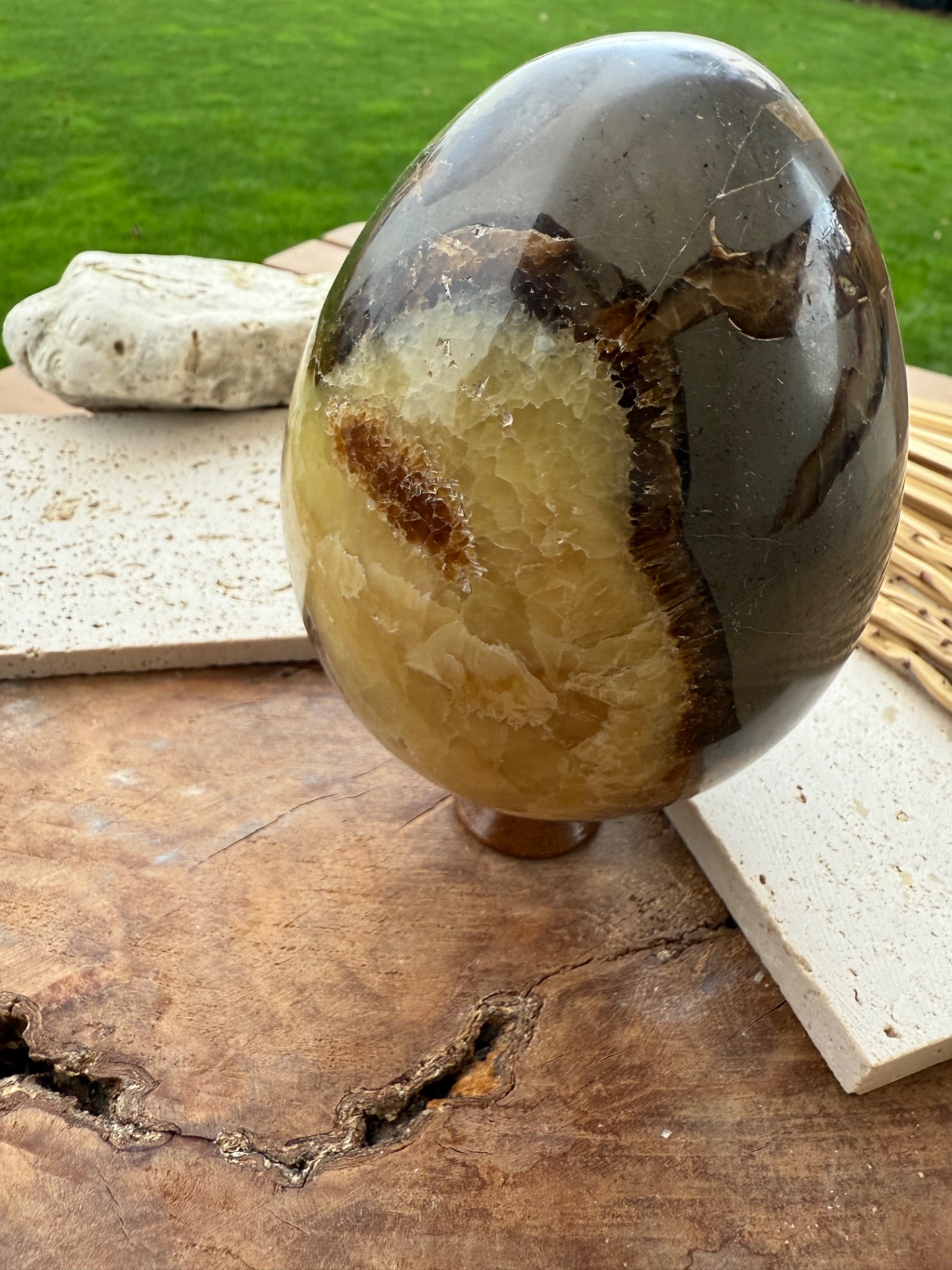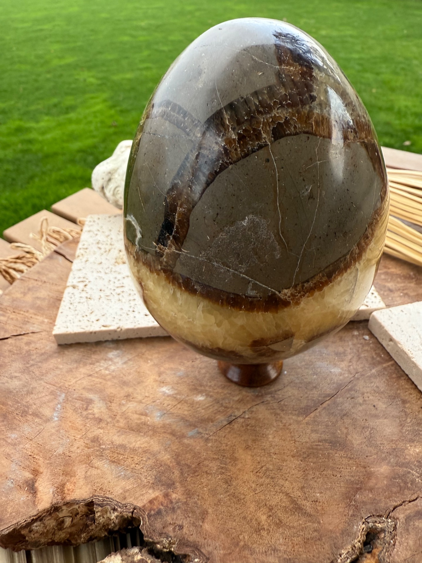 Minerál septária vyleštený do tvaru vajca , na podstavci.