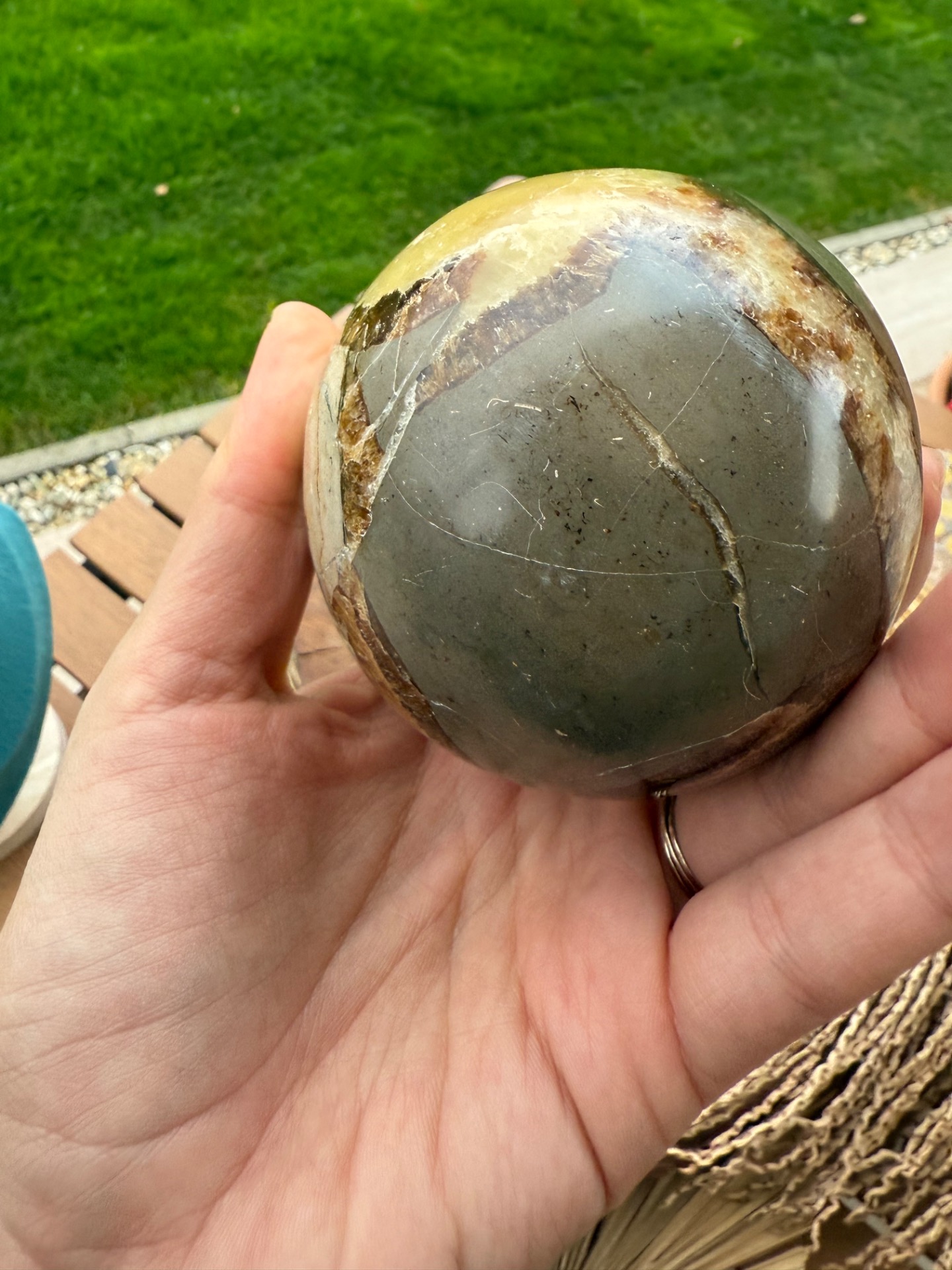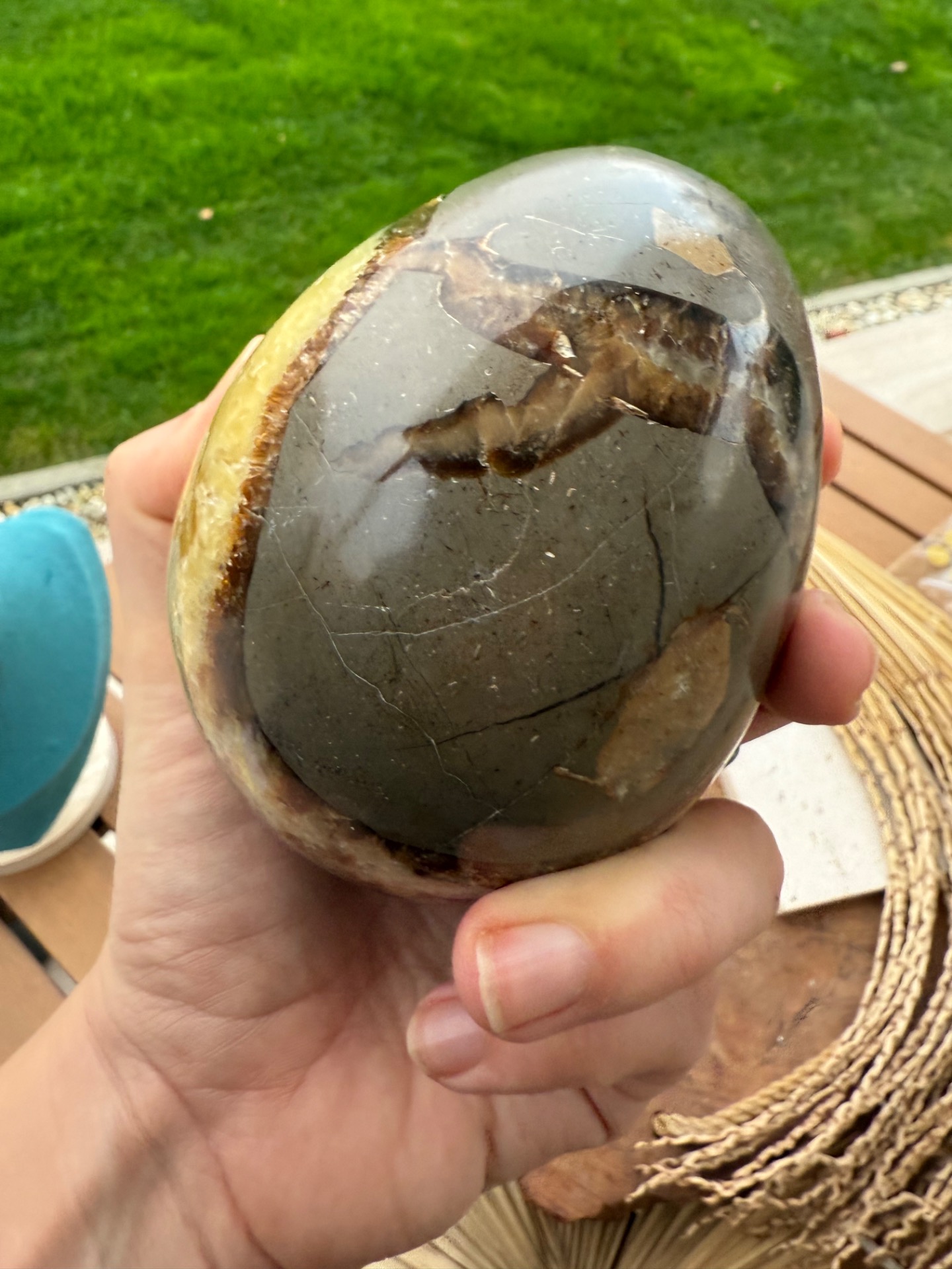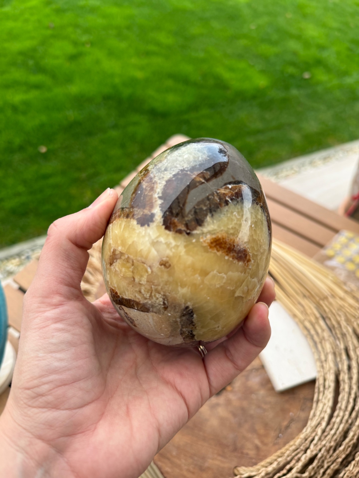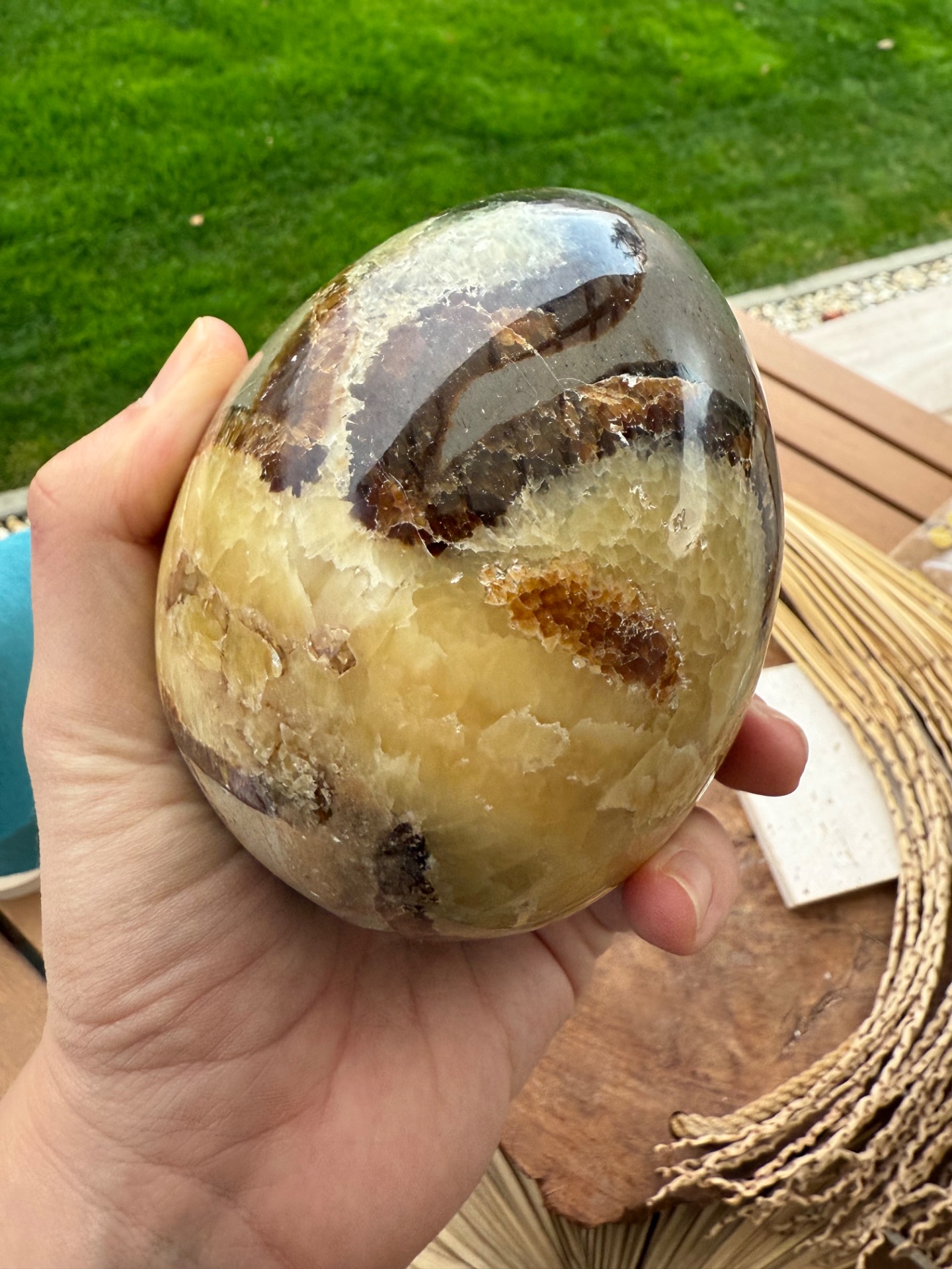 Minerál septária vyleštený do tvaru vajca , na podstavci.