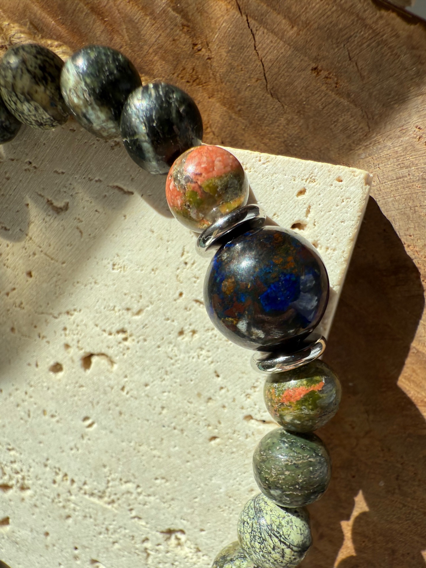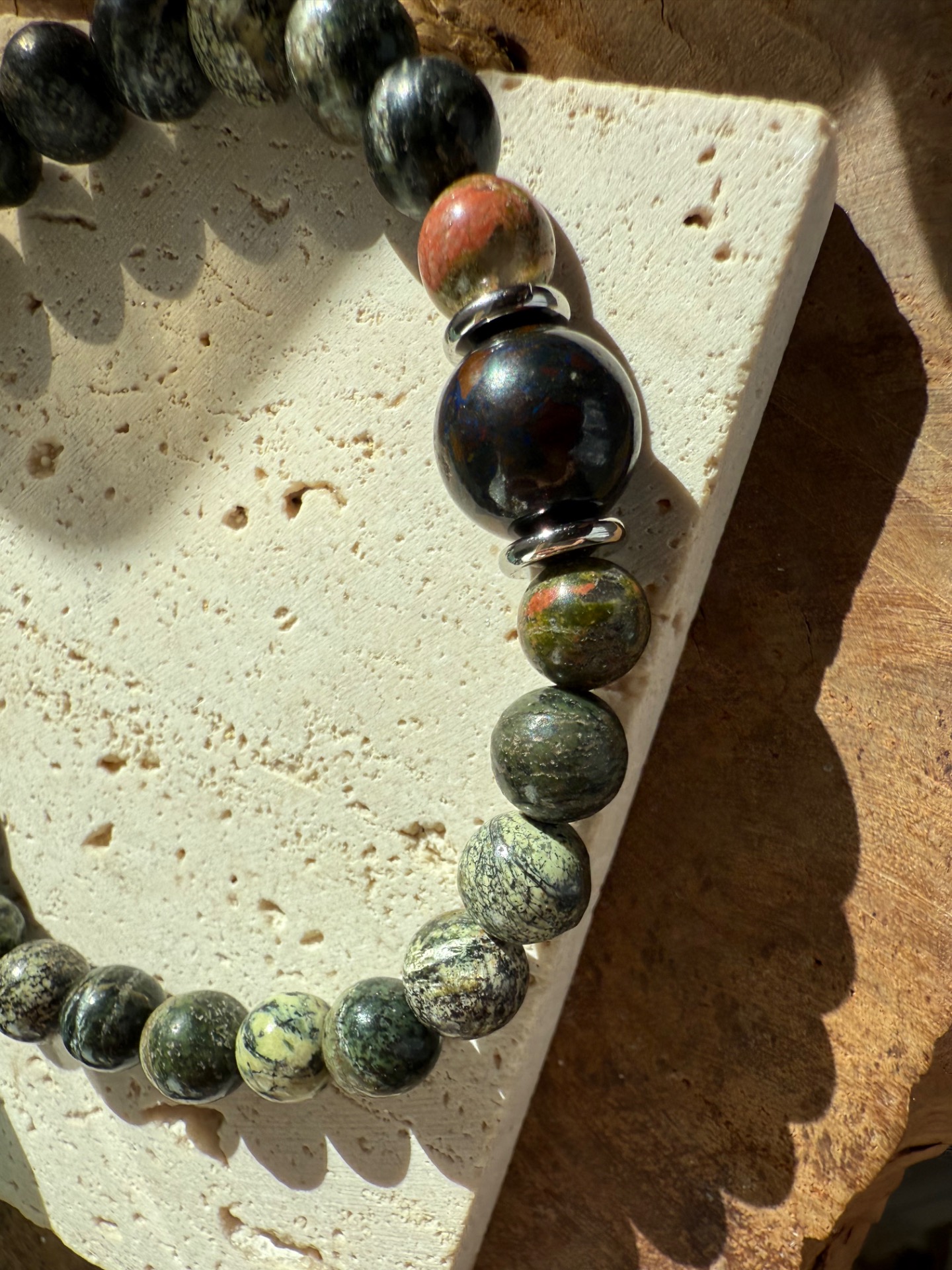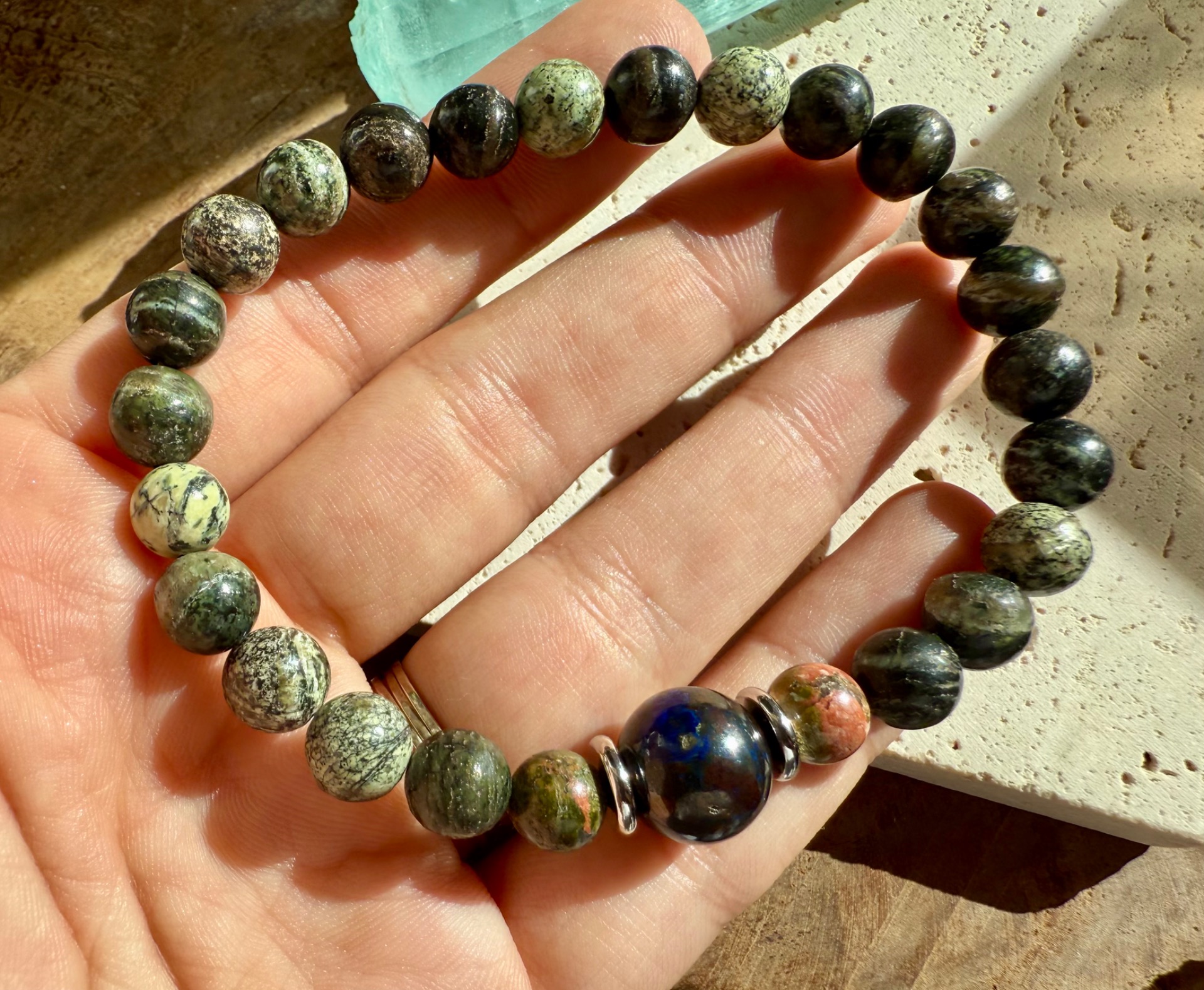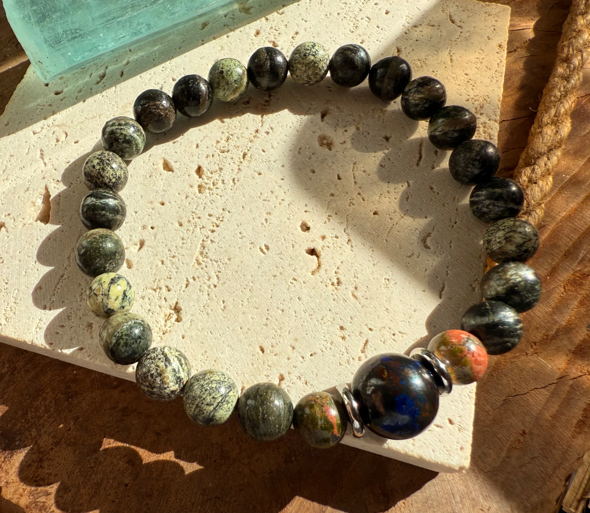 Tento pánsky náramok je navrhnutý ako talizman hlbokého liečenia, vnútorného pokoja a ochrany. Spojenie serpentinitu, unakitu a chryzokolu prináša rovnováhu tela, mysle a emócií a podporuje harmonizáciu vnútorných procesov.