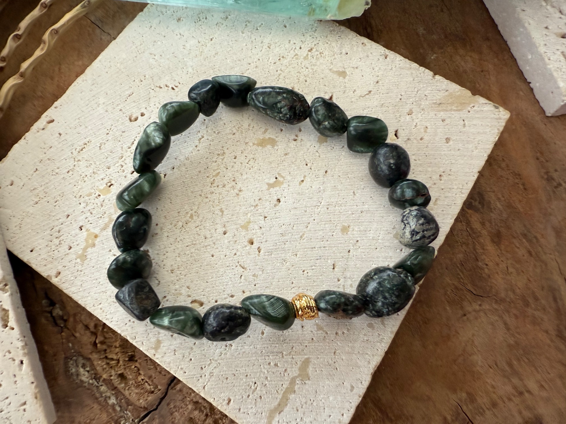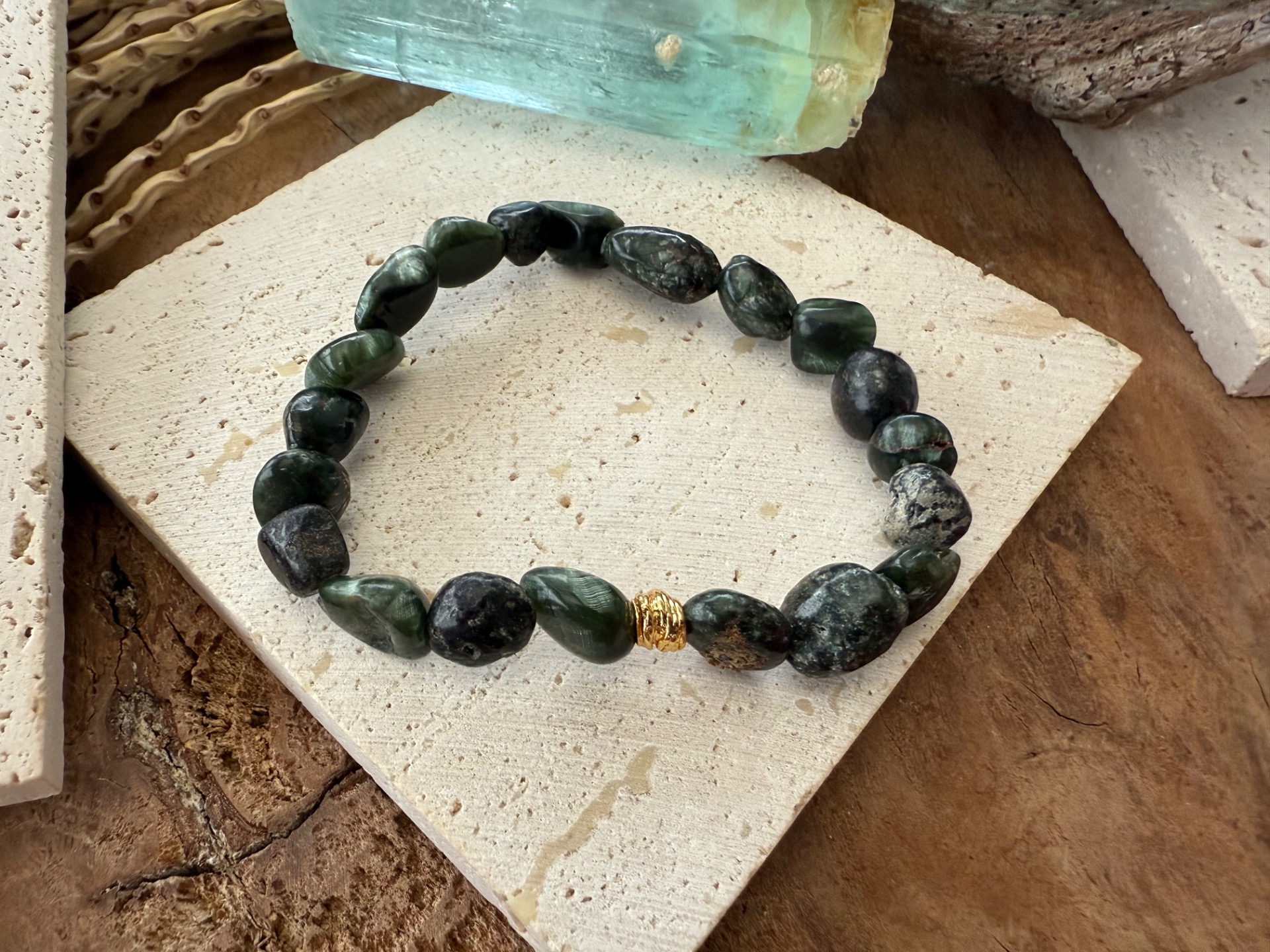 Tento jedinečný náramok z nepravidelných nugetov serafinitu (17 cm) nesie energiu hlbokej očisty a duchovného prebudenia. Každý kameň je originálny – jeho tvar a kresba pripomínajú jemné perie anjelských krídel, vďaka čomu sa serafinit nazýva aj "kameň anjelov".