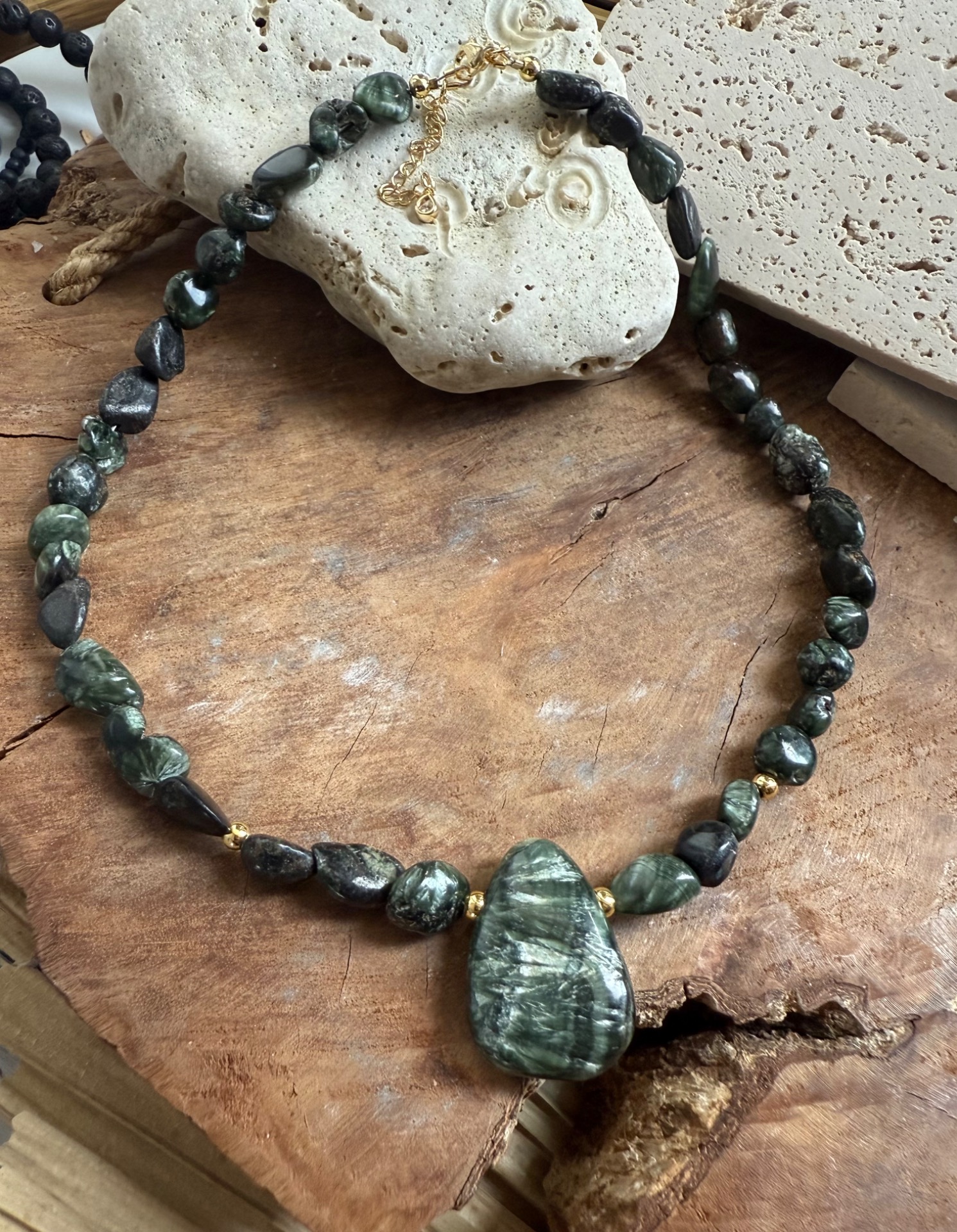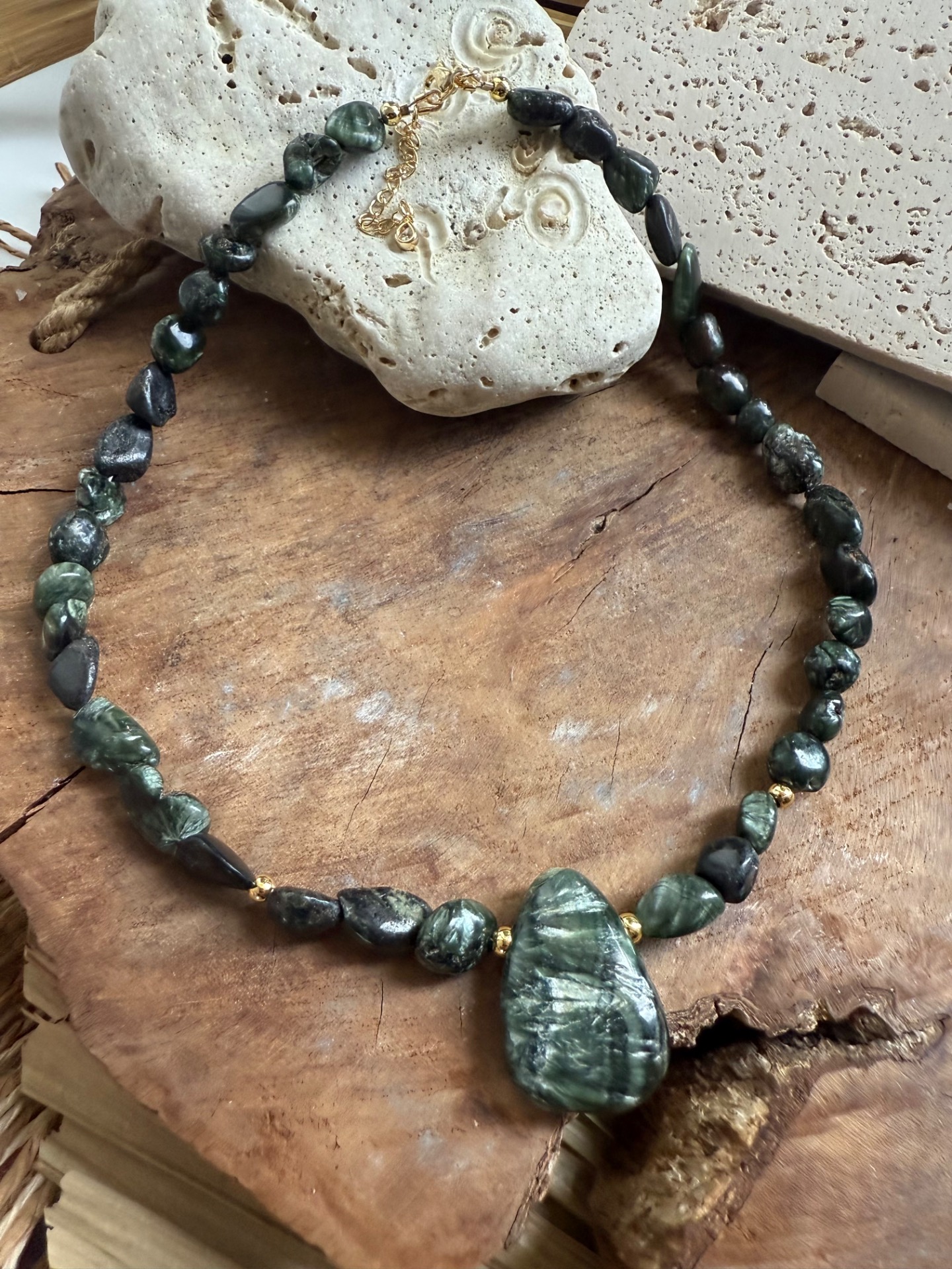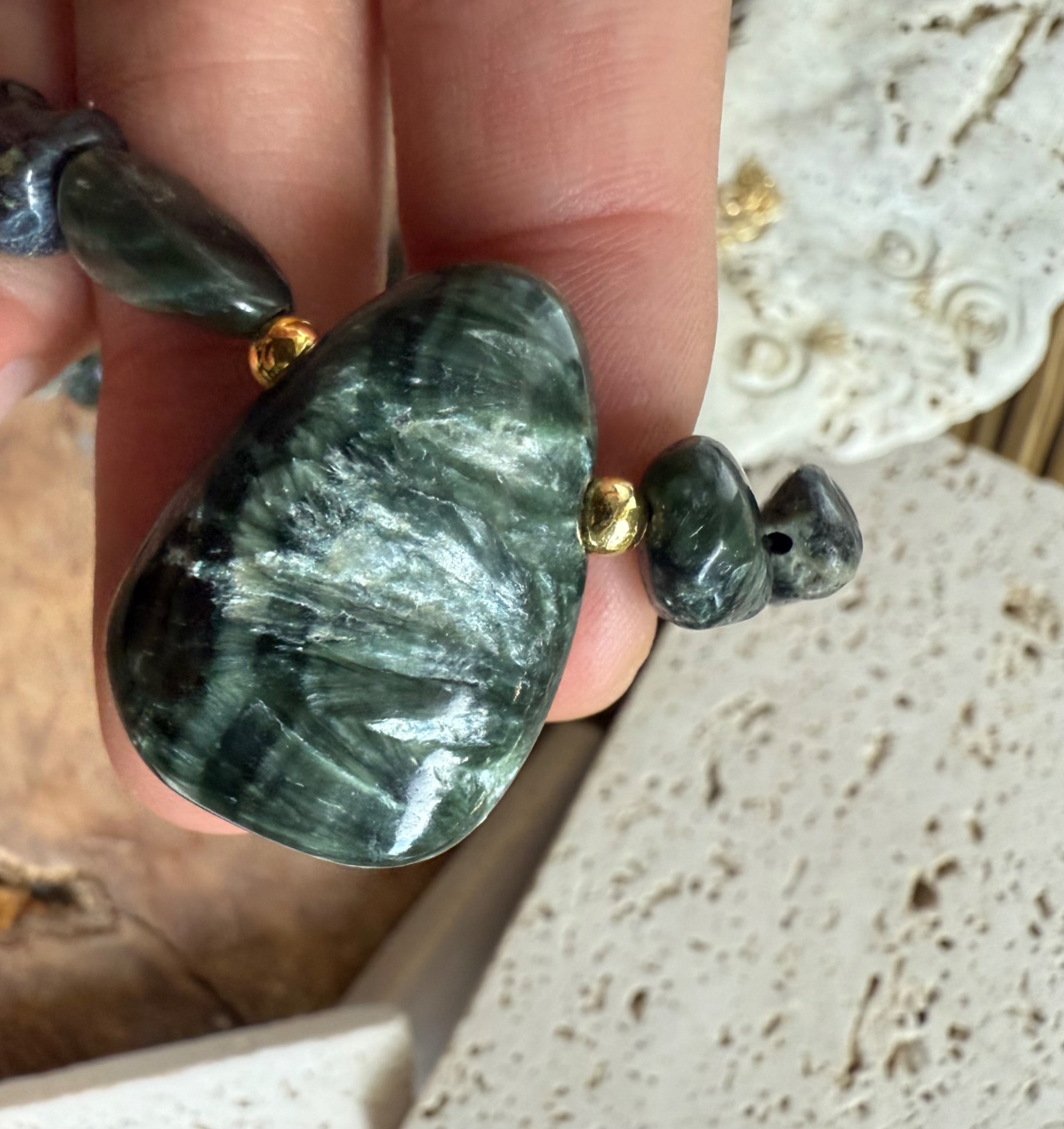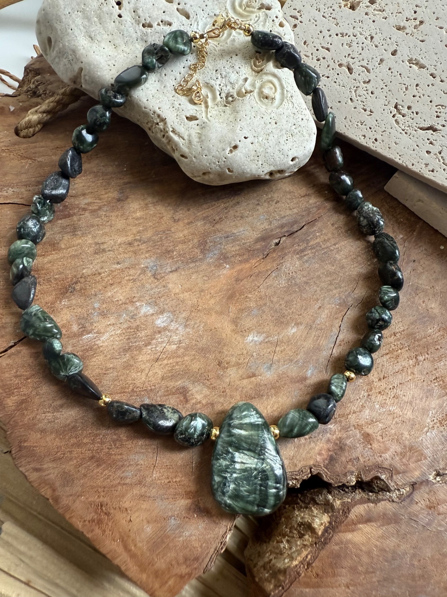 Tento výnimočný náhrdelník z minerálu serafinit v sebe nesie energiu čistoty, harmónie a hlbokého spojenia s anjelskými sférami.