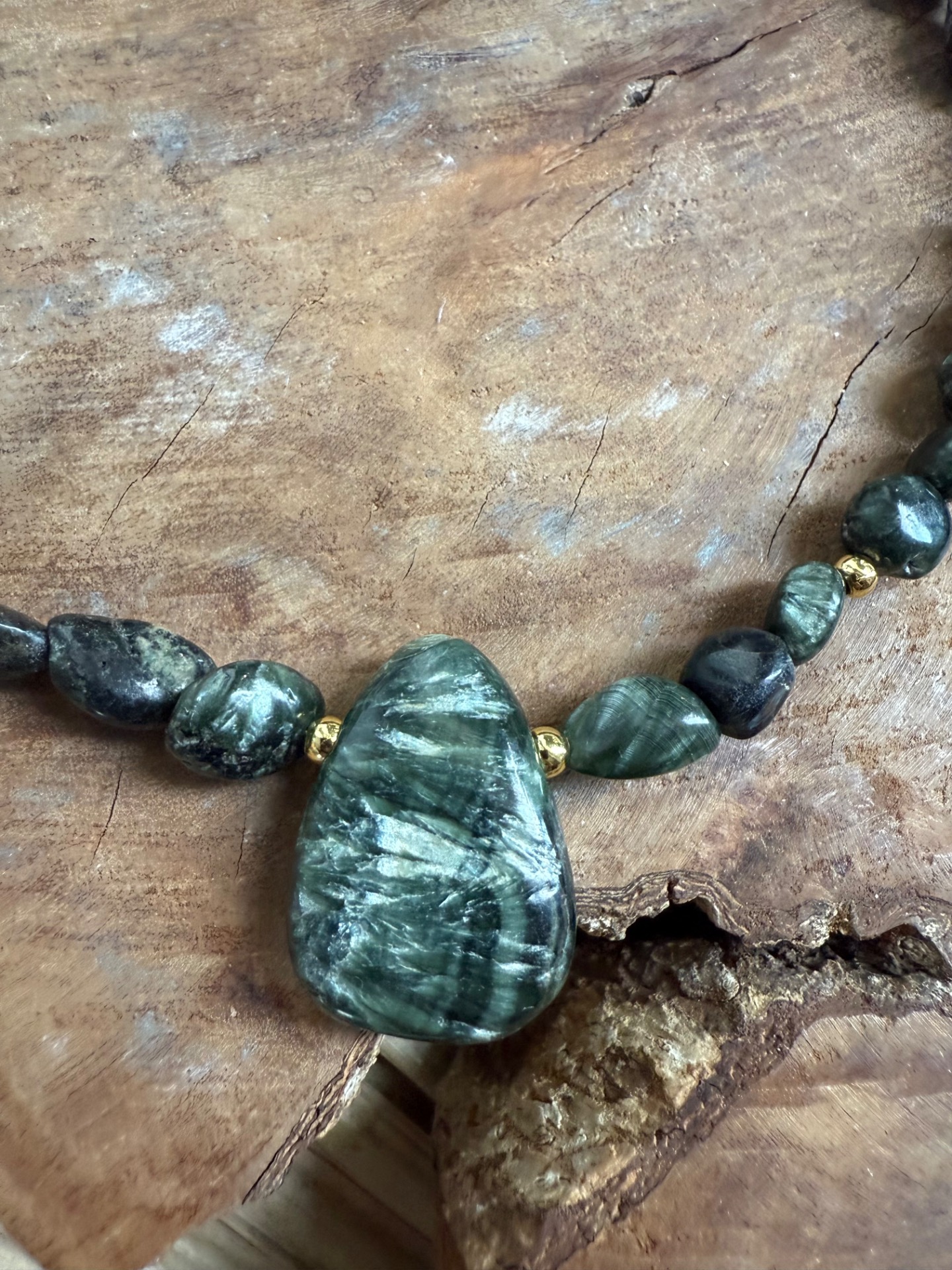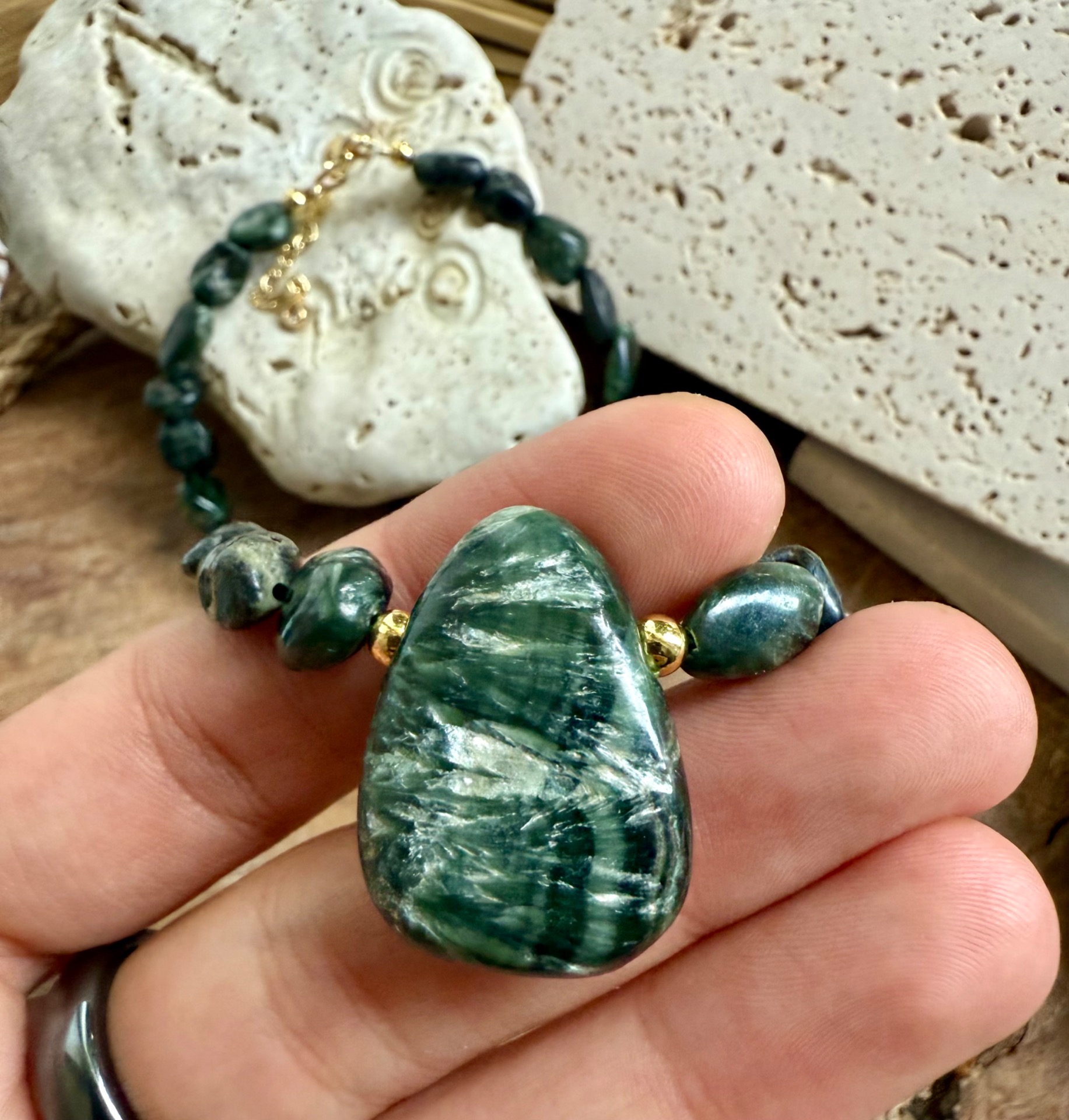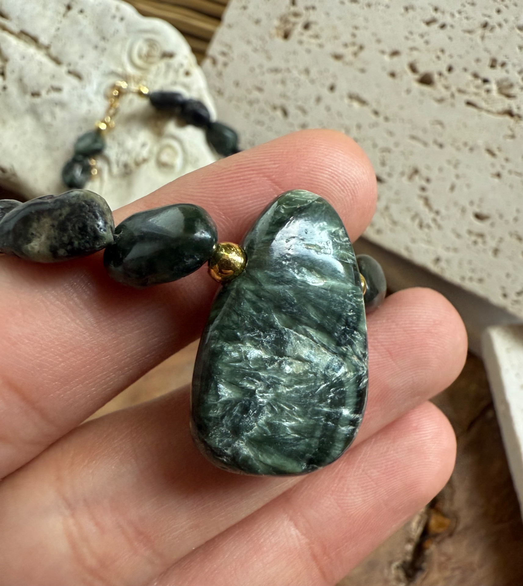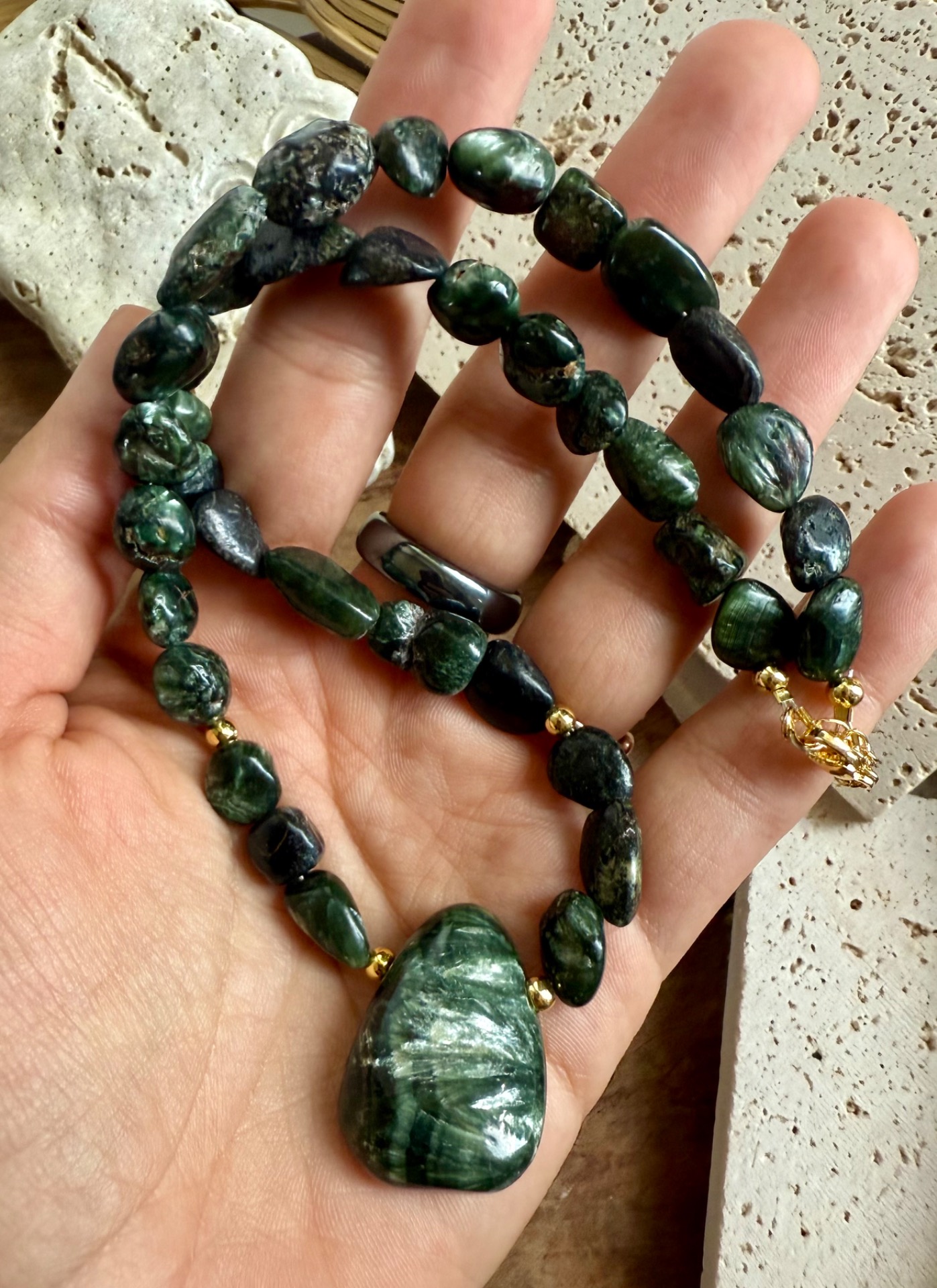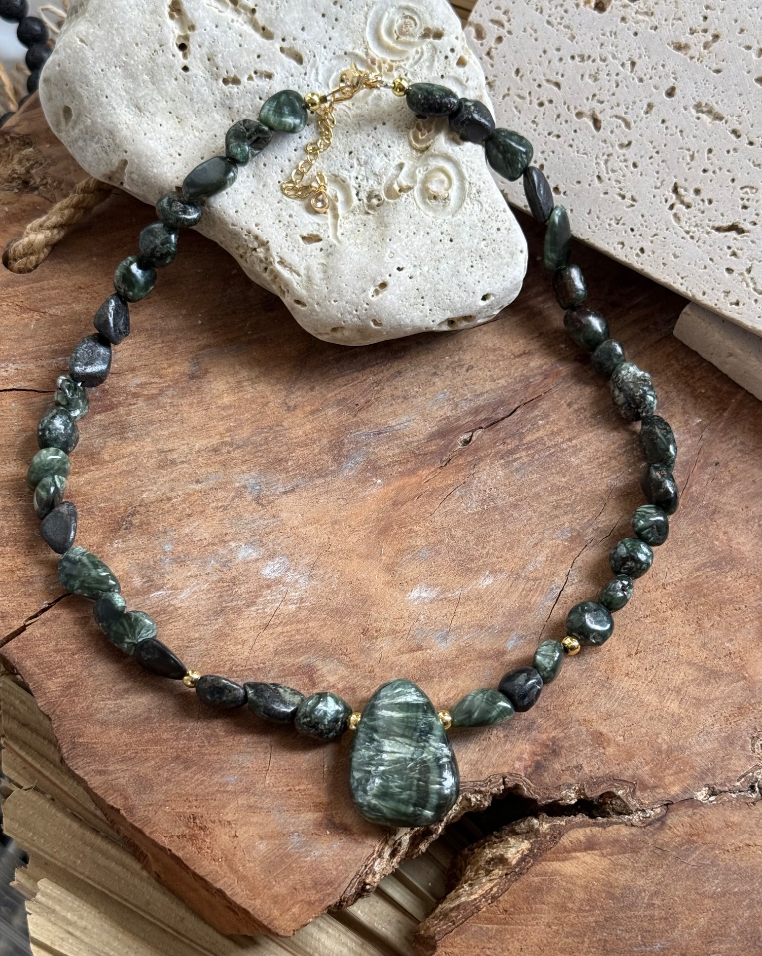 Tento výnimočný náhrdelník z minerálu serafinit v sebe nesie energiu čistoty, harmónie a hlbokého spojenia s anjelskými sférami.