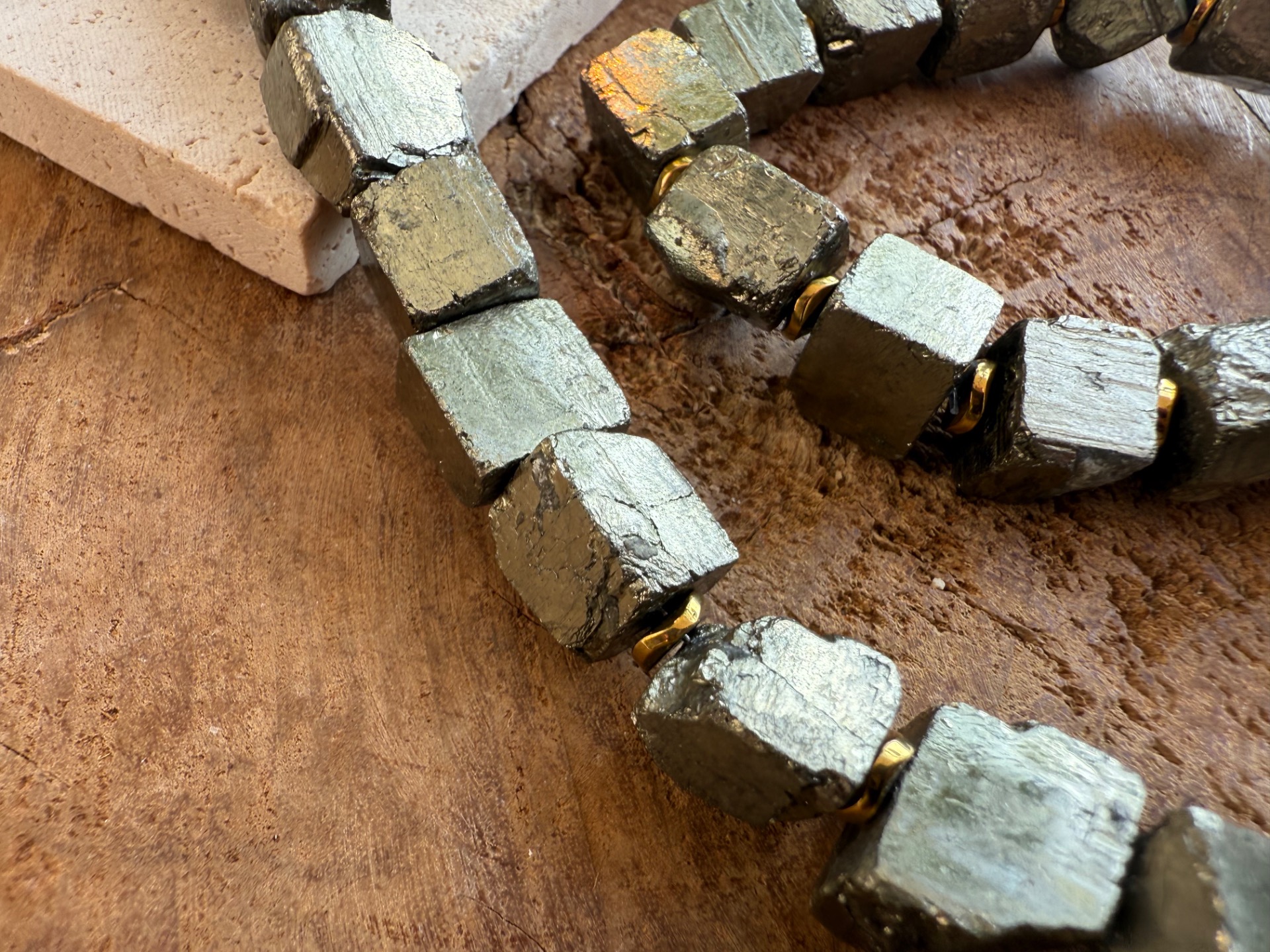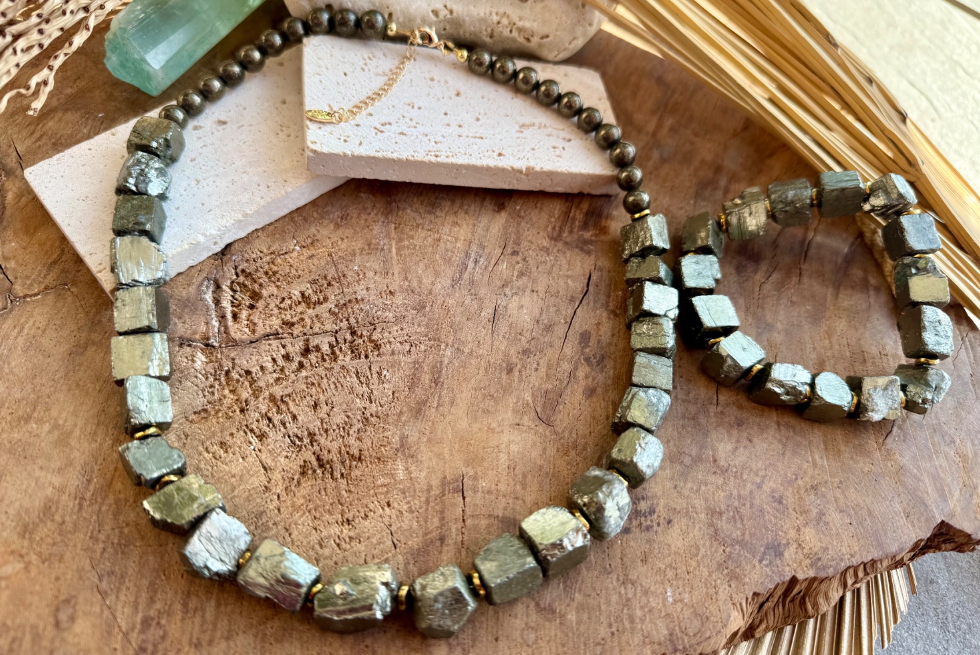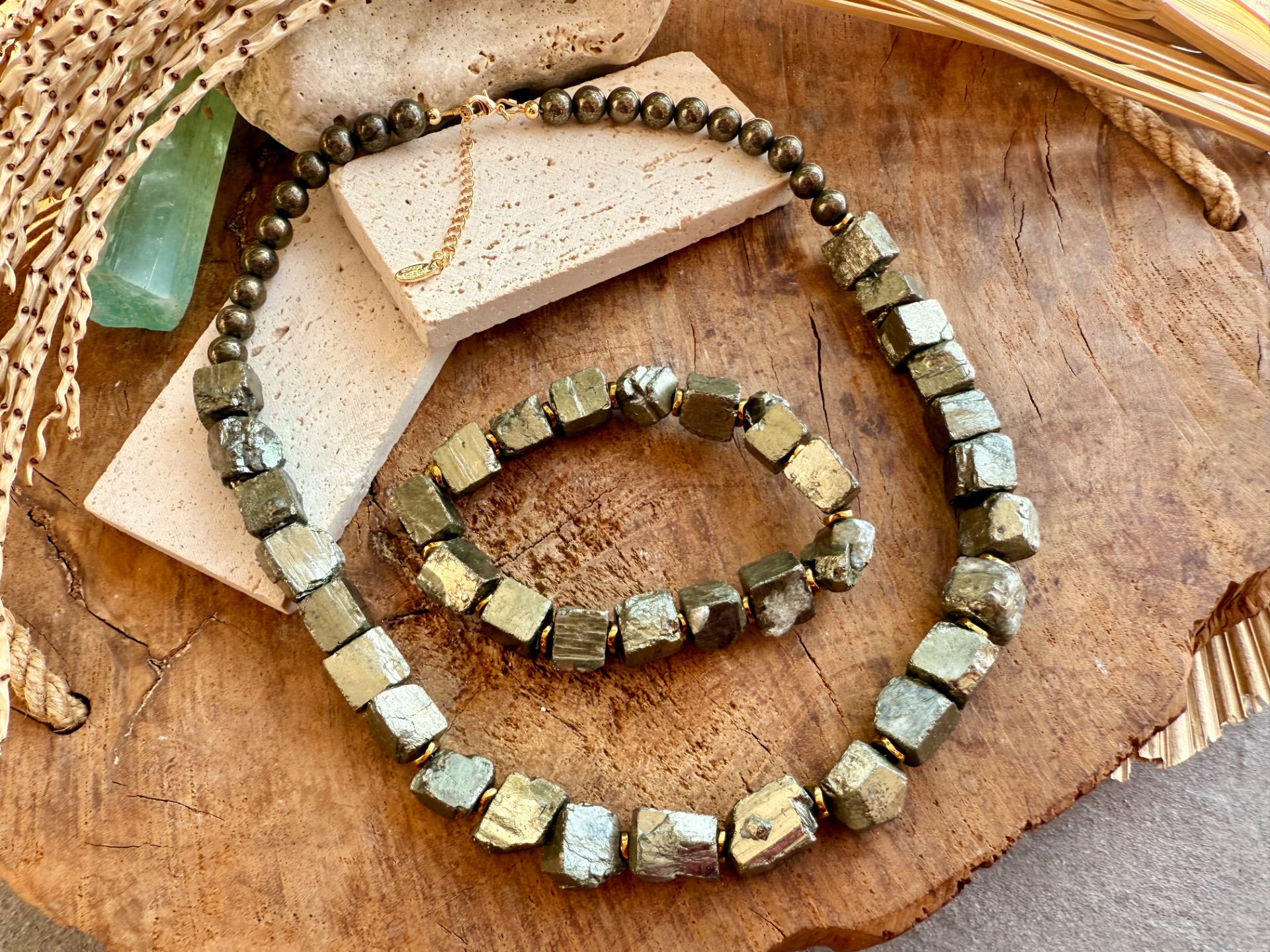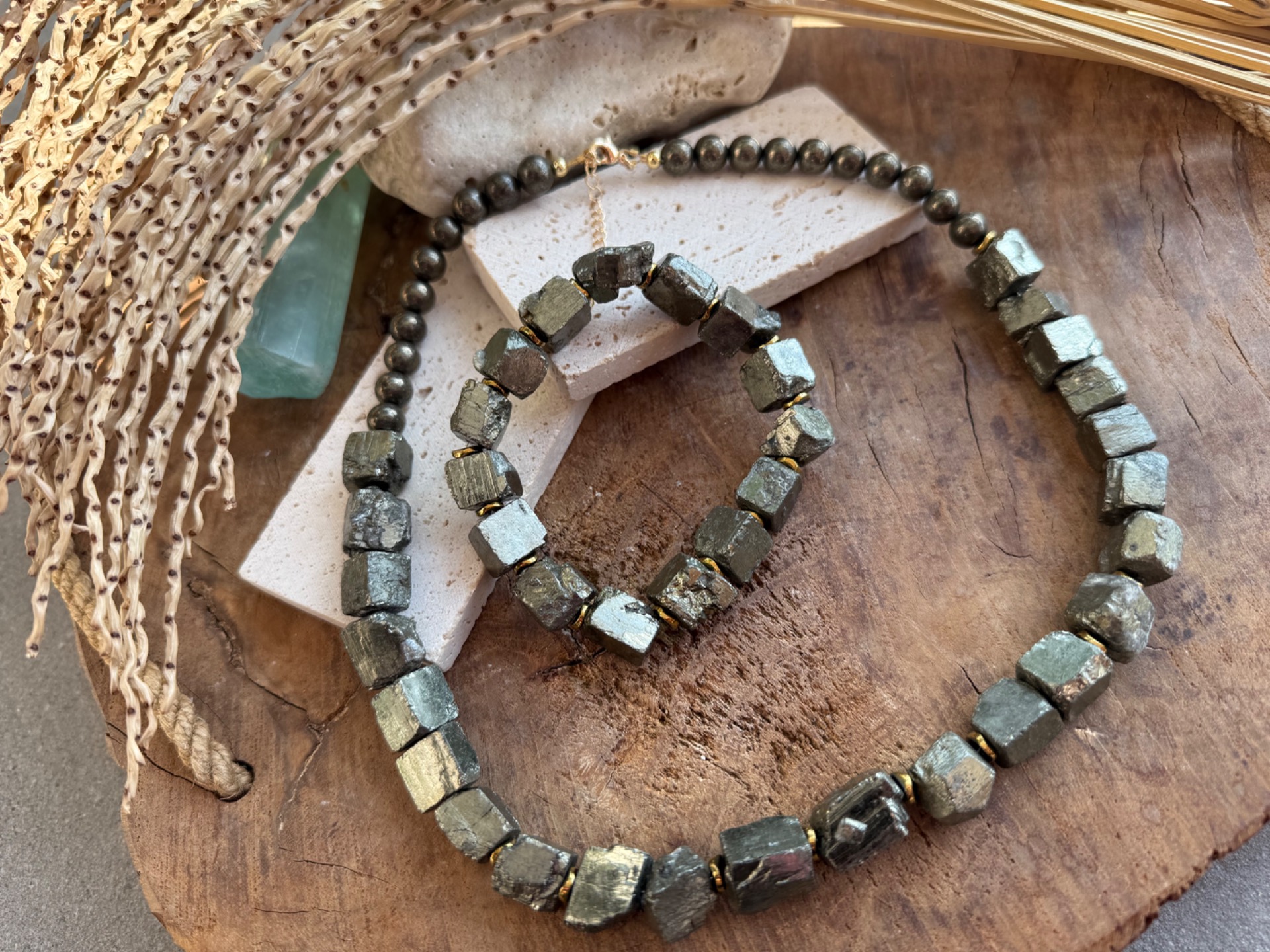 Dominantné pyritové kocky v náhrdelníku dopĺňajú jemné guľôčky pyritu, ktoré celému šperku dodávajú eleganciu a rovnováhu. Náramok je vytvorený z rovnakých surových kociek, takže spolu tvoria harmonický a výrazný set.