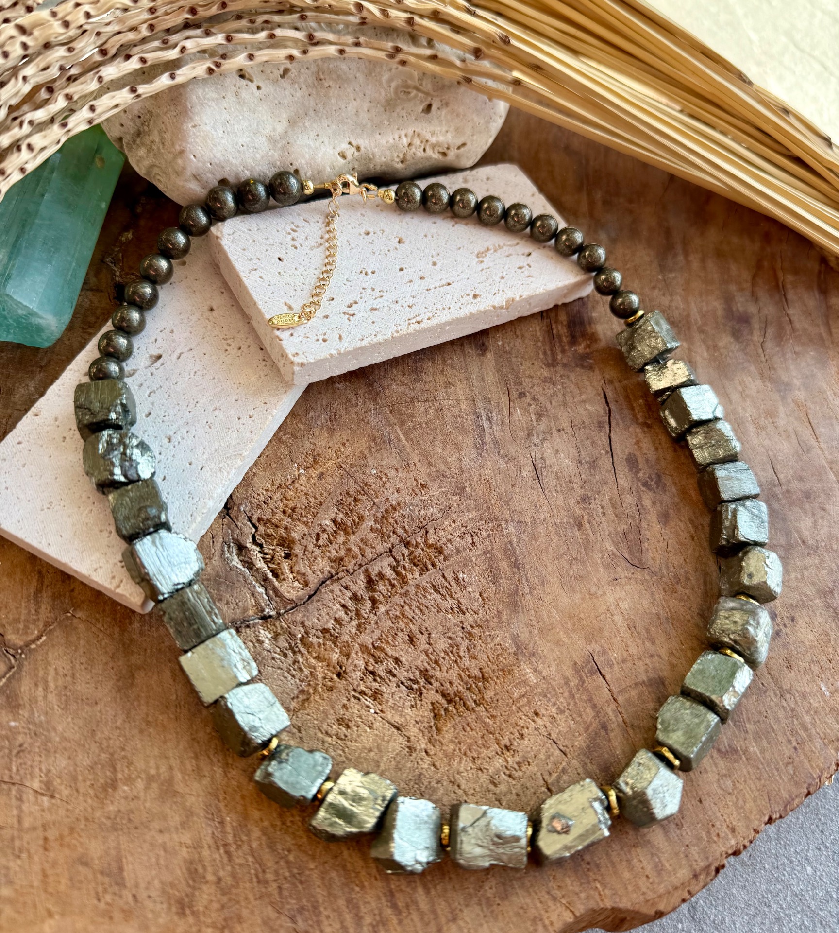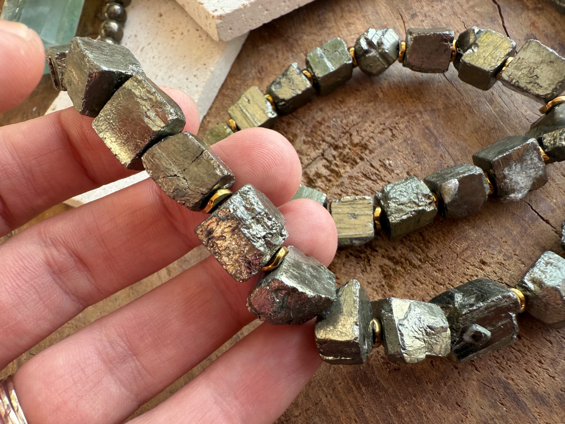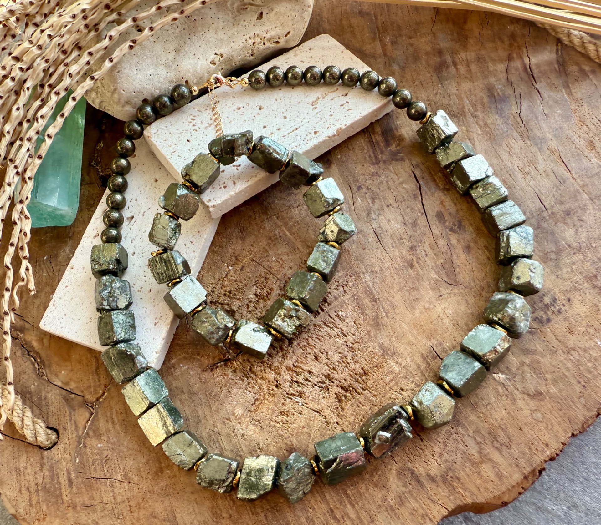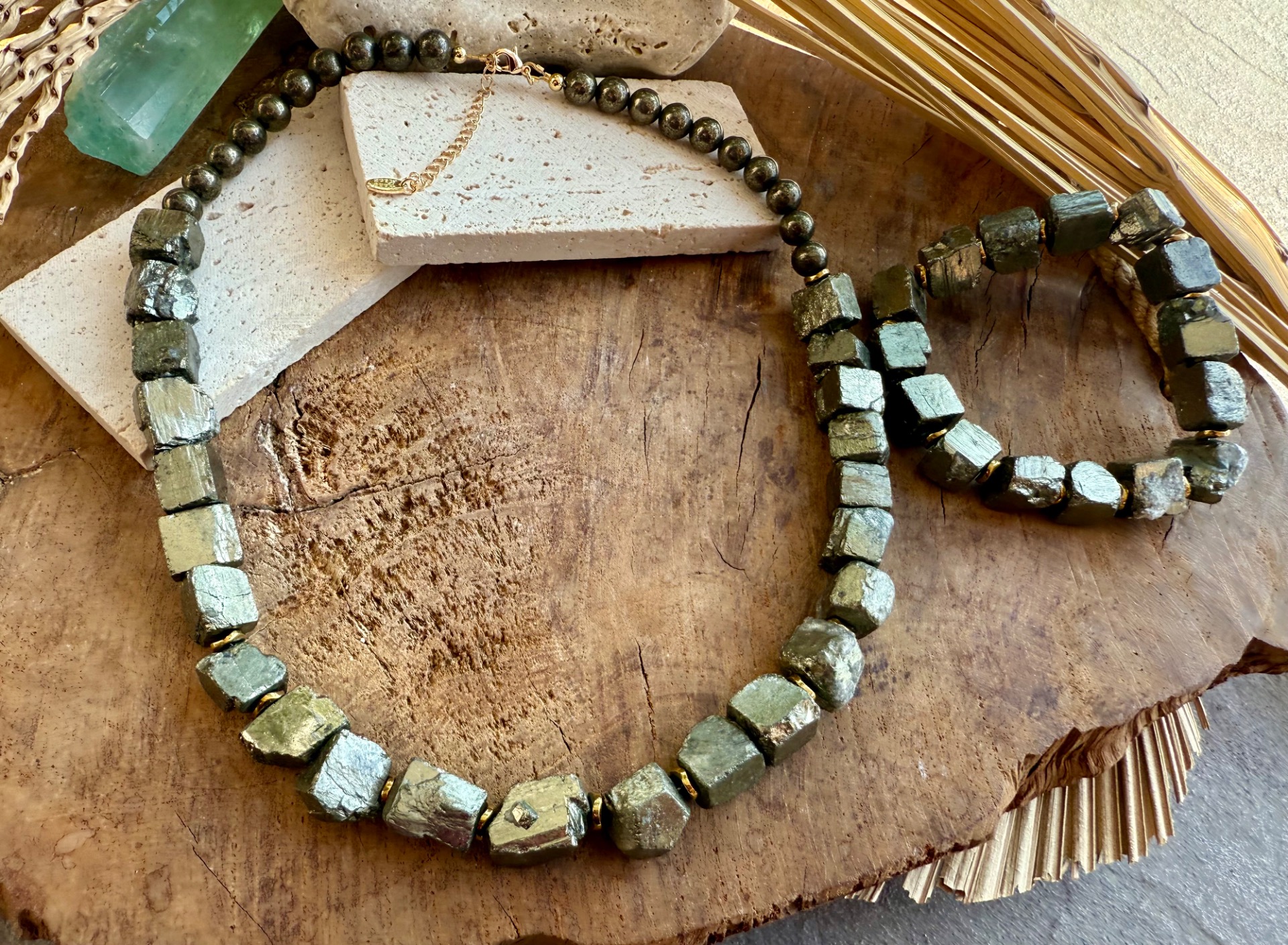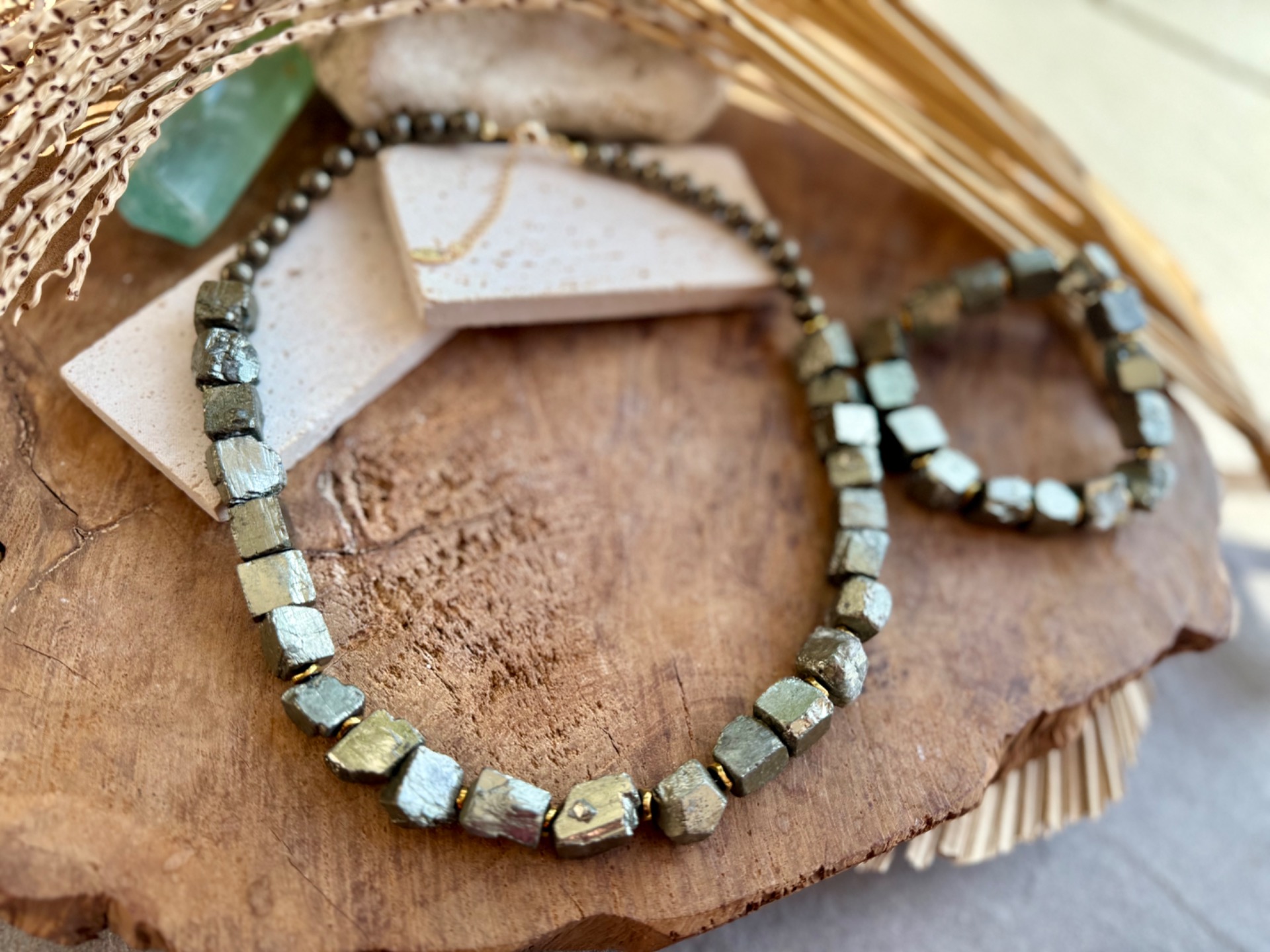 Dominantné pyritové kocky v náhrdelníku dopĺňajú jemné guľôčky pyritu, ktoré celému šperku dodávajú eleganciu a rovnováhu. Náramok je vytvorený z rovnakých surových kociek, takže spolu tvoria harmonický a výrazný set.