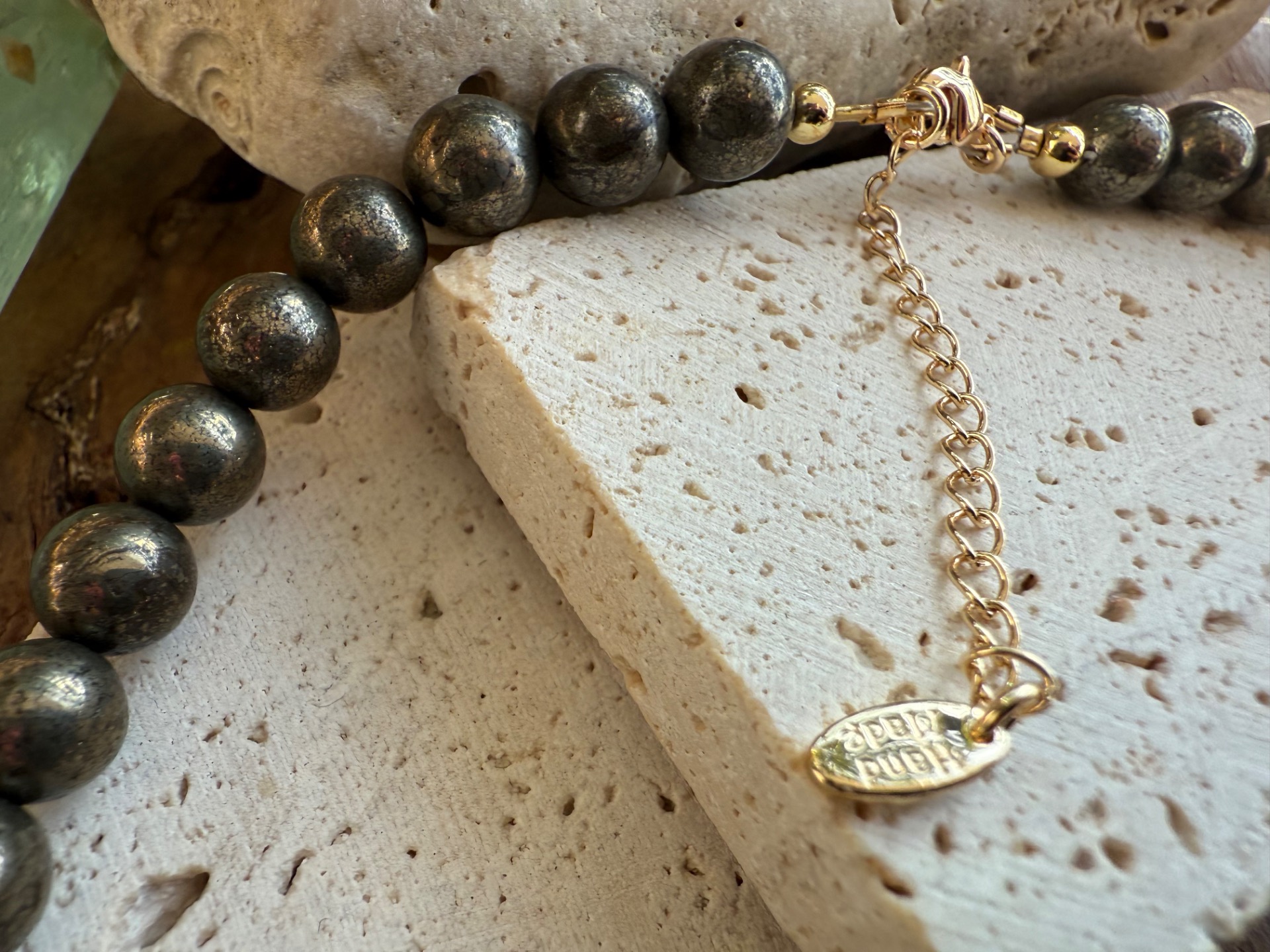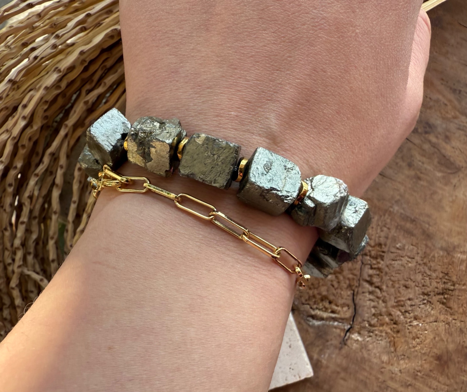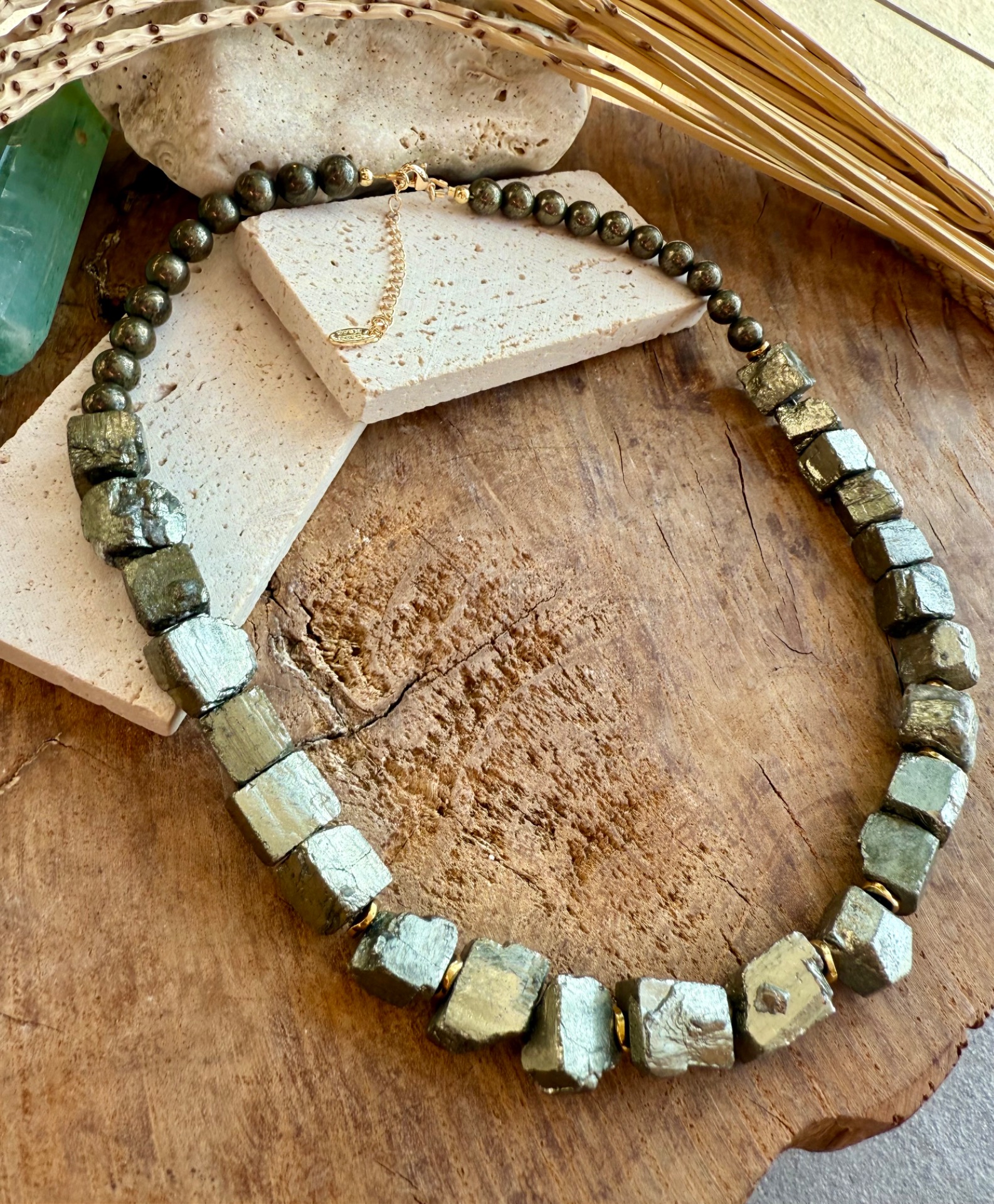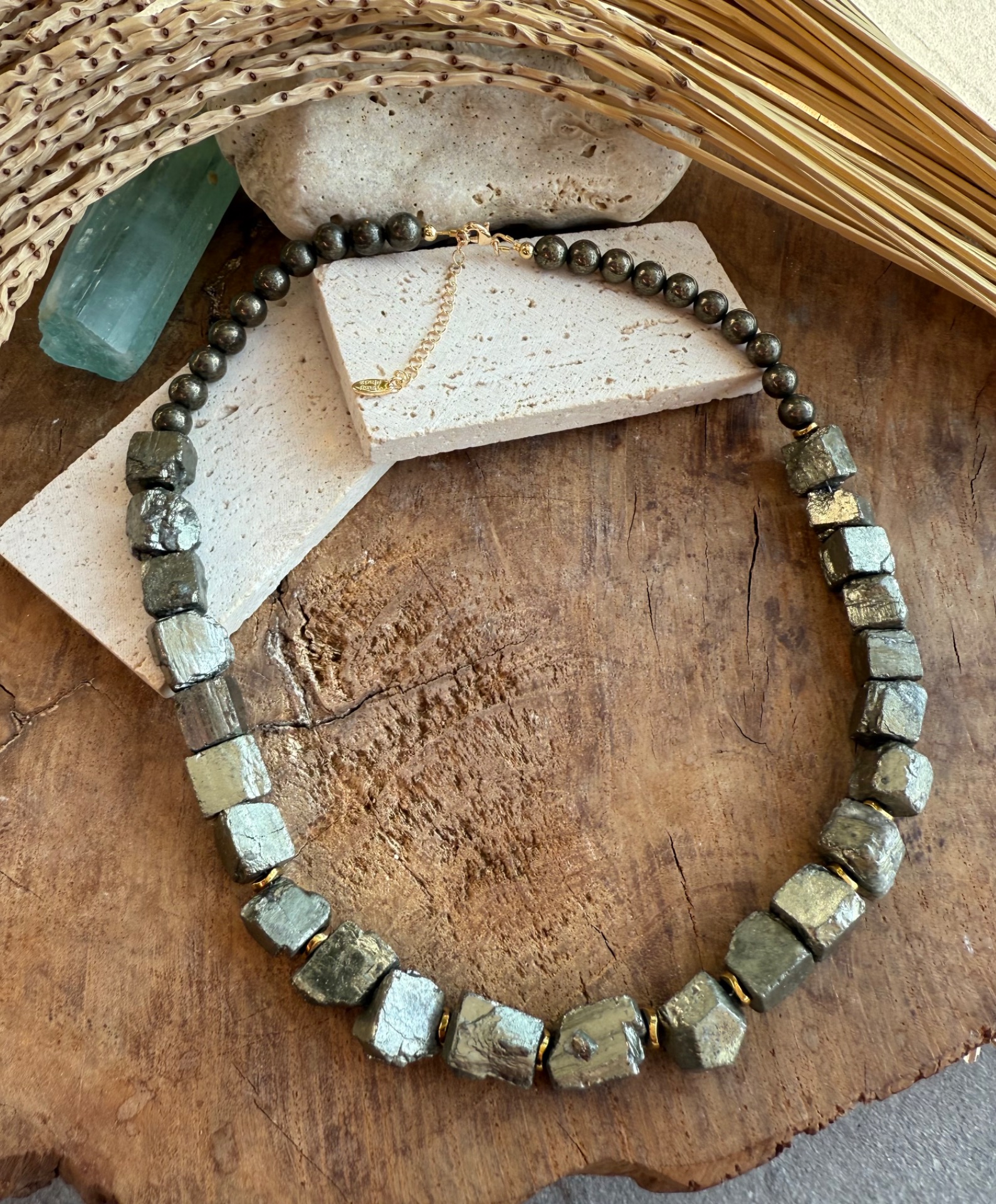 Dominantné pyritové kocky v náhrdelníku dopĺňajú jemné guľôčky pyritu, ktoré celému šperku dodávajú eleganciu a rovnováhu. Náramok je vytvorený z rovnakých surových kociek, takže spolu tvoria harmonický a výrazný set.